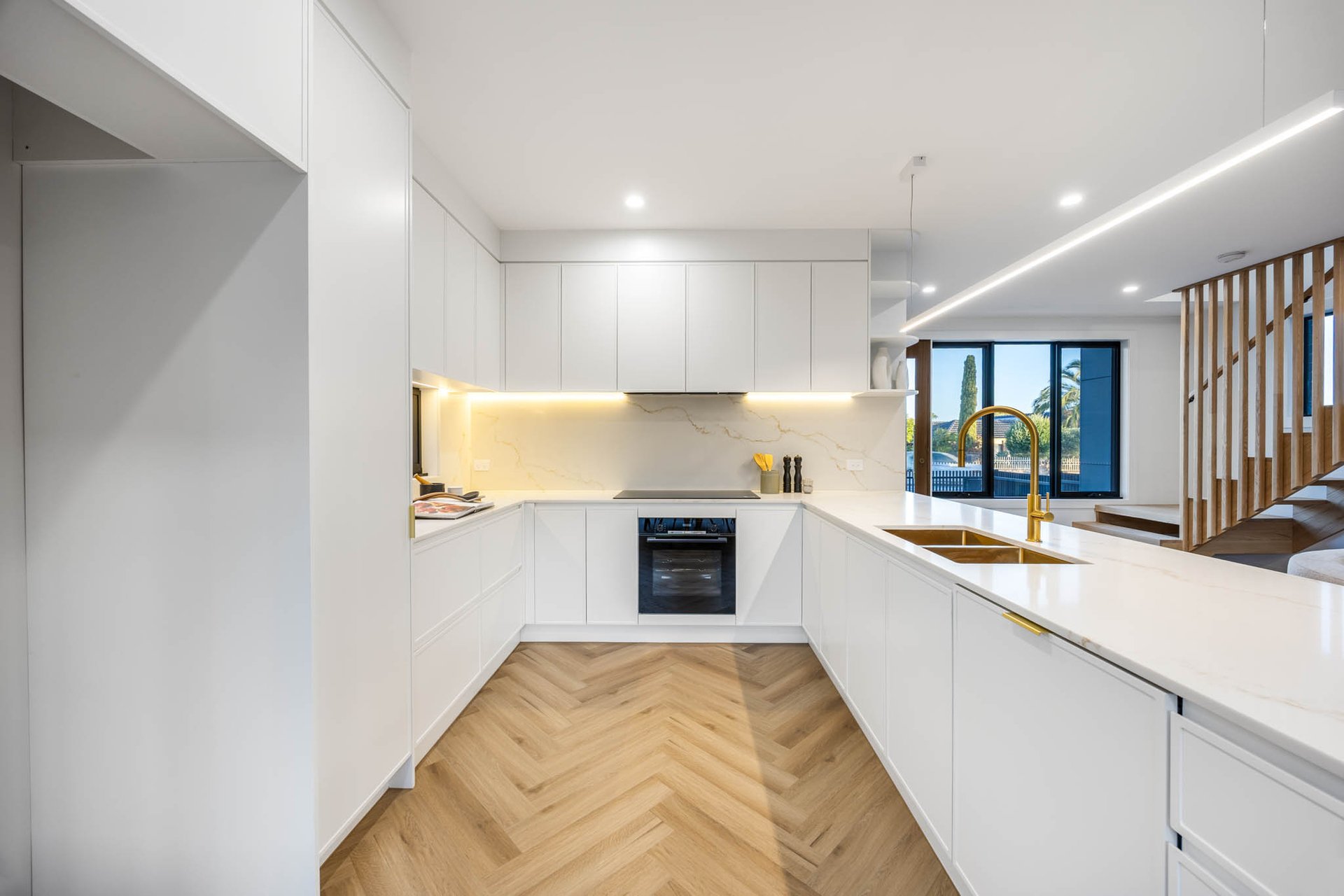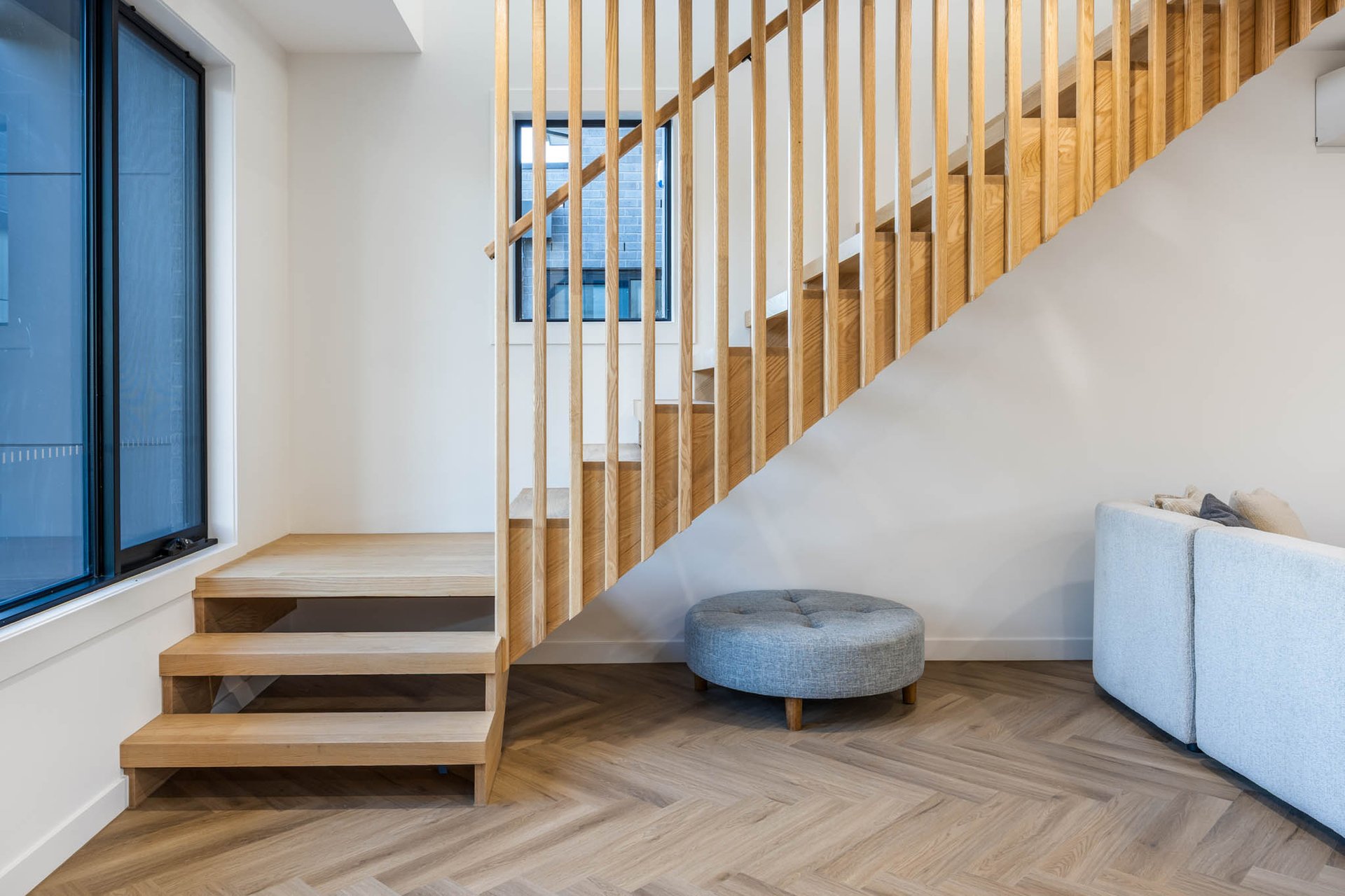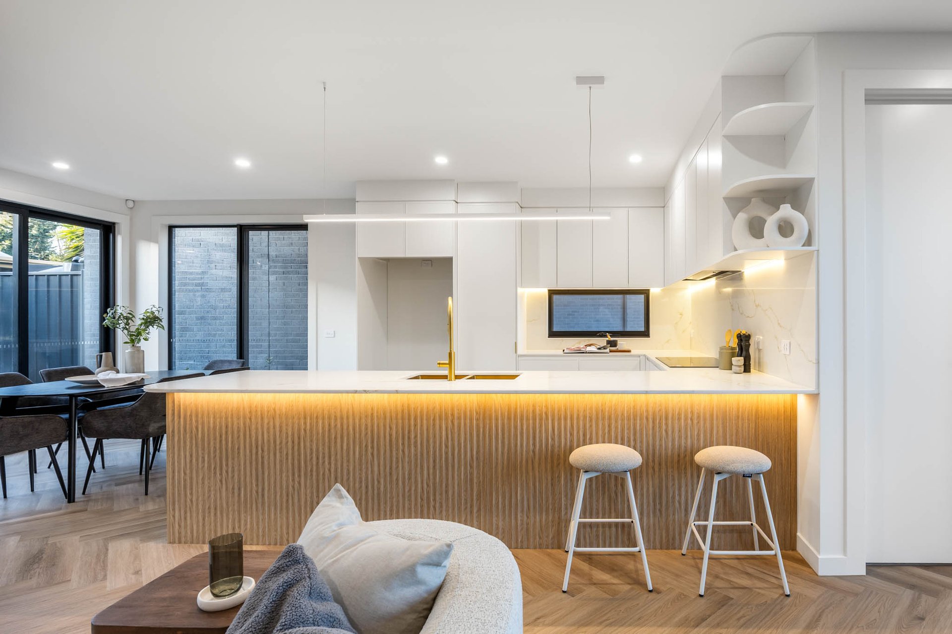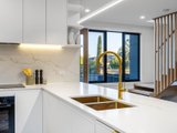 Delivering a luxurious double-storey dwelling of indisputable appeal, this elegant townhouse balances statement finishes with effortless liveability. Rich herringbone flooring sets an elegant tone through the ground level, where a slatted timber staircase rouses sculptural punctuation to airy, connected spaces.