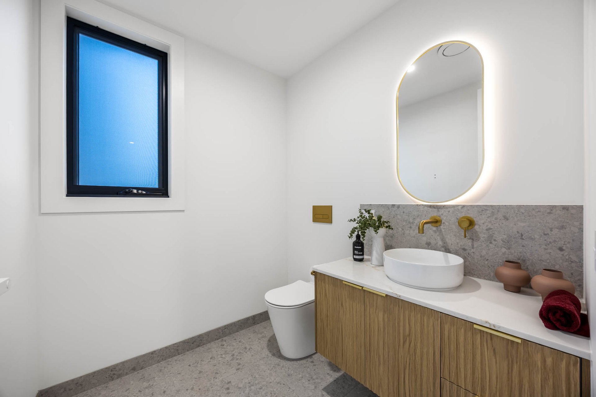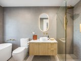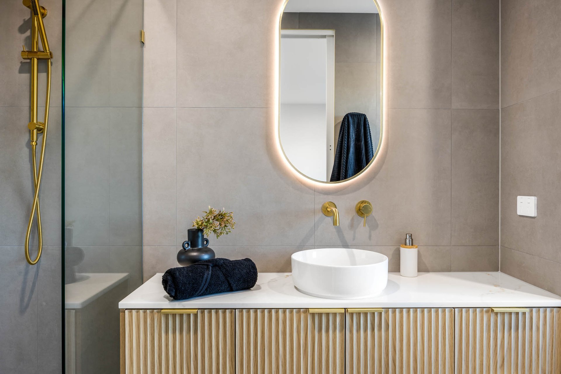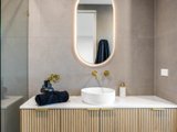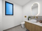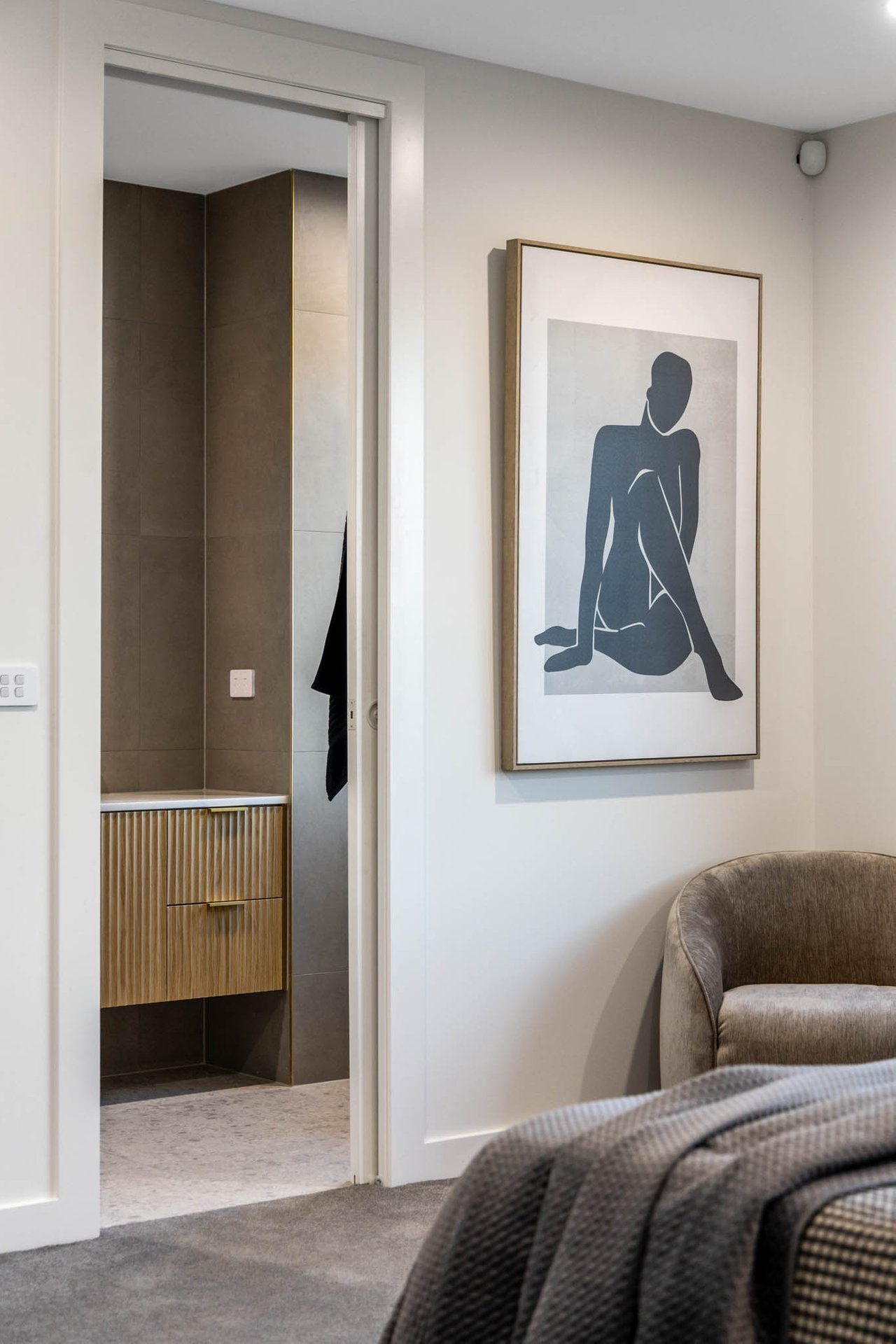 Upstairs, accommodation is thoughtfully curated: 3 bedrooms each boast walk-in robes, while the main suite is complemented by a luxe ensuite. Luxurious bathrooms elevate the experience with stone-topped vanities, backlit mirrors, gold trims, and a frameless glass shower; the central bathroom adds a sculptural fluted bath for spa-like indulgence, while a powder room enhances practicality on the lower level.