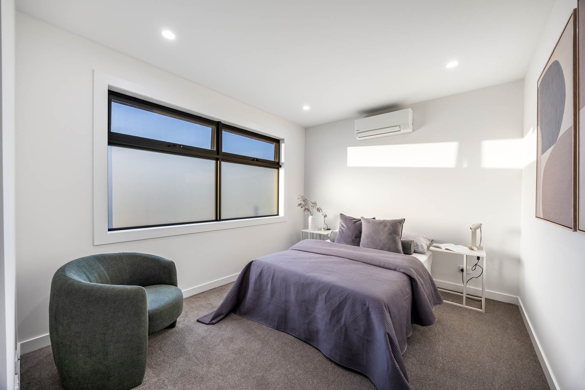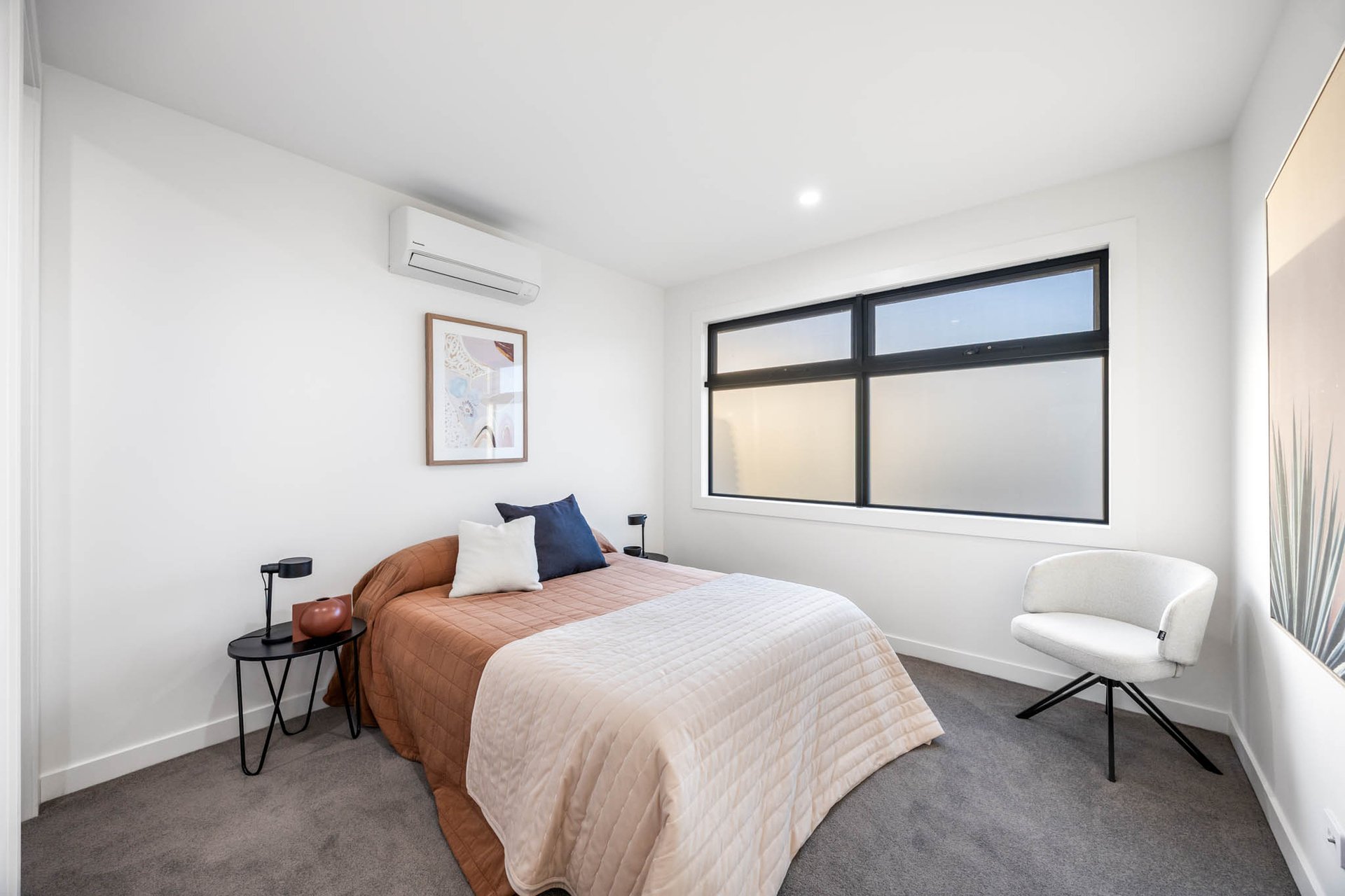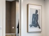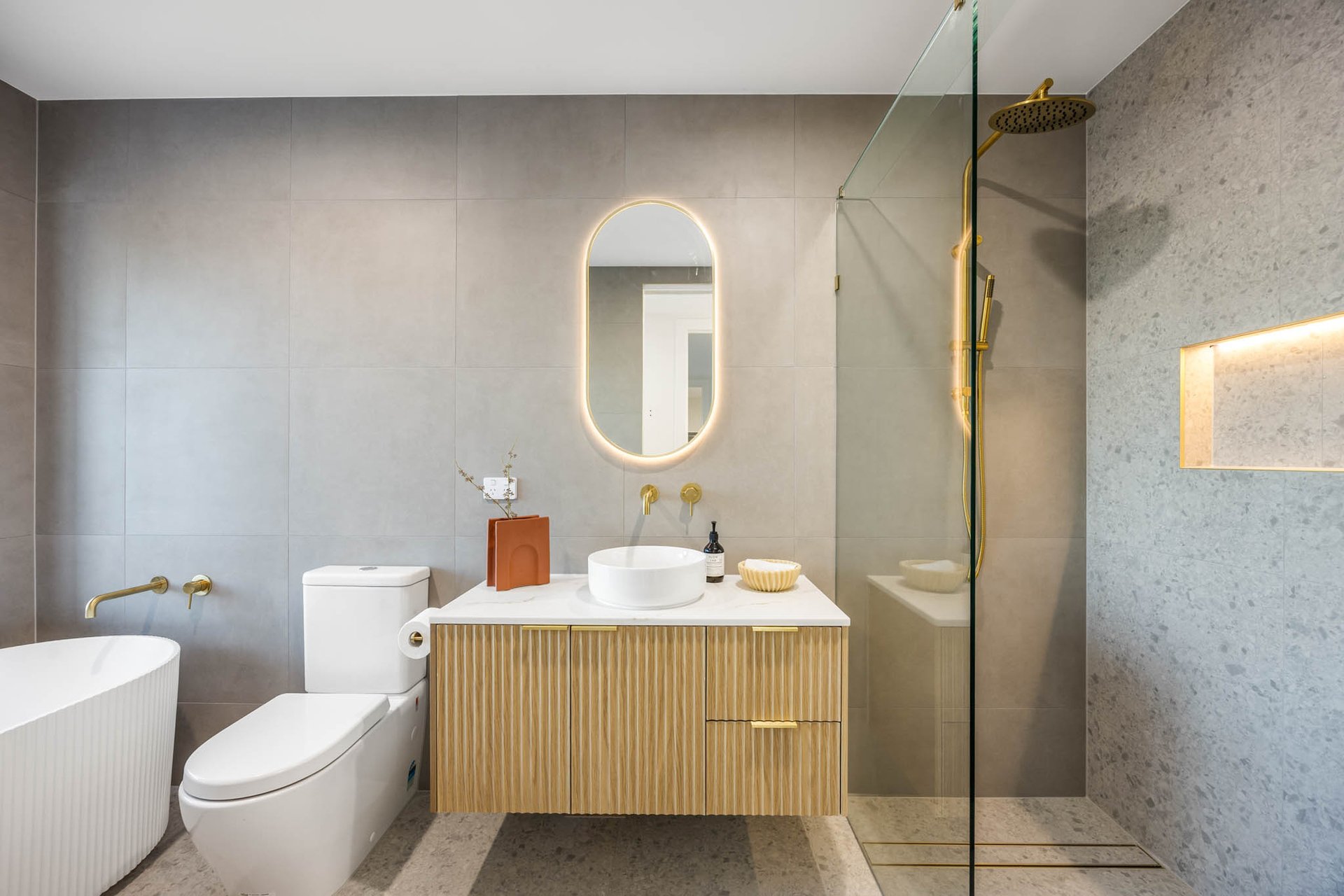 Upstairs, accommodation is thoughtfully curated: 3 bedrooms each boast walk-in robes, while the main suite is complemented by a luxe ensuite. Luxurious bathrooms elevate the experience with stone-topped vanities, backlit mirrors, gold trims, and a frameless glass shower; the central bathroom adds a sculptural fluted bath for spa-like indulgence, while a powder room enhances practicality on the lower level.