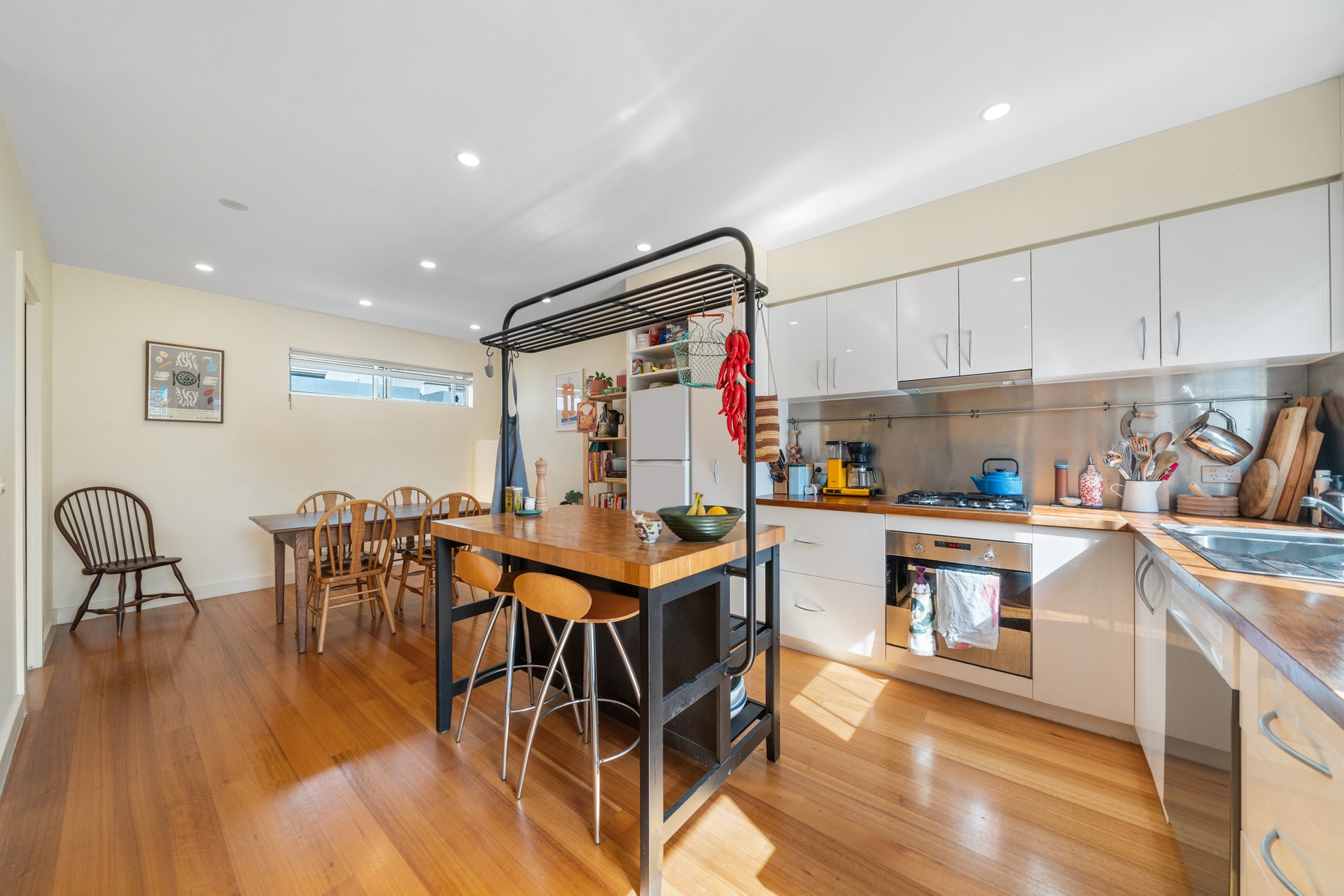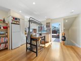 Upstairs is the true standout. A light-filled, architecturally designed kitchen with timber benchtops and quality appliances flows seamlessly into a dining or second living zone, opening onto a private north-facing terrace with elevated Carlton views. This indoor-outdoor connection is a major lifestyle feature and a strong drawcard for tenants.