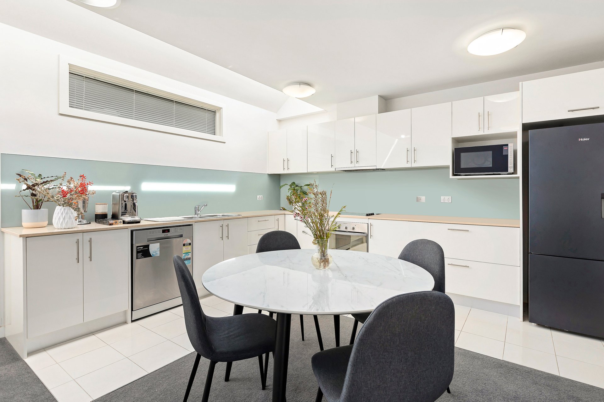 Set across two thoughtfully planned levels, the open-plan living and dining zone flows effortlessly to a sun-drenched south-facing courtyard—ideal for relaxing or entertaining. The sleek stone-topped kitchen features quality stainless steel appliances and clean, modern finishes that complement the home’s contemporary style.