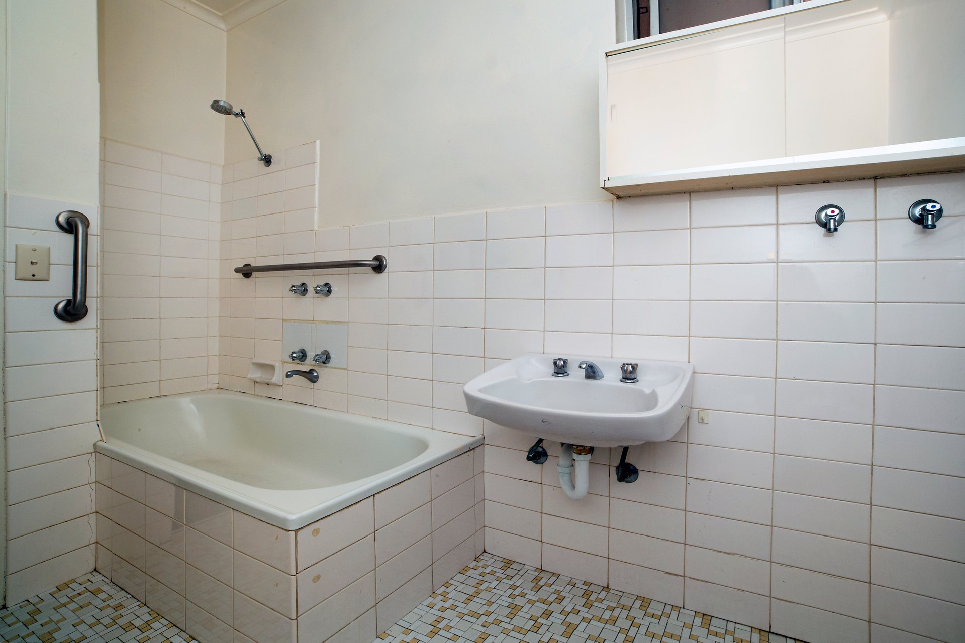 - Classic bathroom with shower over bath and washing machine facilities