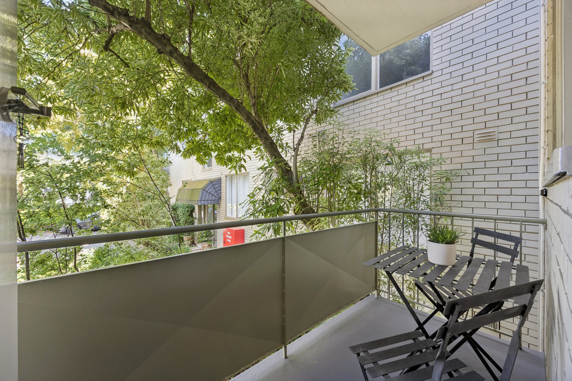 The entry leads to a comfortable living room that opens to a covered balcony edged with greenery. It's usable in all seasons, and it's private enough that you're not overlooking anyone or being overlooked. The kitchen includes a freestanding stove, with the meals area integrated into the same zone so everything flows easily.