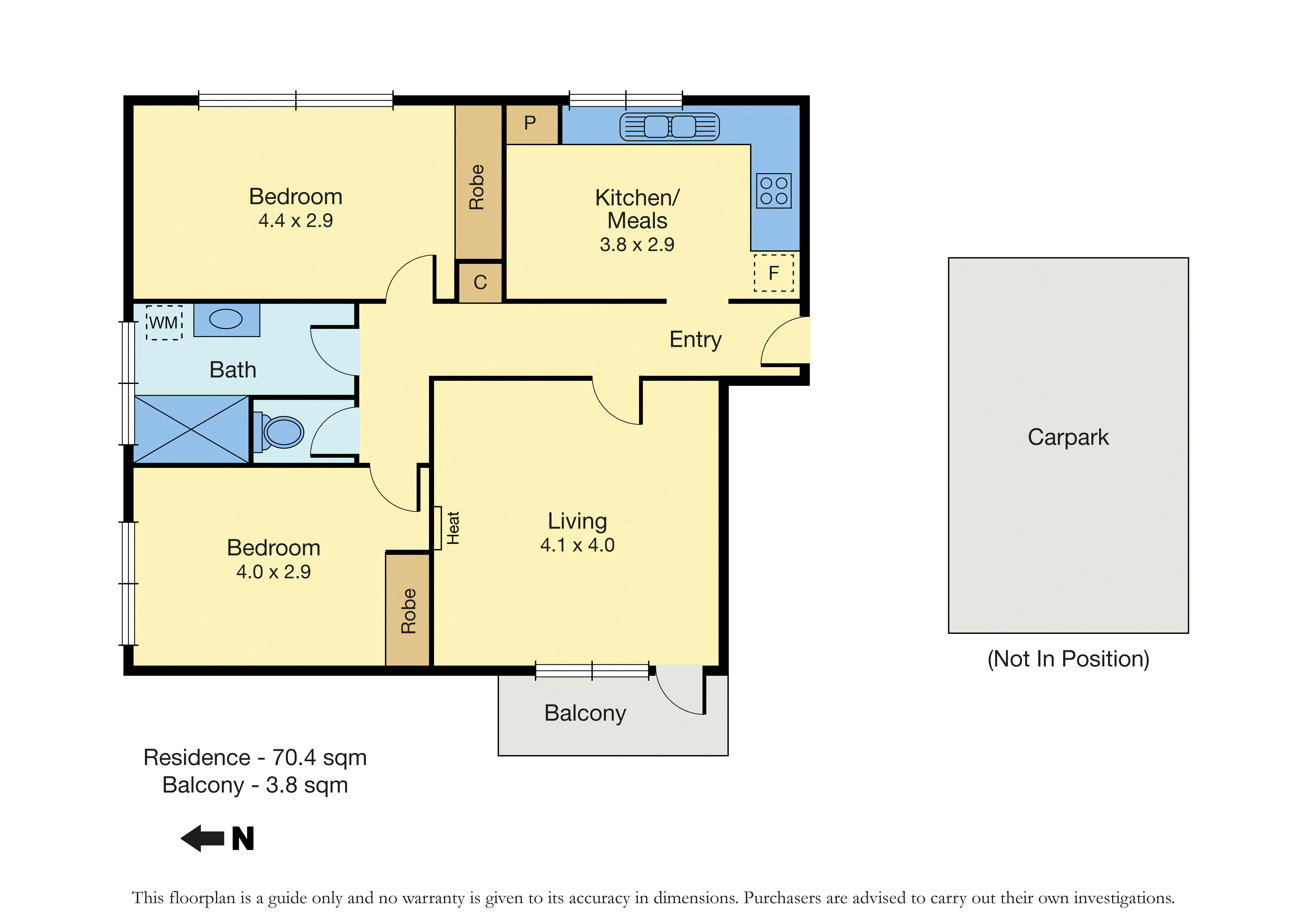 Both bedrooms sit toward the back, each fitted with built-in robes and placed on either side of the bathroom that features washing machine taps. The ground-floor position keeps everything accessible, and the inclusion of a car space is an added benefit.