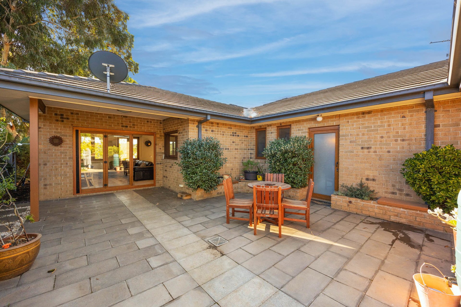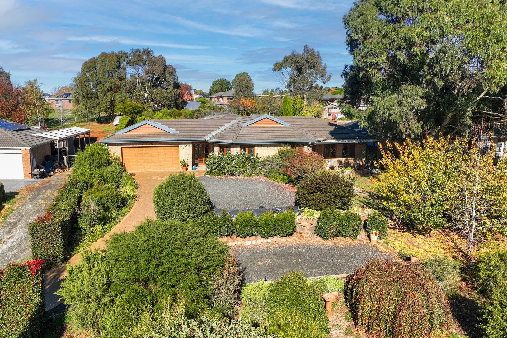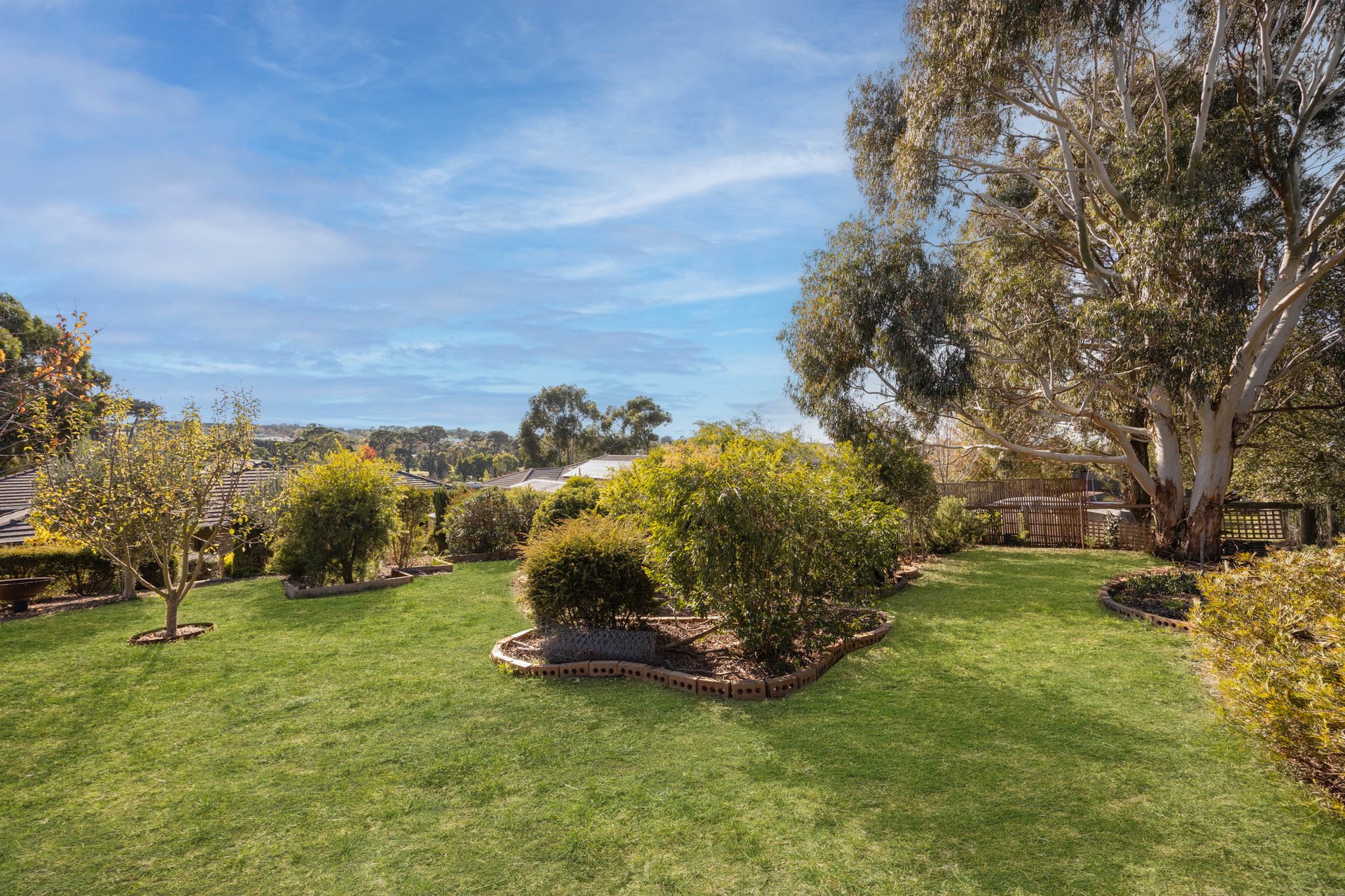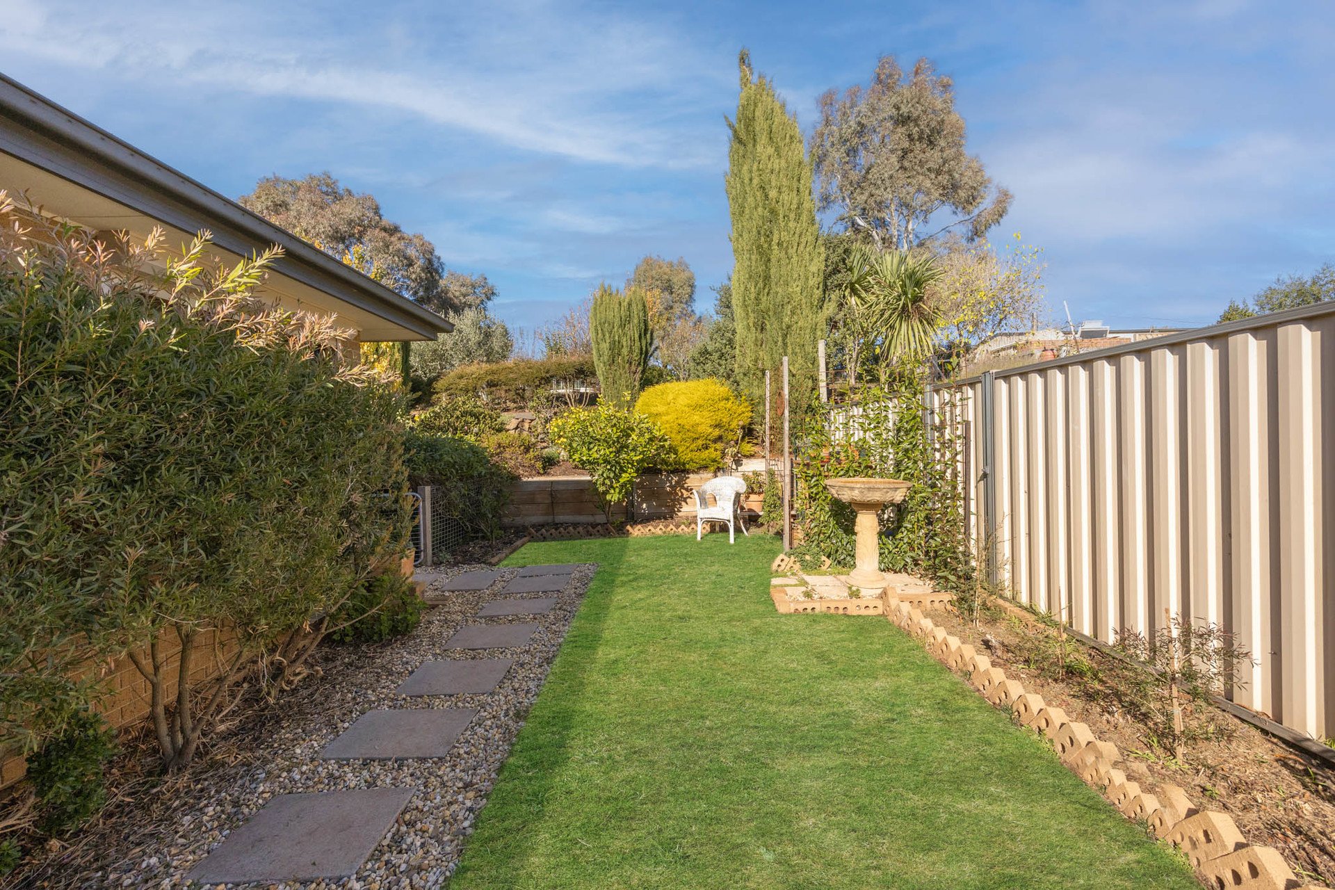 The garden's composition is a standout, with tiered landscaping creating a peaceful, low-maintenance haven of roses, seasonal blooms, pine, conifer and olive trees, a fire pit area, trellised mini pergola, birdbath, and a mini orchard, all nestled into a backdrop of mature hedging.