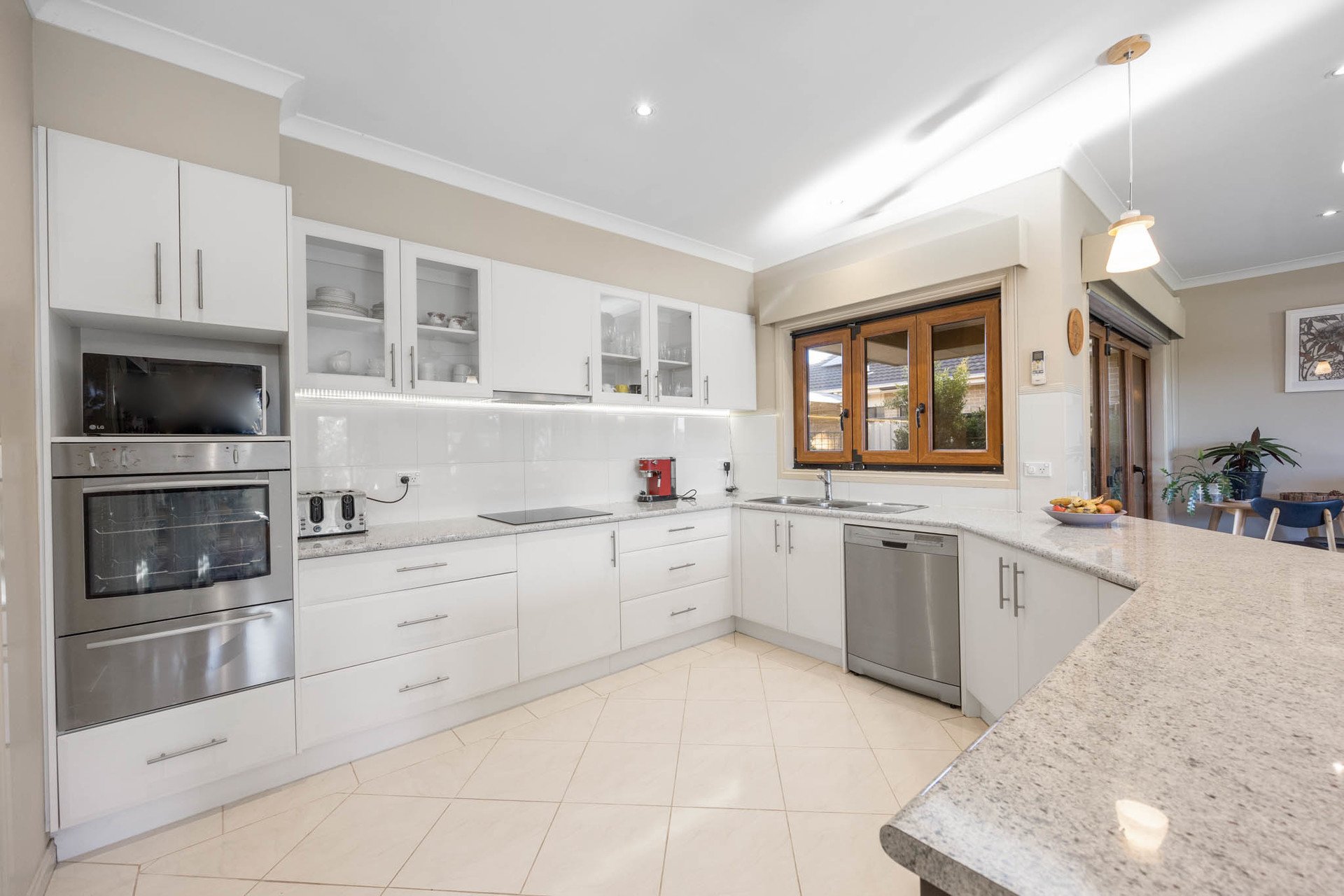 Oriented to the north to maximise natural light, the home gently unfolds from an inviting entry portico to lounge, living, and meals areas-serviced by a spacious kitchen showcasing bullnose benchtops, white cabinetry, and a generous walk-in pantry, alongside a Westinghouse wall oven and grill, induction cooktop, and a dishwasher. Seamless indoor-outdoor entertaining is supported by concertina doors to the alfresco, and a smart kitchen servery window connecting directly to the paved outdoor domain.