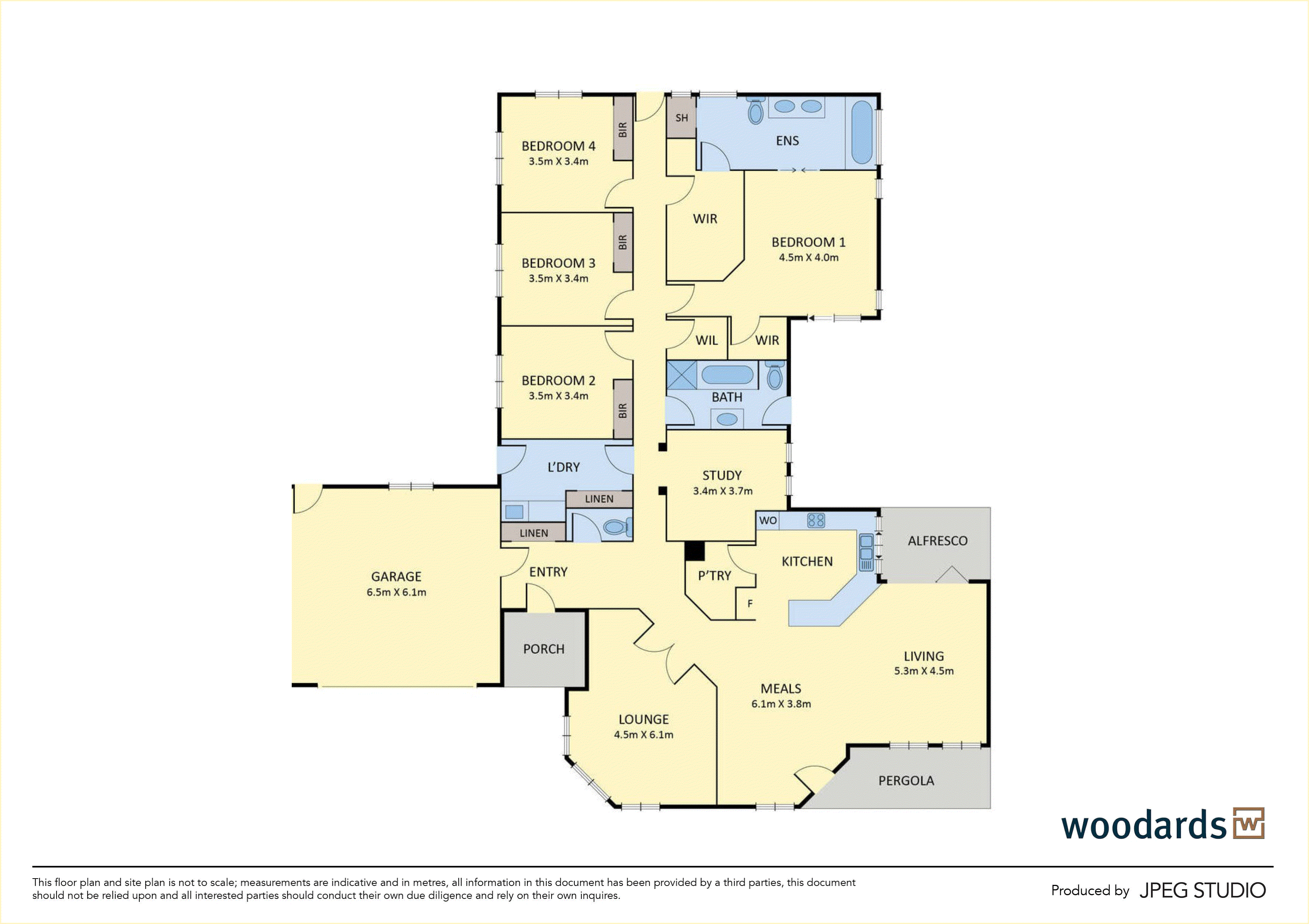 Accommodation comprises four oversized bedrooms-three with mirrored built-in robes, while the main suite enjoys private courtyard access, a walk-in robe and dressing room, and a luxurious ensuite featuring a spa bath, double vanity, and a shower. A central bathroom with both a bath and shower, a spacious home office, and a powder room complete the floorplan.