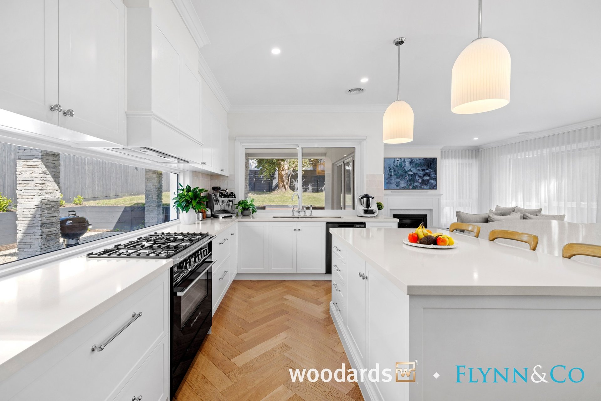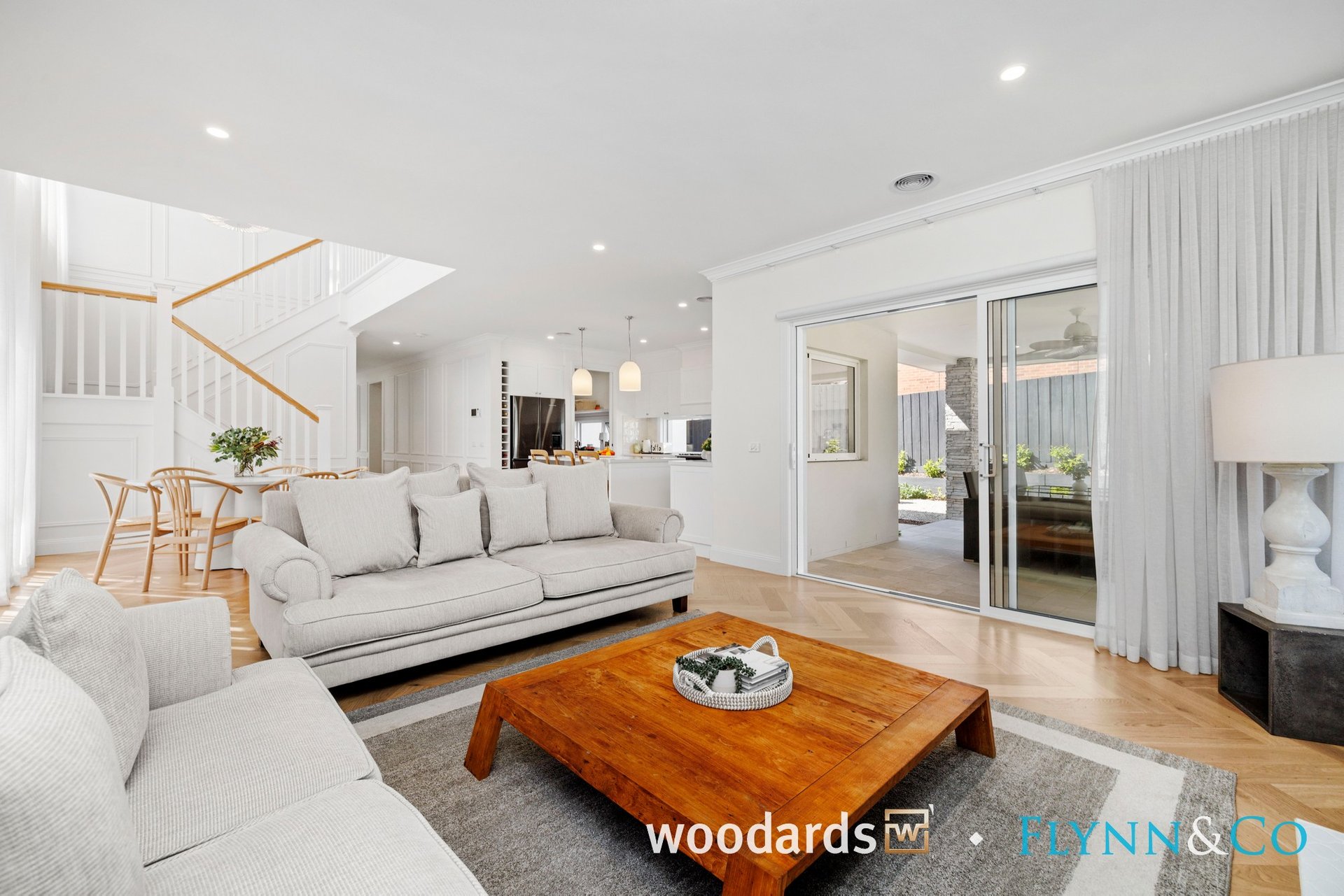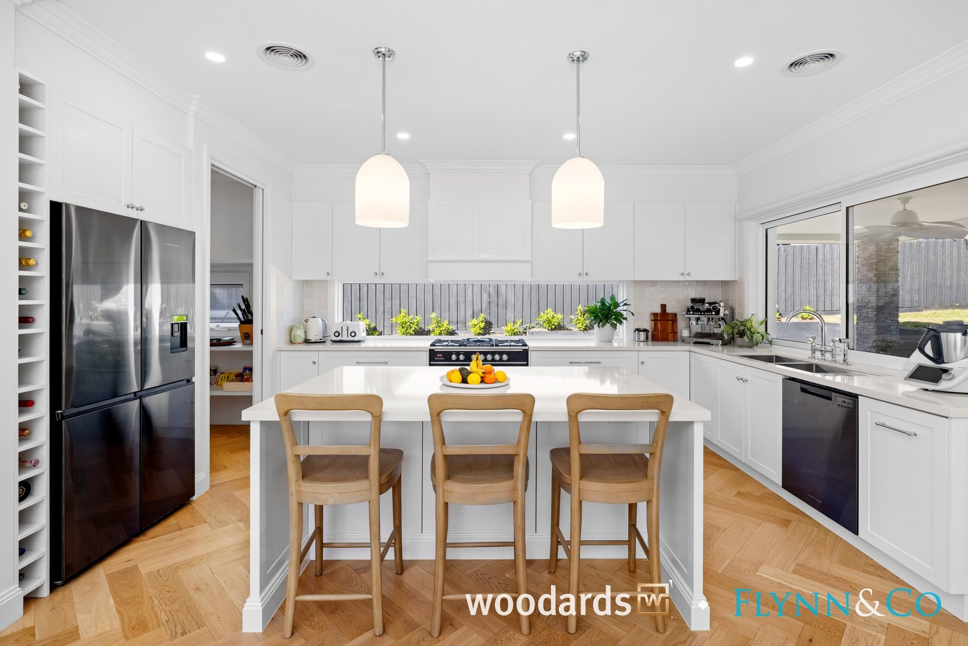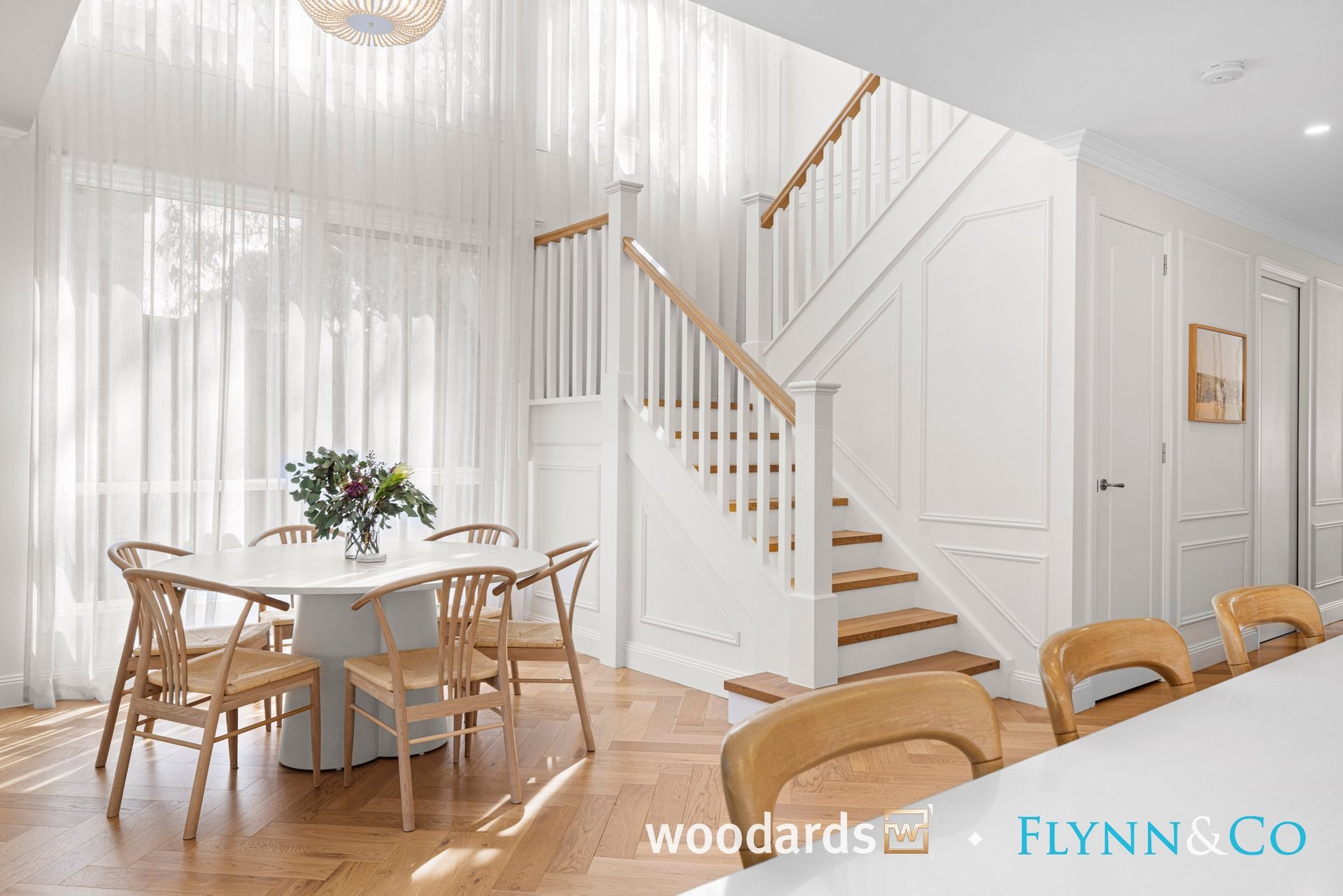 With its Hamptons-inspired façade, landscaped gardens and grand entry, the home sets an elegant tone from the outset. Inside, soaring ceilings, herringbone floors, wainscoting, beautiful sheer curtains and abundant natural light create interiors that are as warm as they are sophisticated.