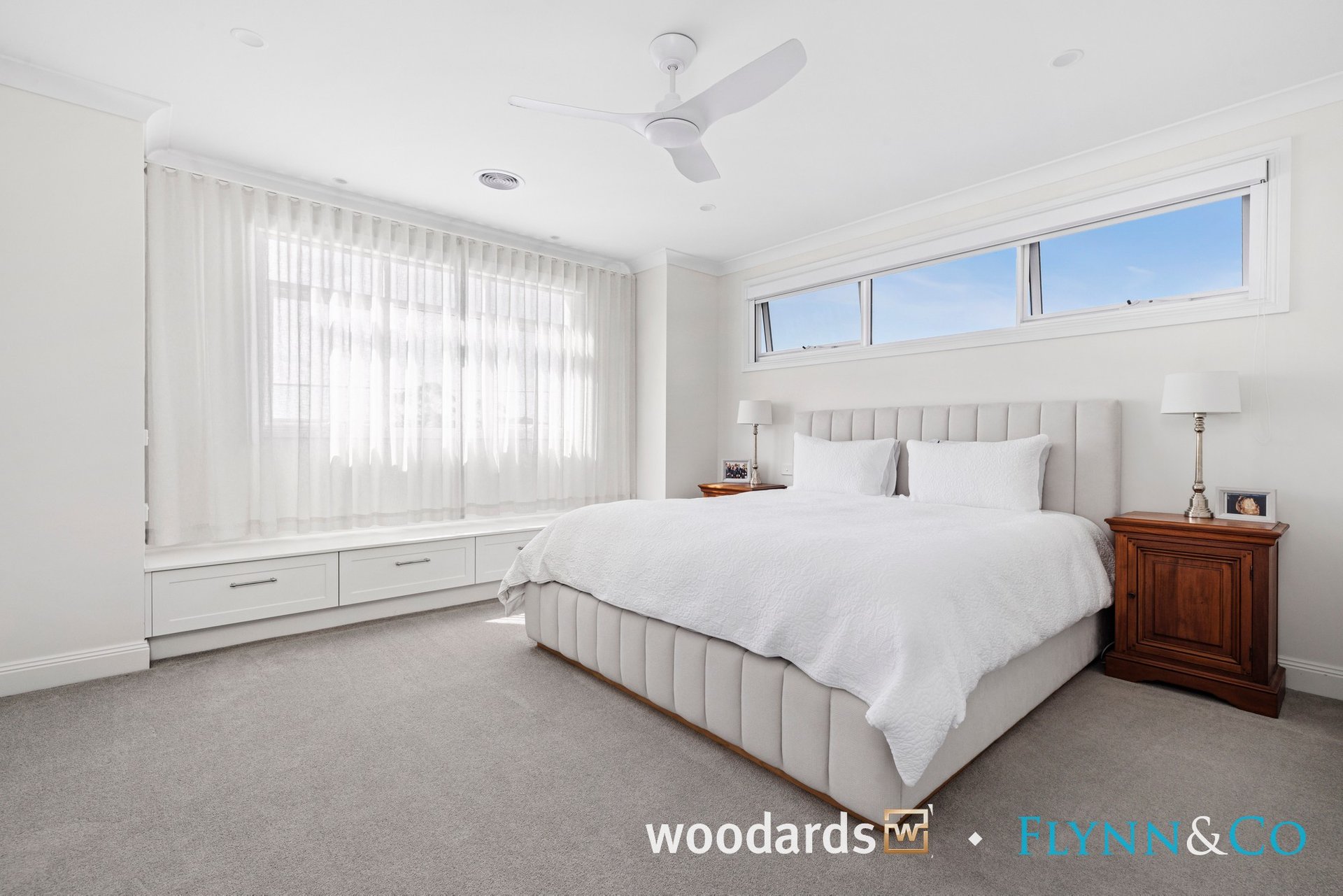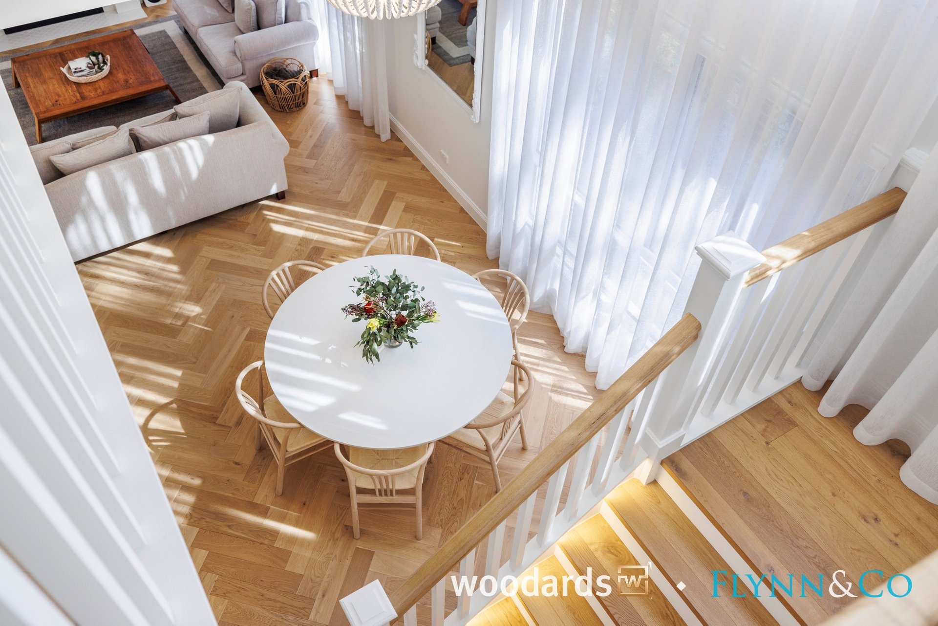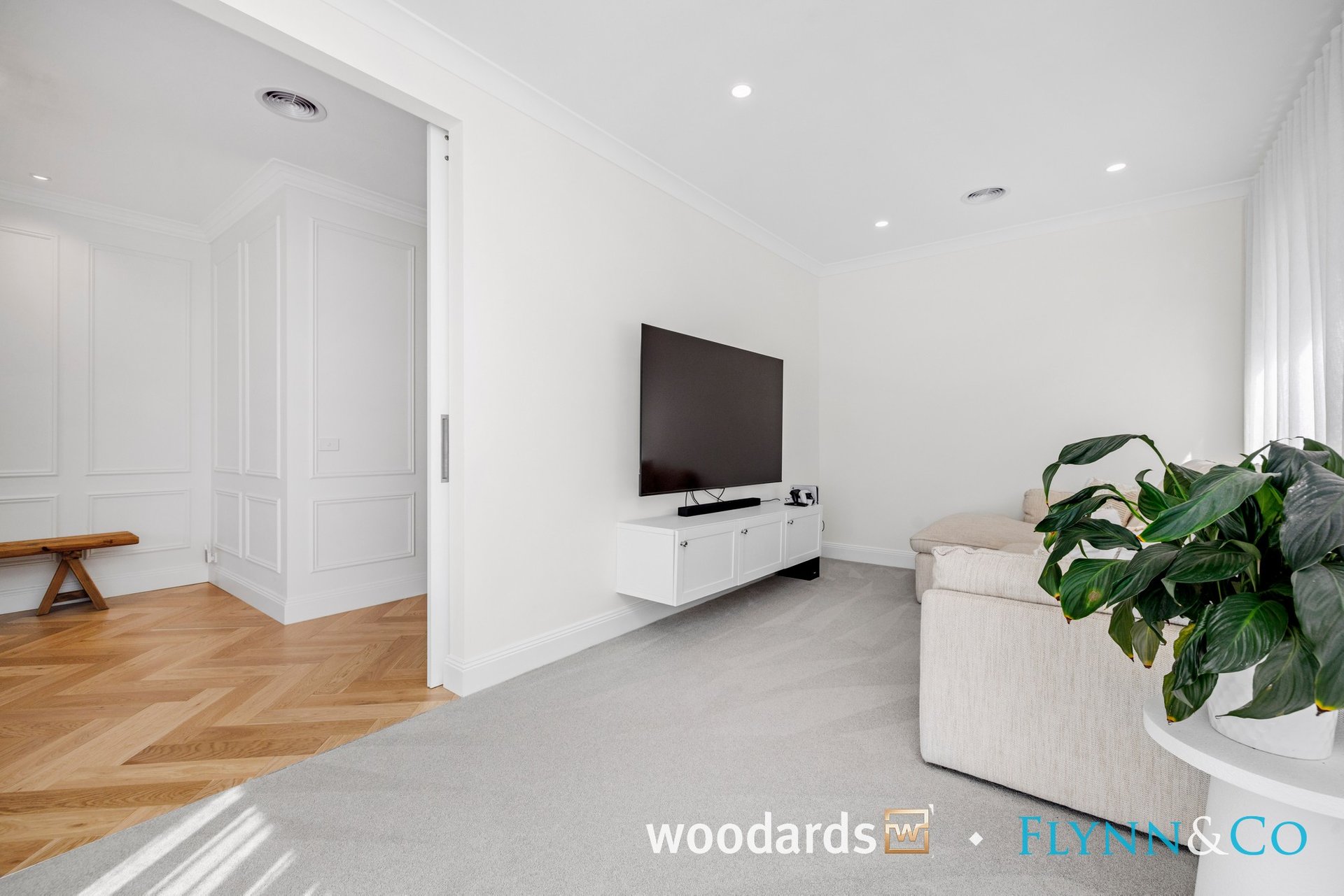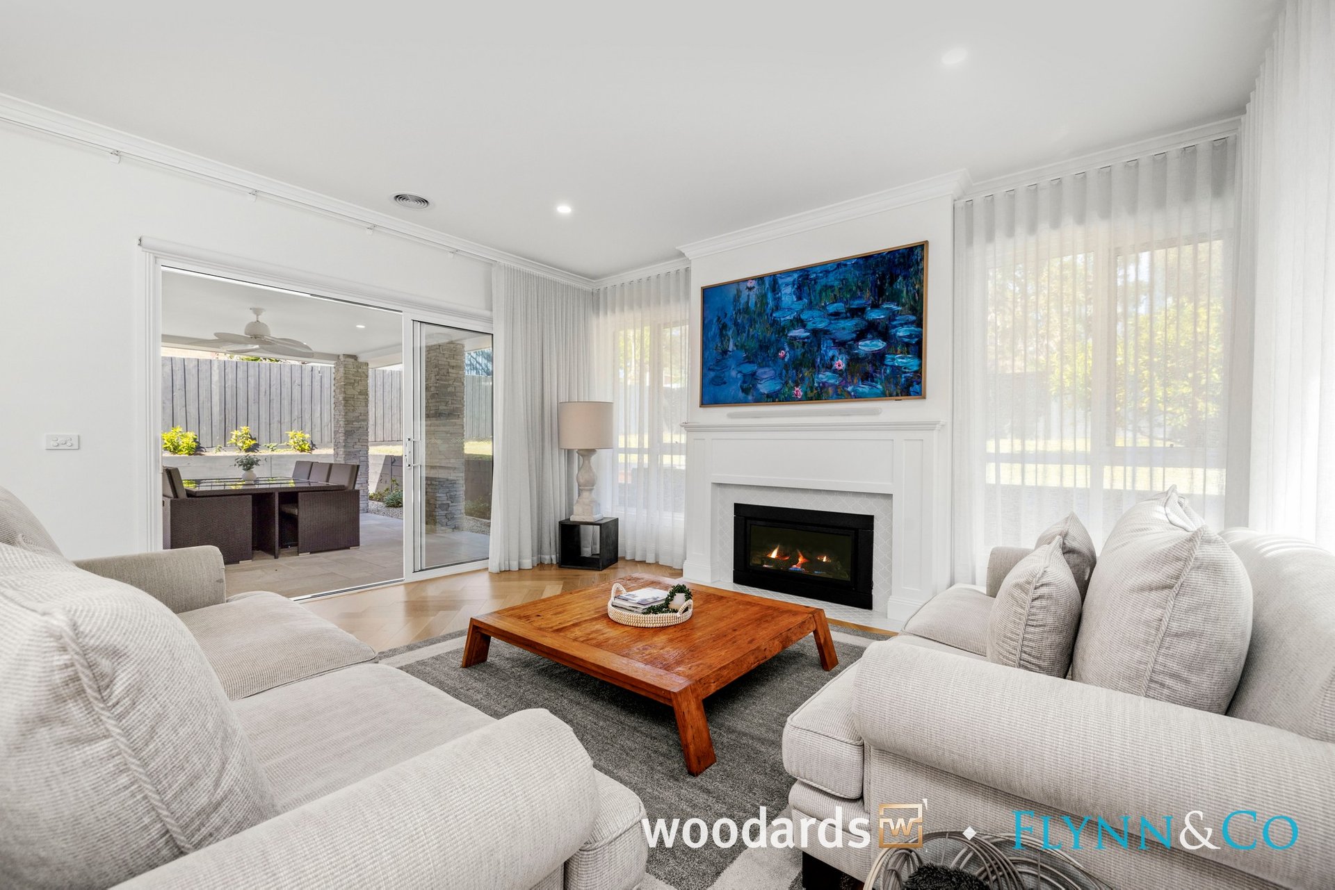 With its Hamptons-inspired façade, landscaped gardens and grand entry, the home sets an elegant tone from the outset. Inside, soaring ceilings, herringbone floors, wainscoting, beautiful sheer curtains and abundant natural light create interiors that are as warm as they are sophisticated.