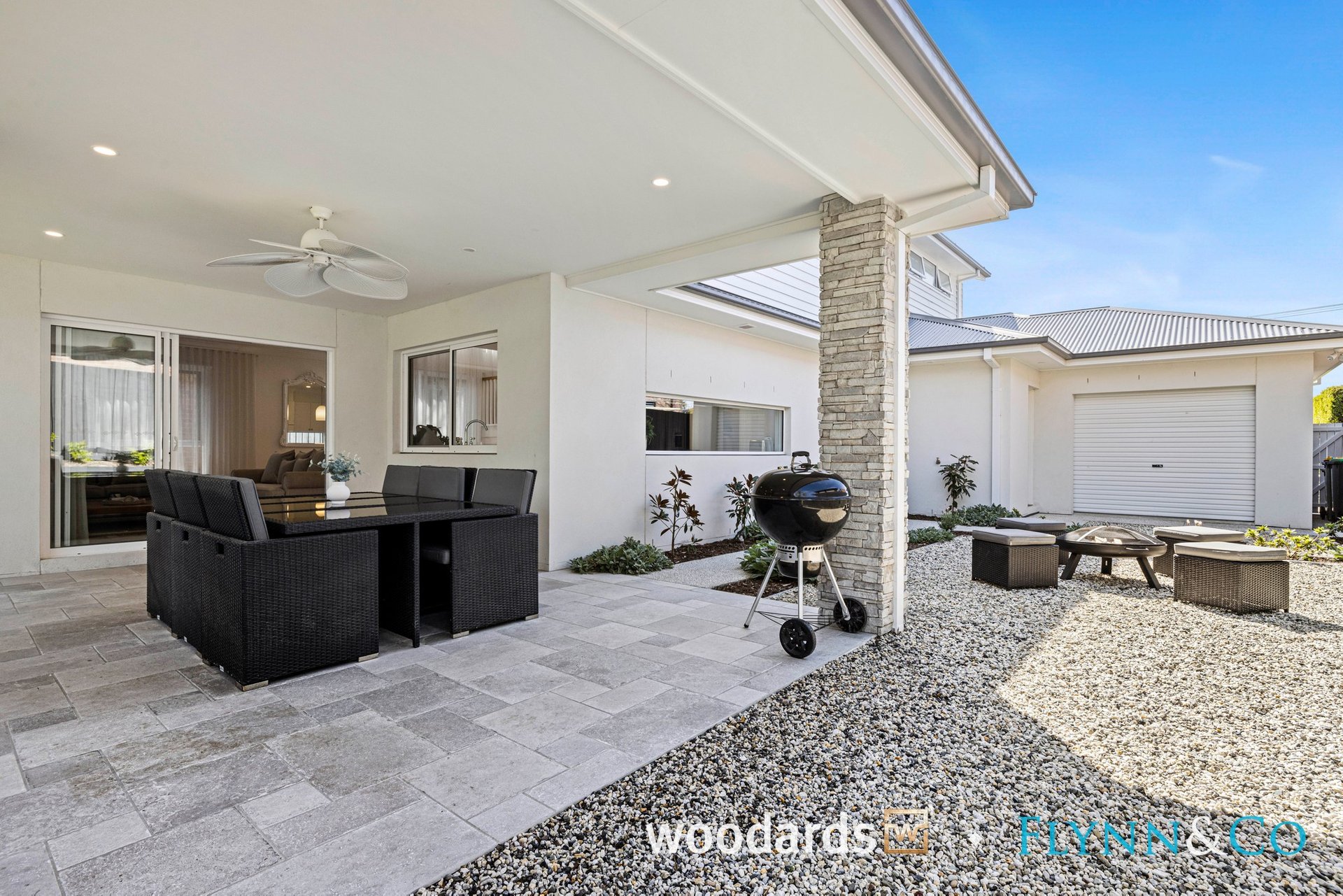 The heart of the home is an entertainer's dream — a designer kitchen with an enormous walk-in pantry, generous storage, and seamless flow to open-plan dining and living areas. A gas fireplace adds ambience, while outside, French-pattern porcelain tiles create a striking finish to the alfresco spaces, perfect for entertaining and relaxed coastal living.