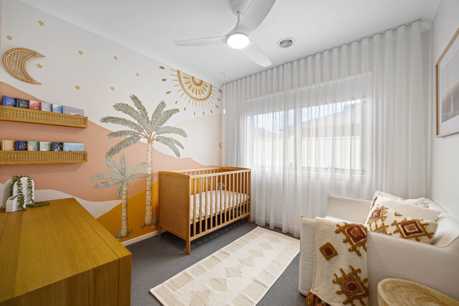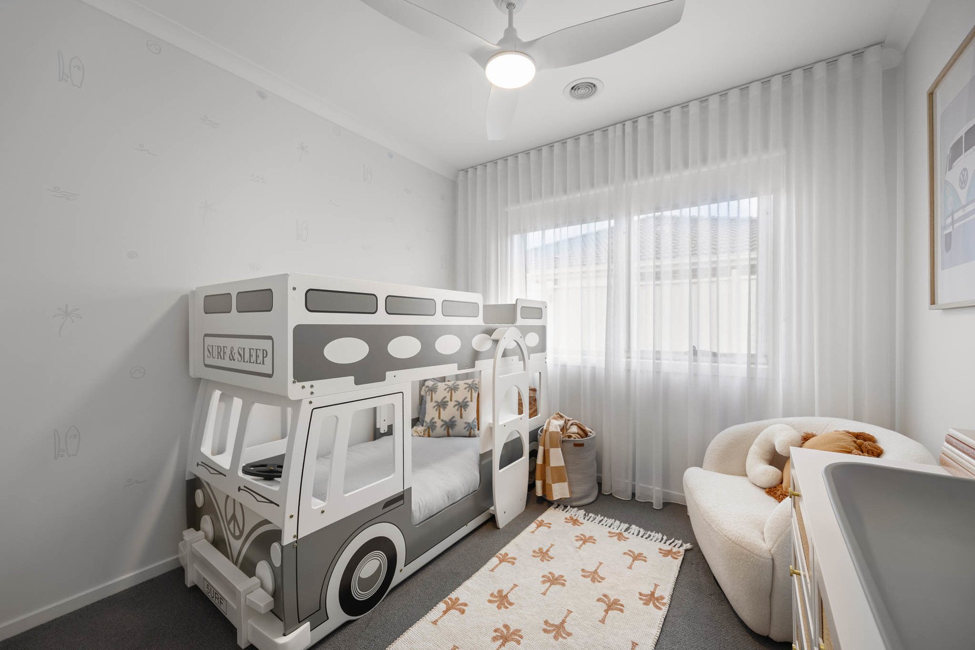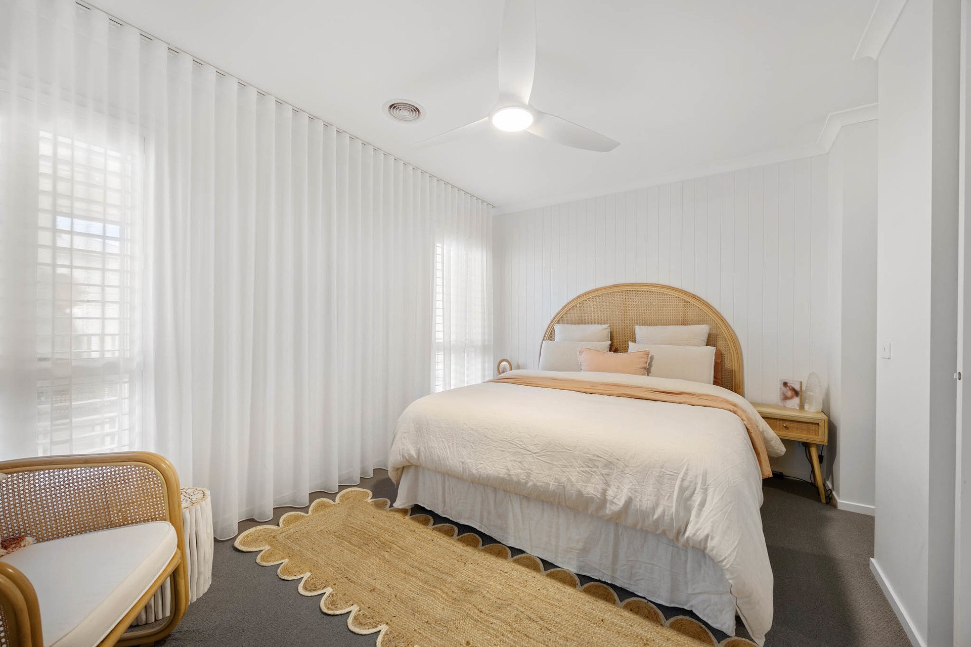 Inside, wide-board engineered flooring leads you through a thoughtful layout, complemented by acoustic insulation throughout bedrooms and hallways. The master retreat at the rear features plantation shutters, walk-in robe, and a luxury ensuite with twin vanities, dual shower heads, and barn-door entry. Bedrooms 2, 3, and 4 include built-in robes and ceiling fans, while the central bathroom offers a full bath, niched shower, and separate toilet.