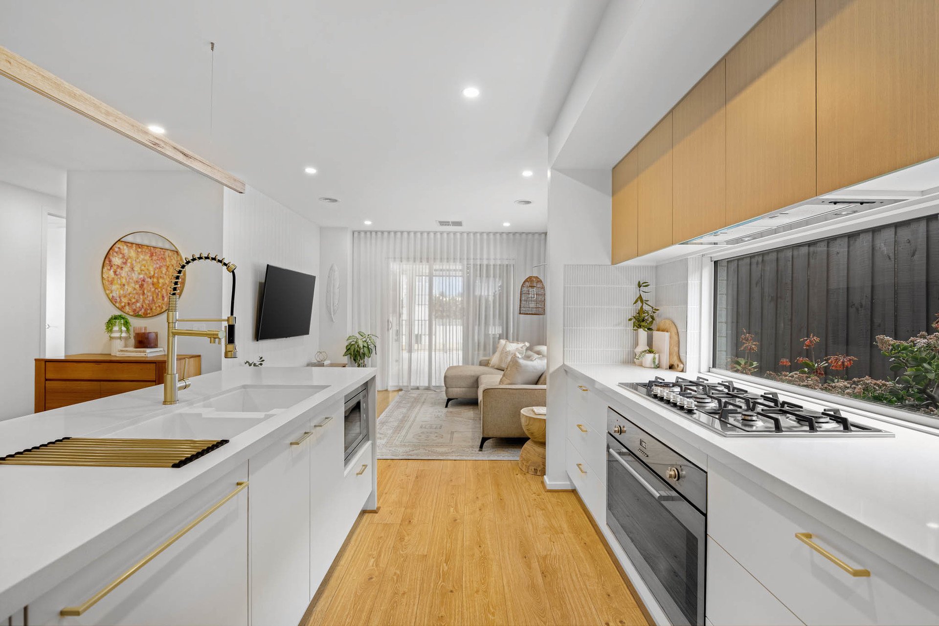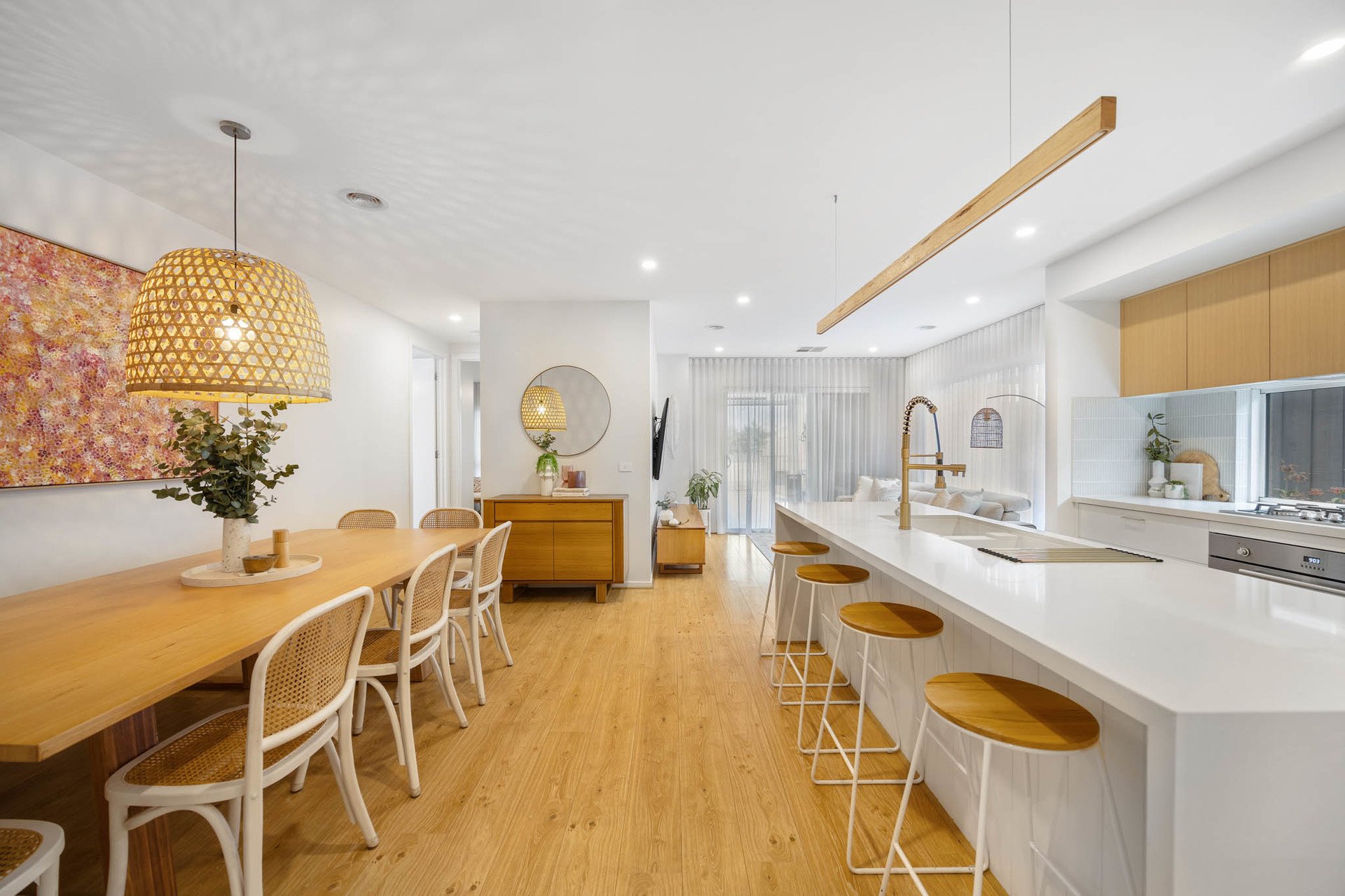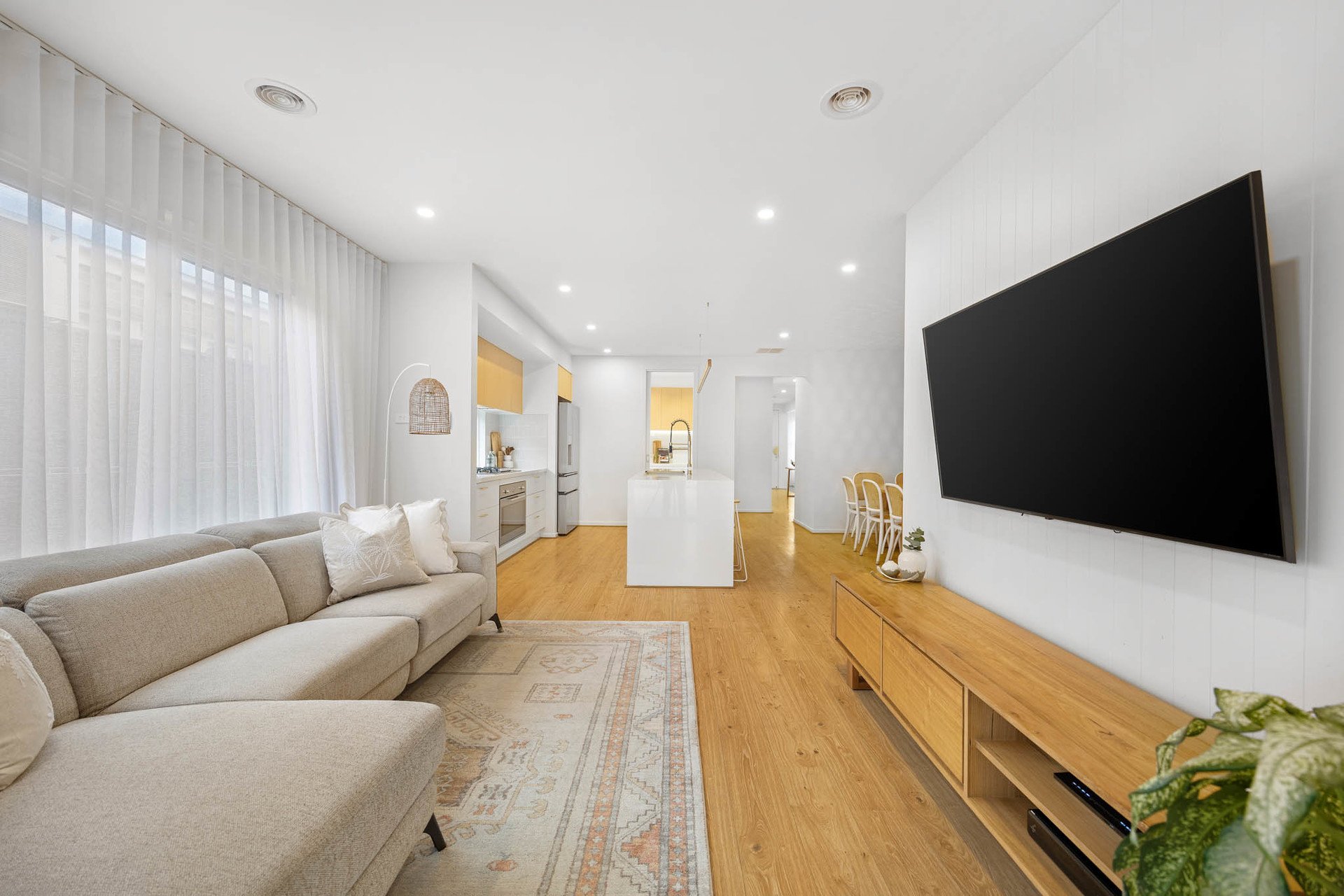 Showcasing striking vertical joinery, a larger statement front door and full landscaping with mature gardens, the home immediately impresses. Sustainable living is assured with solar panels, a Rain Bird smart sprinkler system, and full CCTV security.