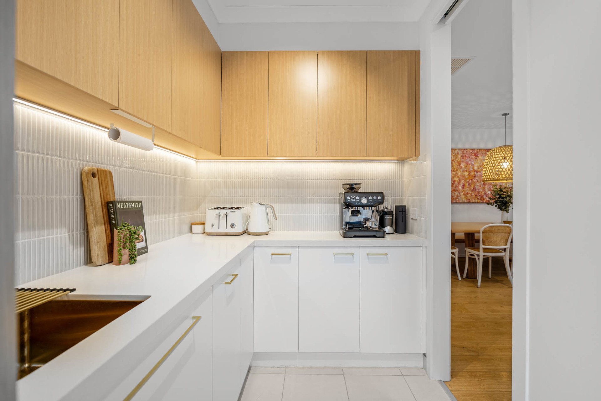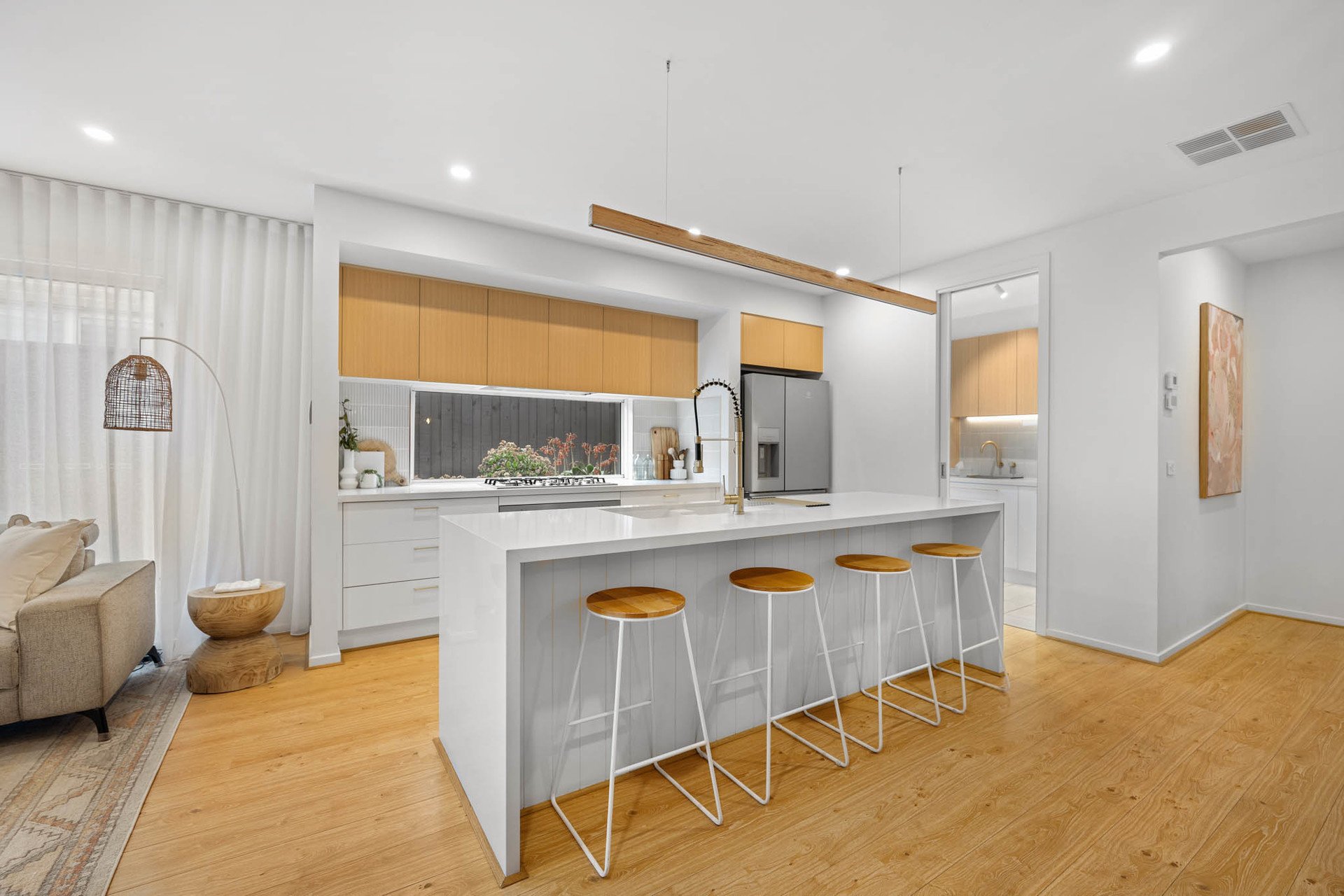 The heart of the home is the gourmet kitchen with a stone waterfall island, brass accents, integrated Asko dishwasher, ILVE 90cm oven and cooktop. A cleverly designed butler's pantry combines laundry facilities for ultimate convenience.