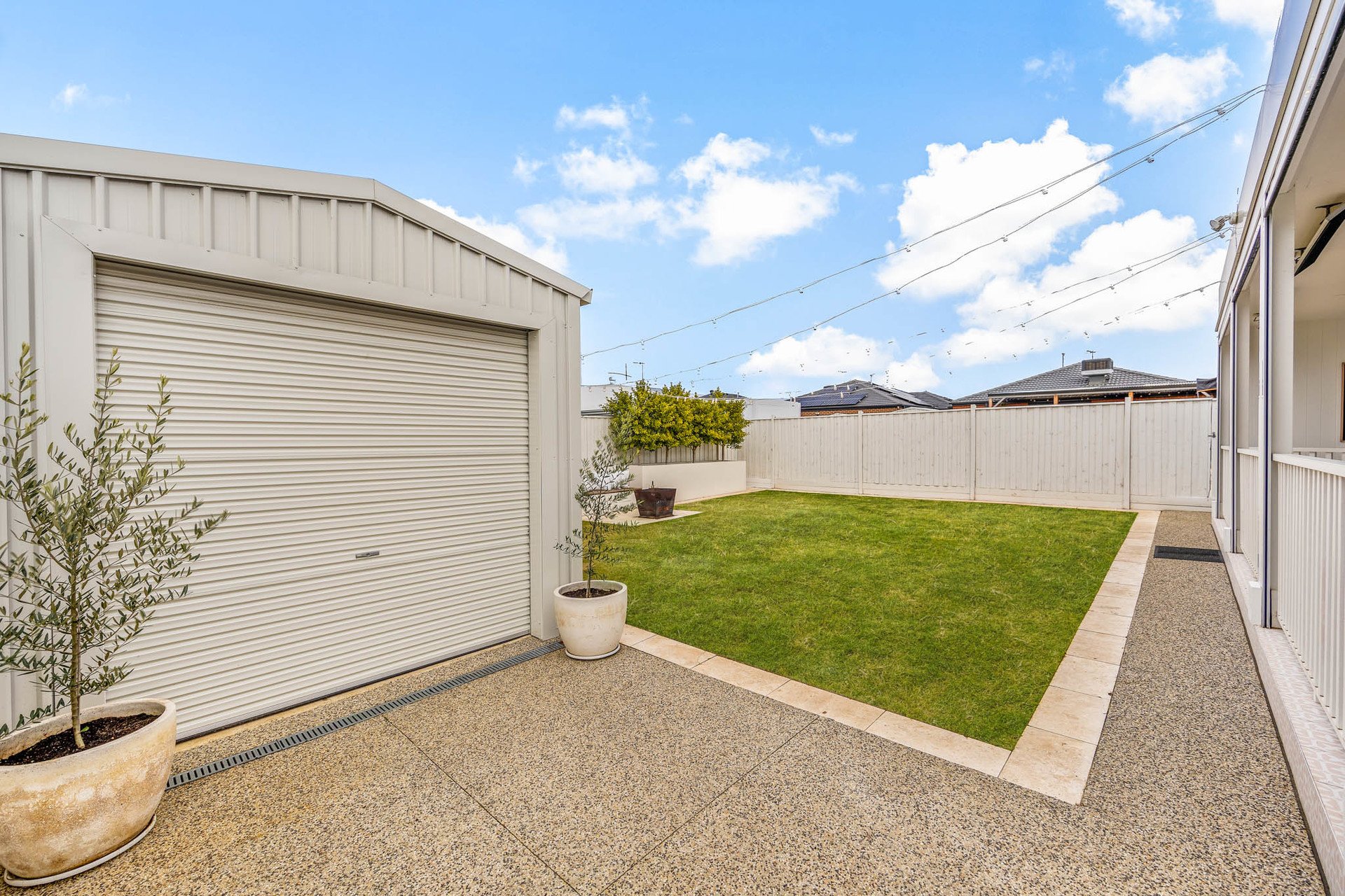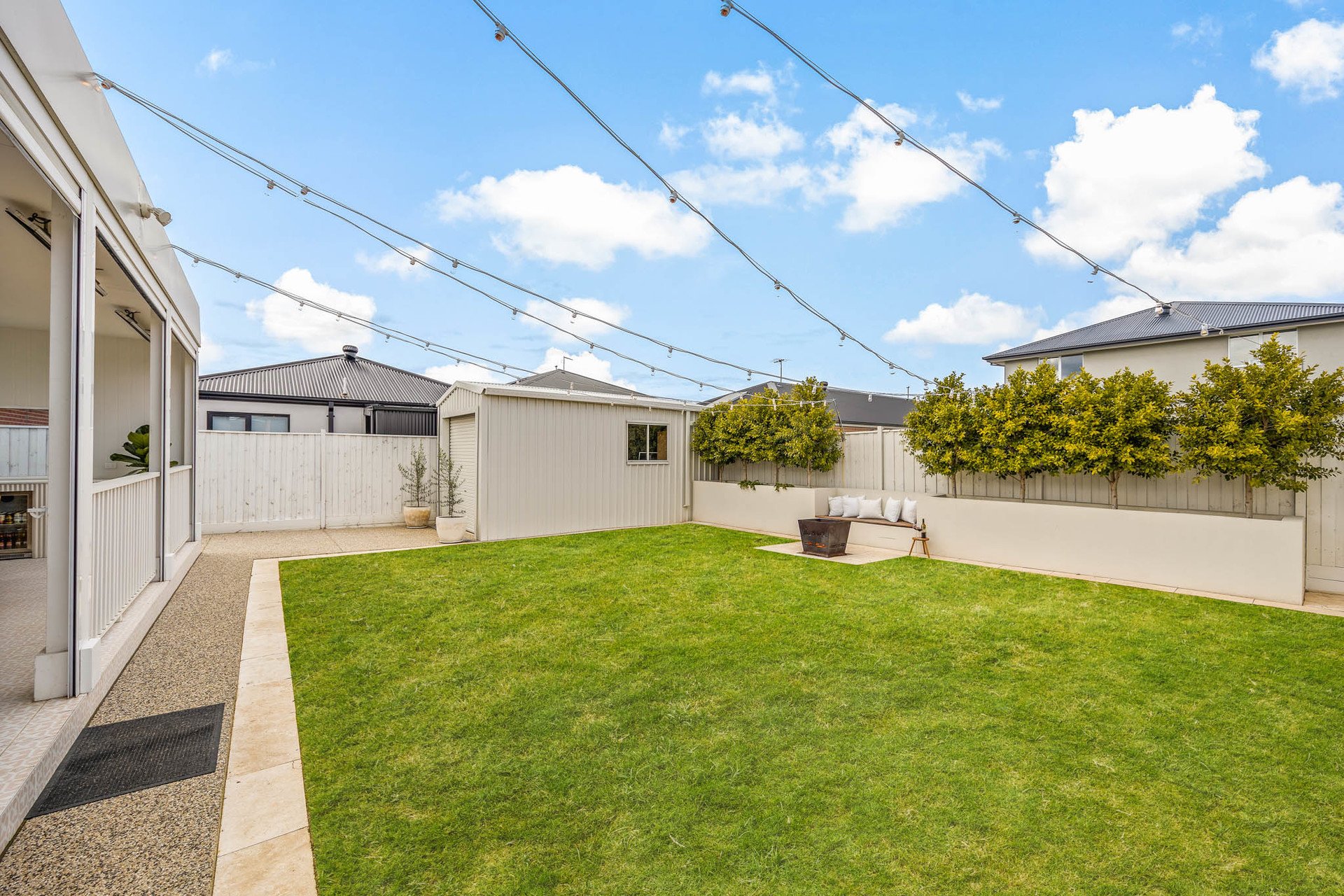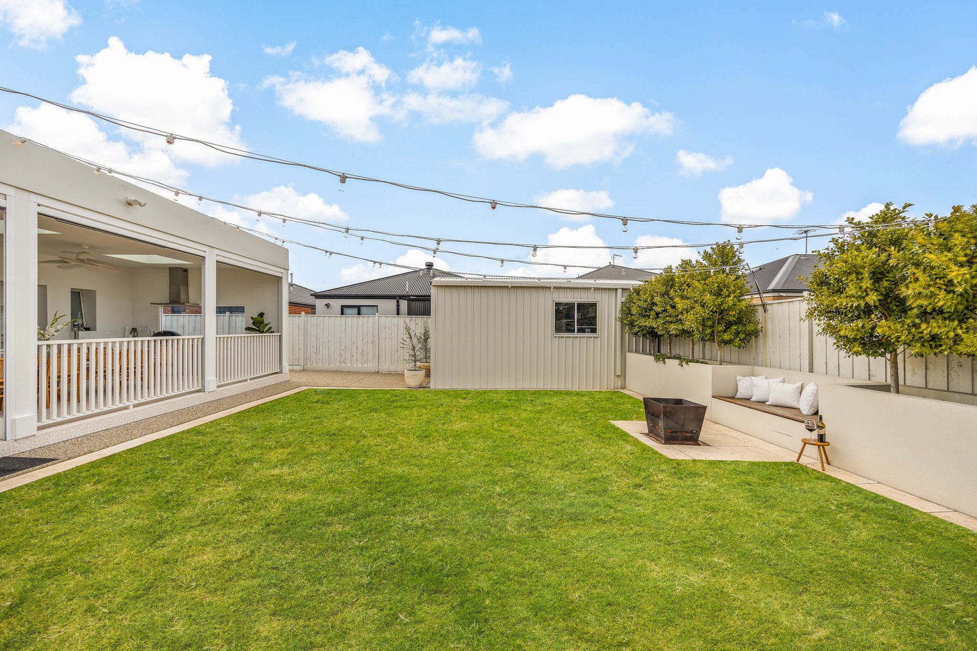 Outdoors, enjoy a secure backyard with mature boundary trees, turf, a firepit area, sandpit, side access, and a 6x3m shed. The double garage includes storage, epoxy flooring, and rear/internal access.
