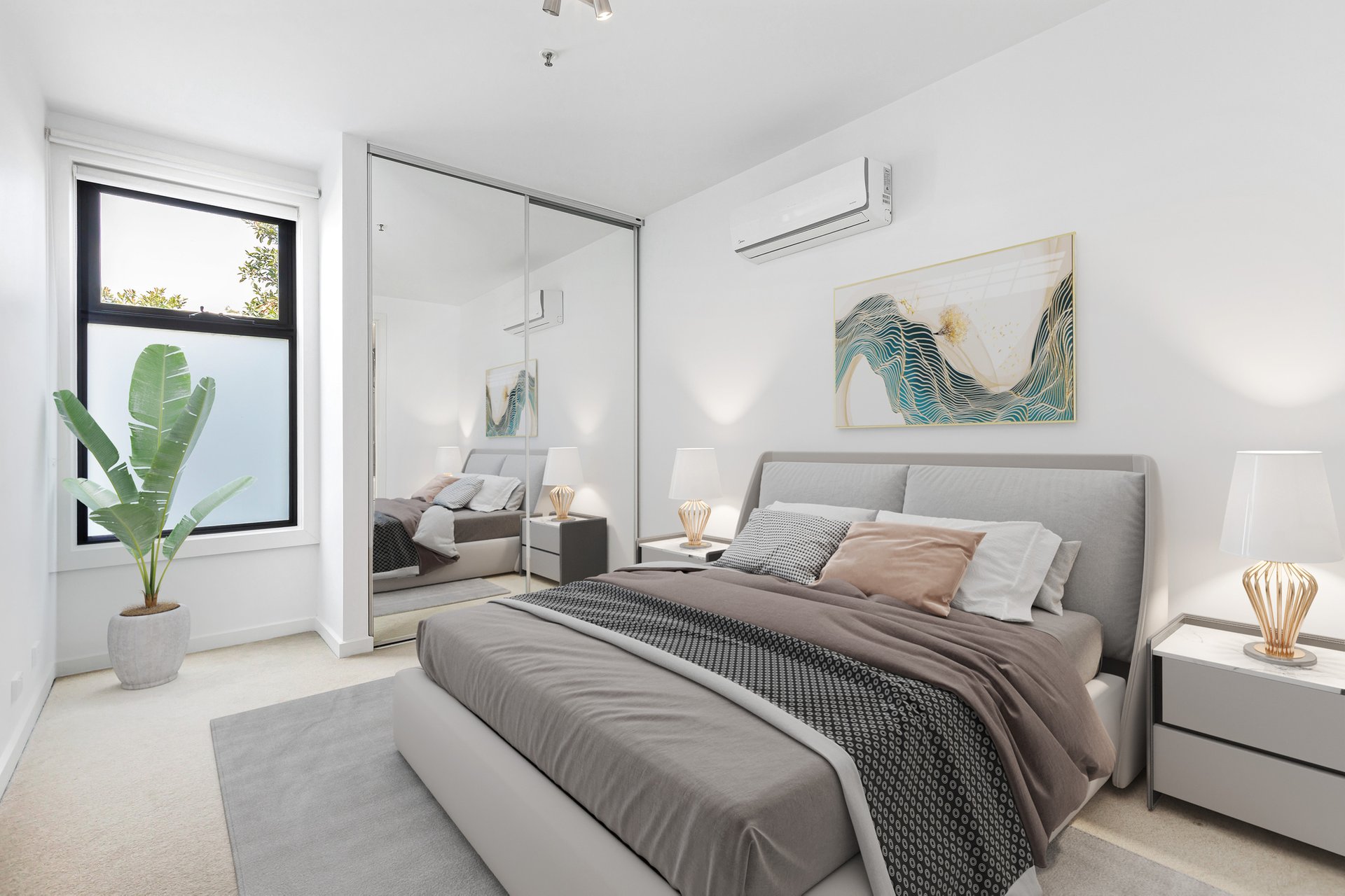 Both bedrooms feature built-in robes and roller blinds, with the master suite enjoying the added luxury of a stylish ensuite. A central chic bathroom and European laundry add to the apartment’s functionality and appeal. Additional features include split system heating/cooling, secure basement car space and storage cage.