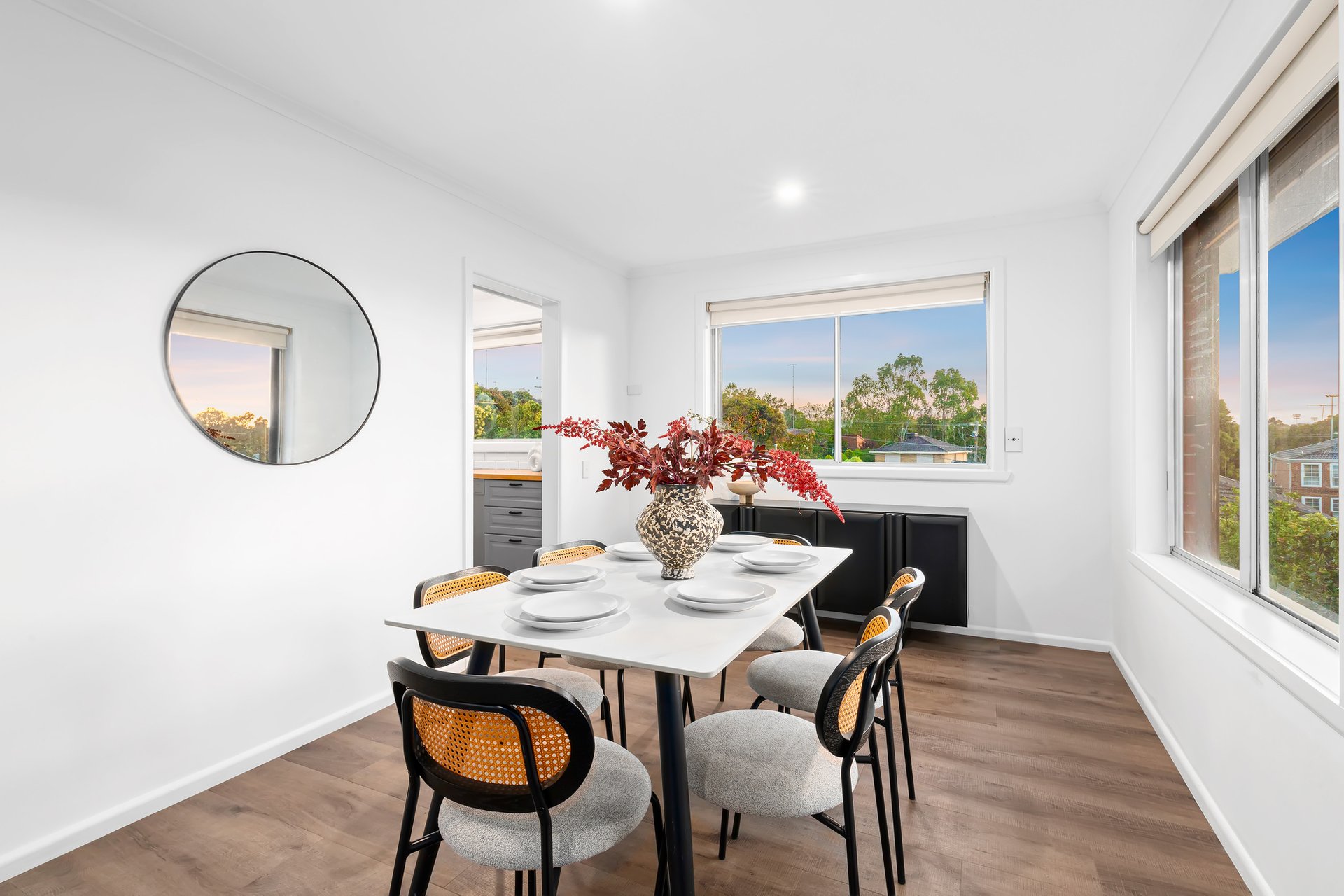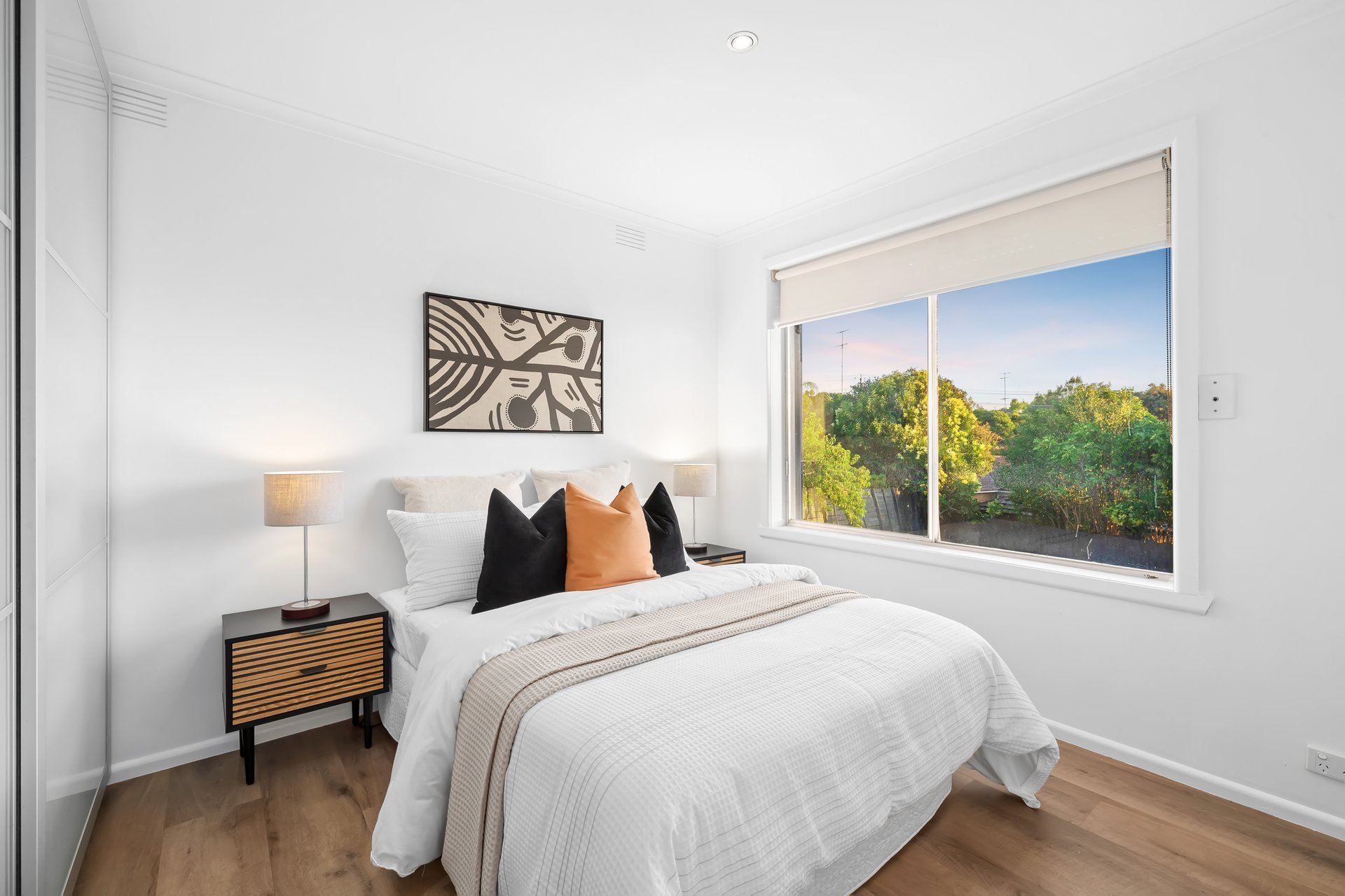 Positioned within a tightly held enclave just moments from the Yarra River, expansive parkland, Marcellin College and the convenience of Bulleen Plaza, the spacious lounge and dining area is complemented by a near-new designer kitchen showcasing European appliances, an induction cooktop and striking timber finishes.