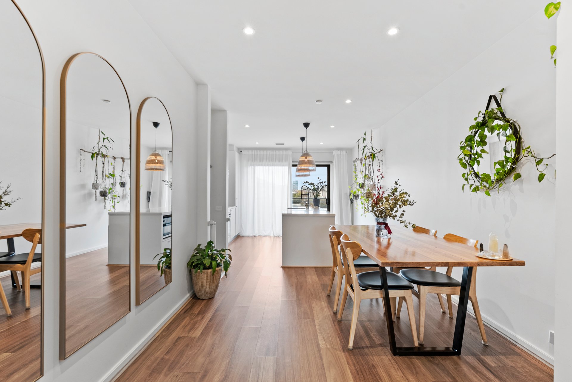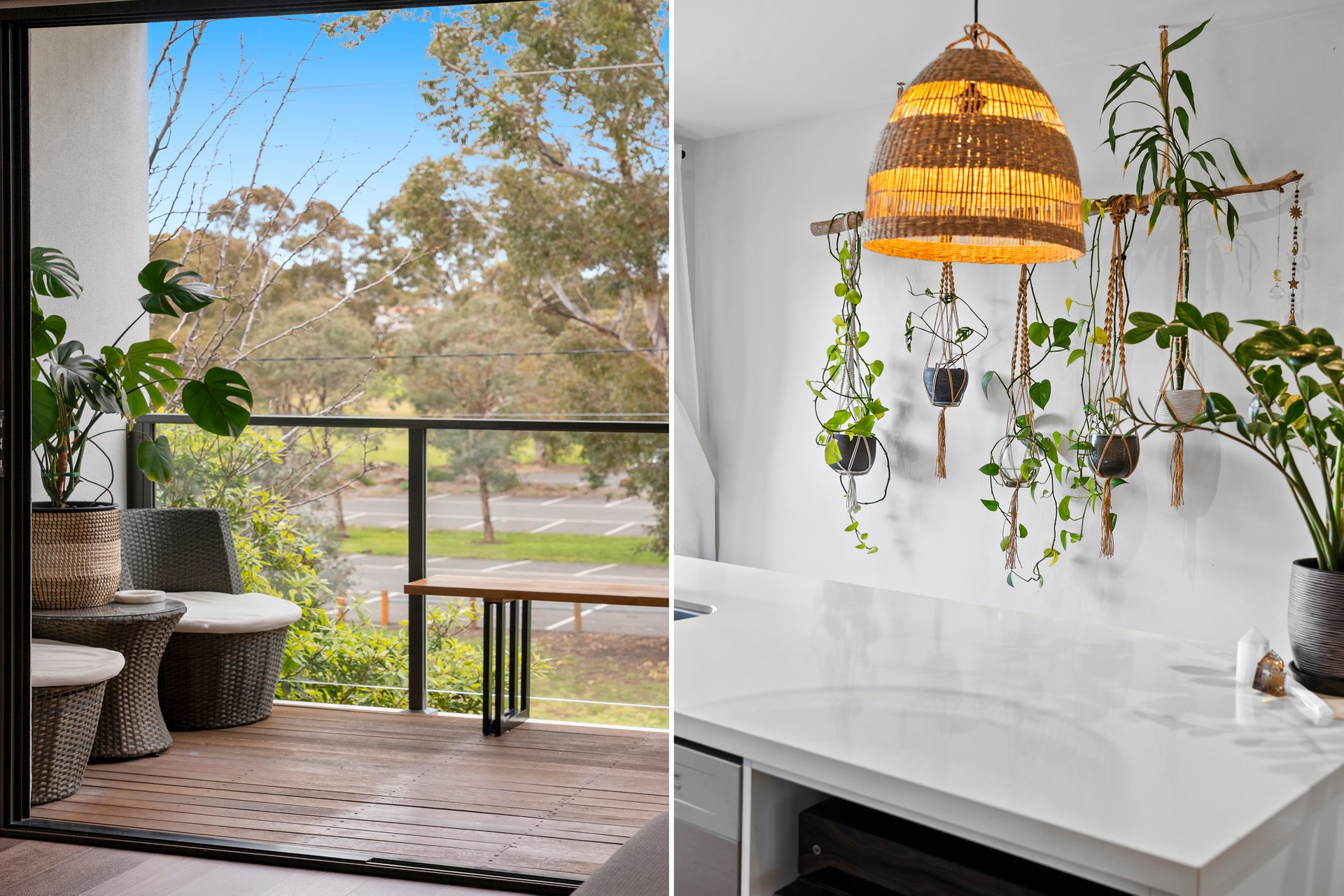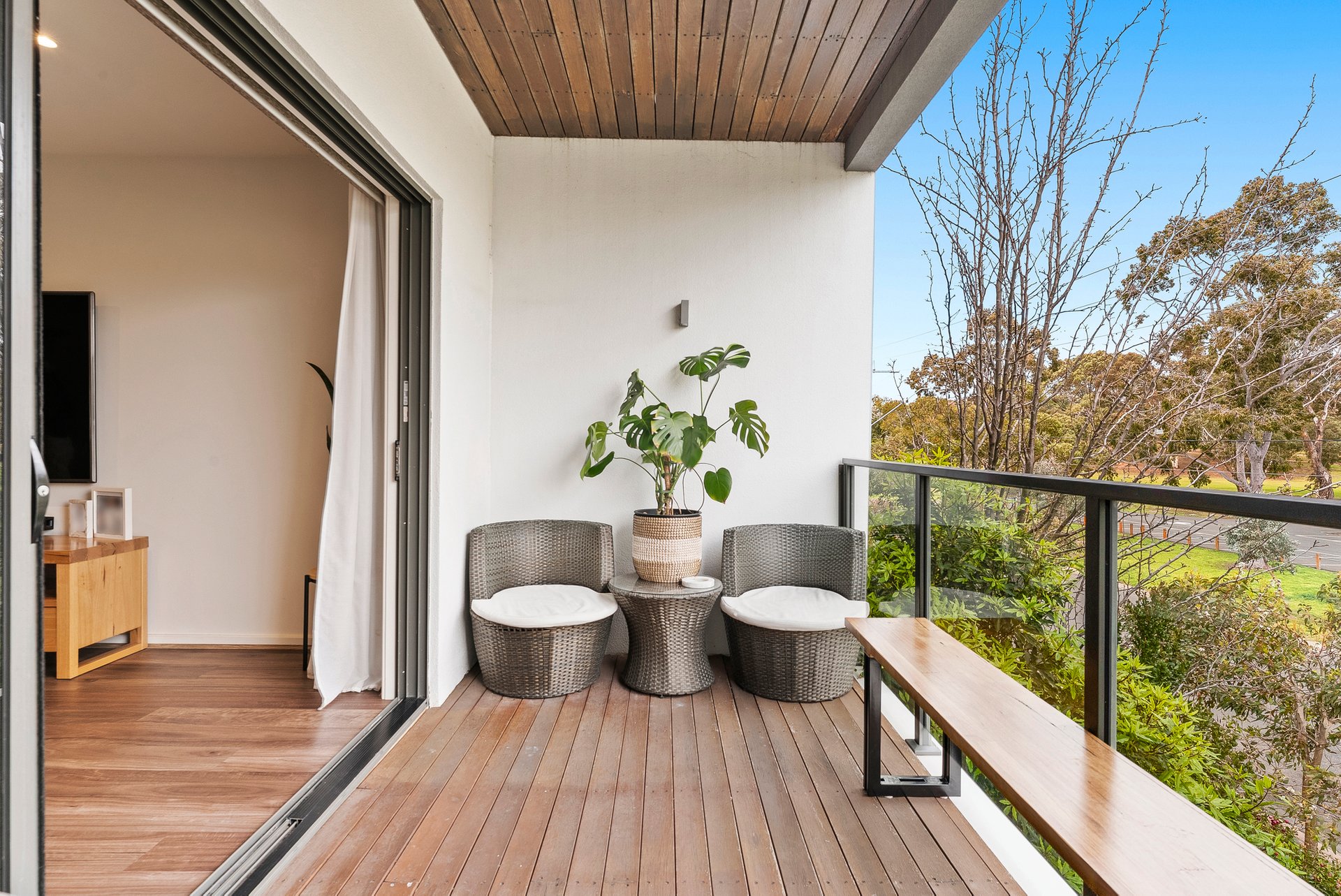 All living is positioned on one floor, creating a seamless flow from the kitchen through the dining and living areas, and out to the balcony with a wooden deck. In total, three balconies offer elevated outdoor spaces with calming green views, while plentiful storage ensures practicality across all levels.