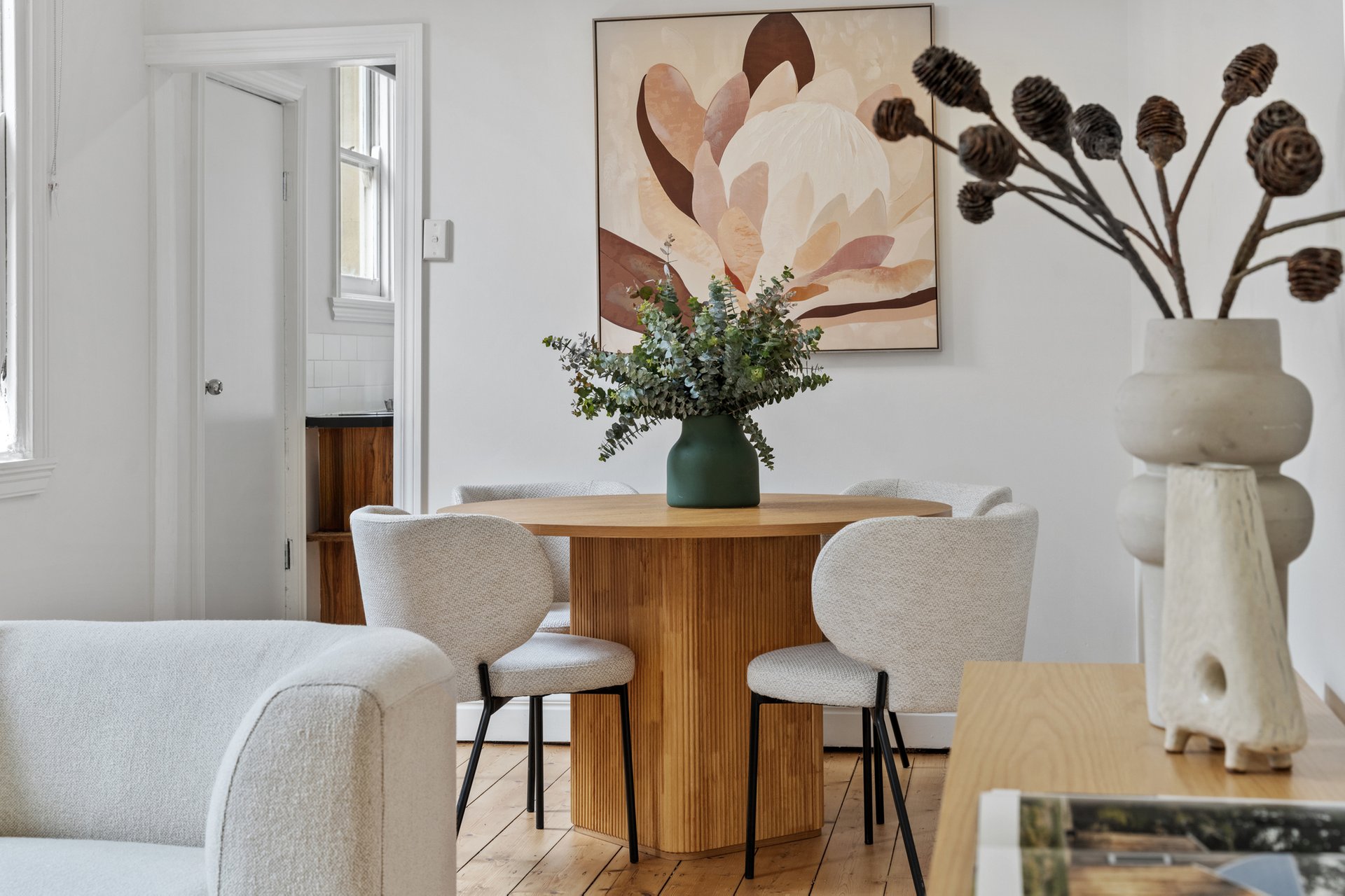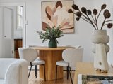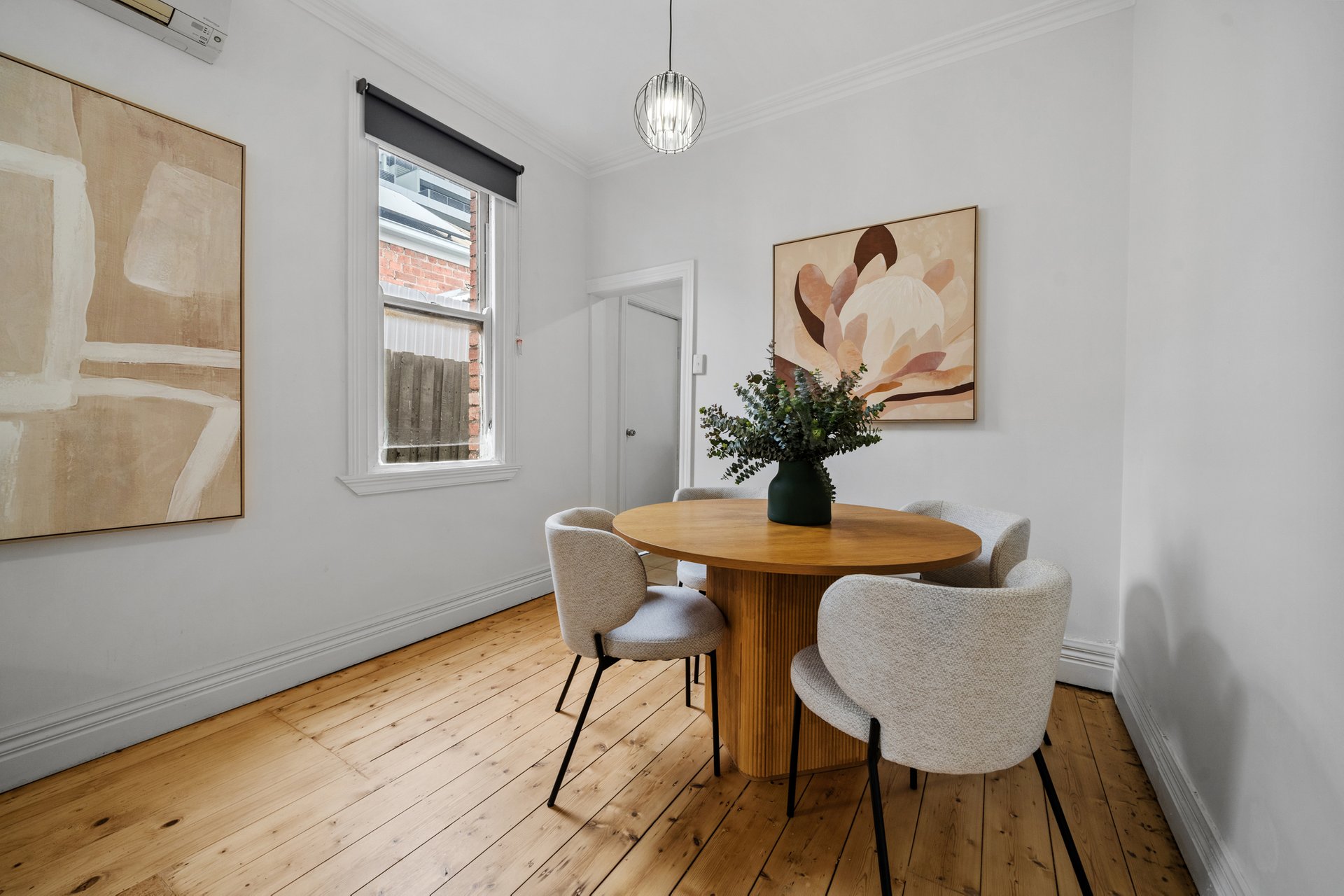 The open-plan living and dining area is filled with natural light and defined by high ceilings and polished timber floors. A dedicated dining zone comfortably accommodates a full-size table, while large windows provide excellent daylight without compromising privacy. Split-system heating and cooling ensures year-round comfort, and the seamless connection to the kitchen makes the space ideal for everyday living and entertaining.