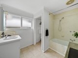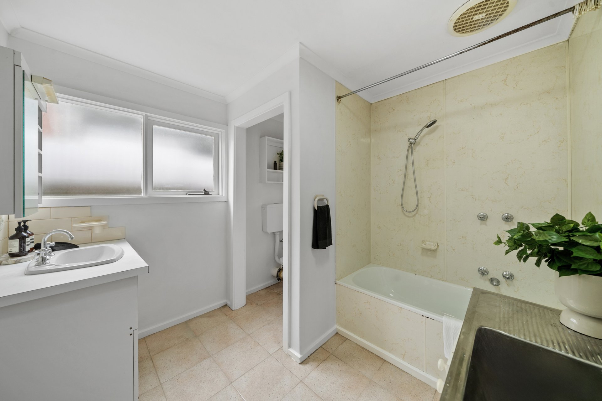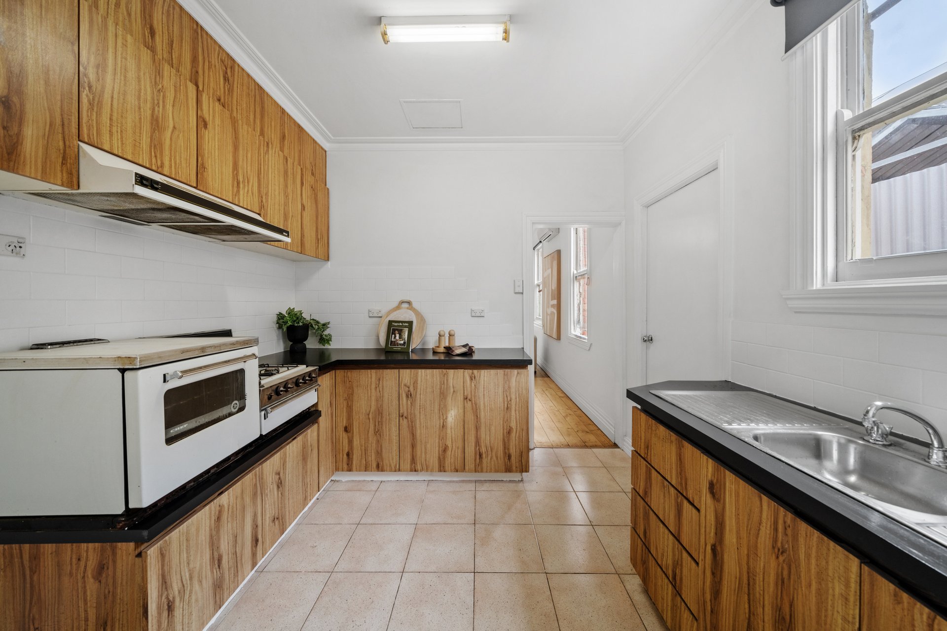 The galley-style kitchen is practical and well-considered, featuring timber-look cabinetry paired with dark benchtops, a gas cooktop and oven, white tiled splashback and generous storage. The rear bathroom includes a full-size bathtub, separate shower, vanity with basin plus a second sink, and a neatly integrated laundry. Neutral tiling and a frosted window provide a clean, functional space with natural light.