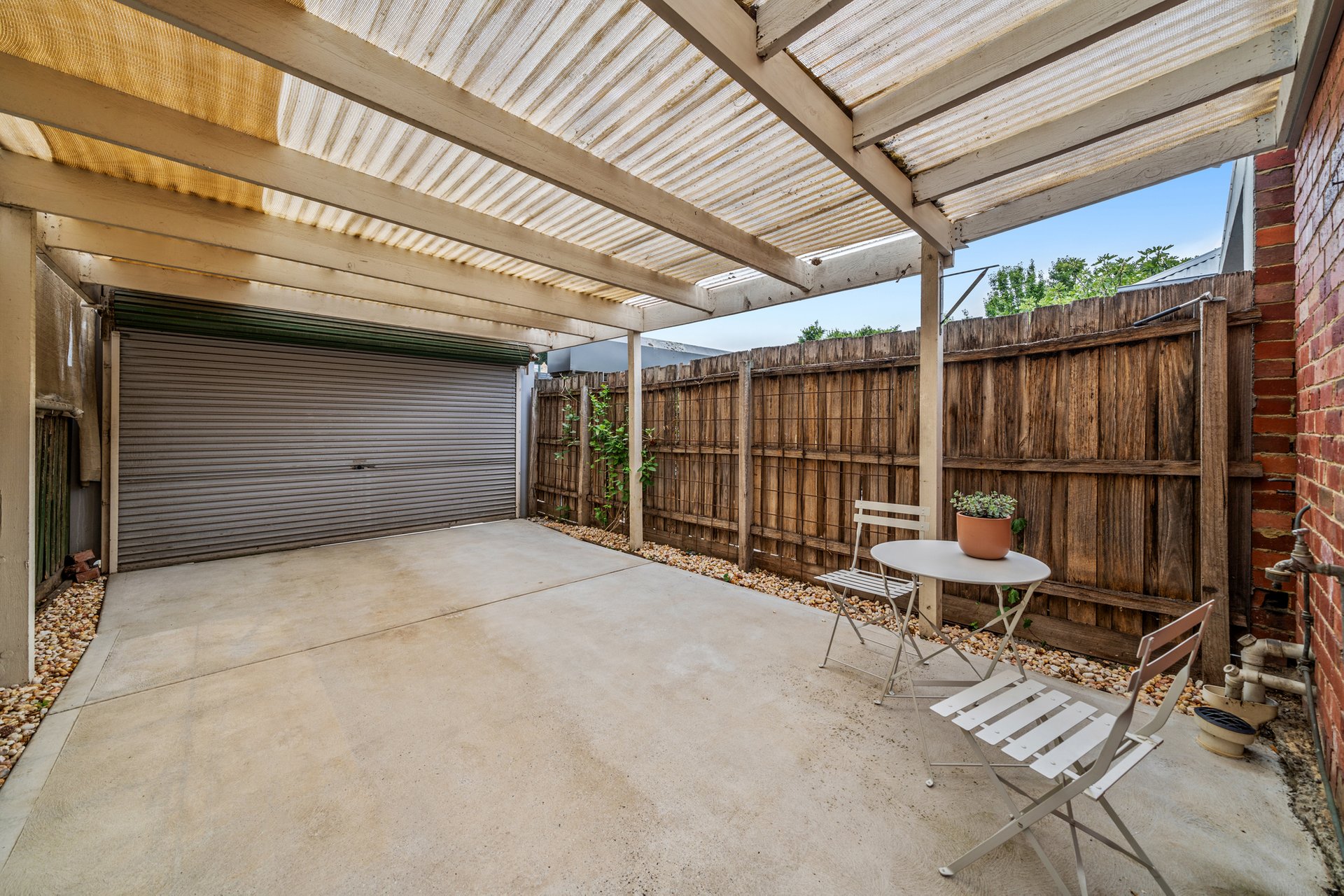 At the rear, a covered north facing courtyard with concrete paving offers a low-maintenance outdoor retreat, complemented by a secure roller-door providing off-street parking and additional storage. Fully fenced and private, this versatile space is ideal for entertaining, outdoor dining or workshop use.
