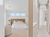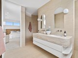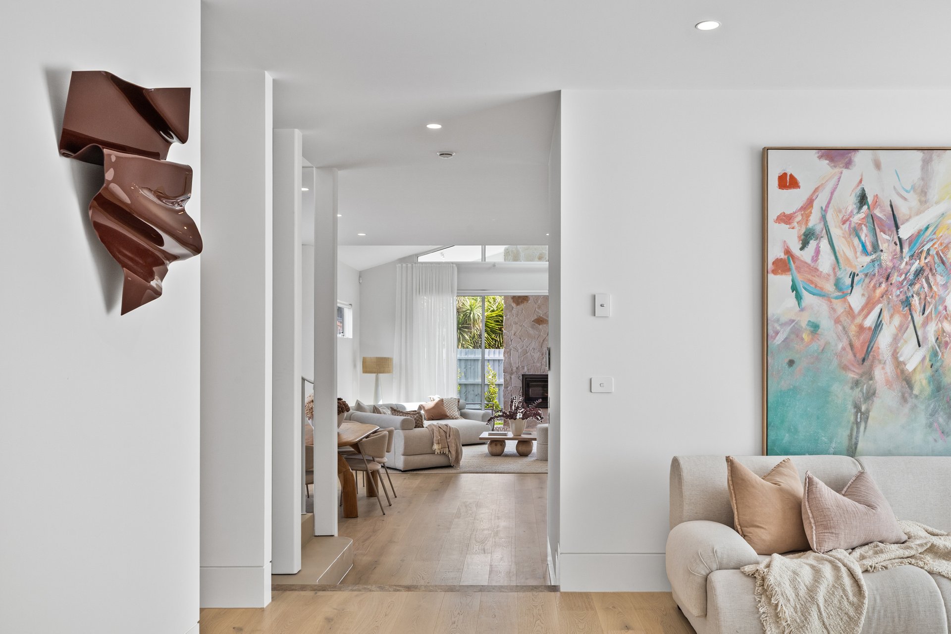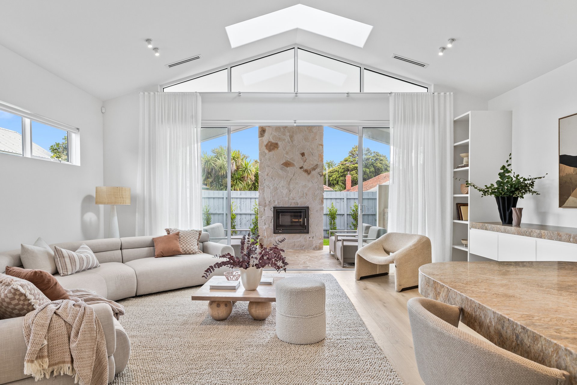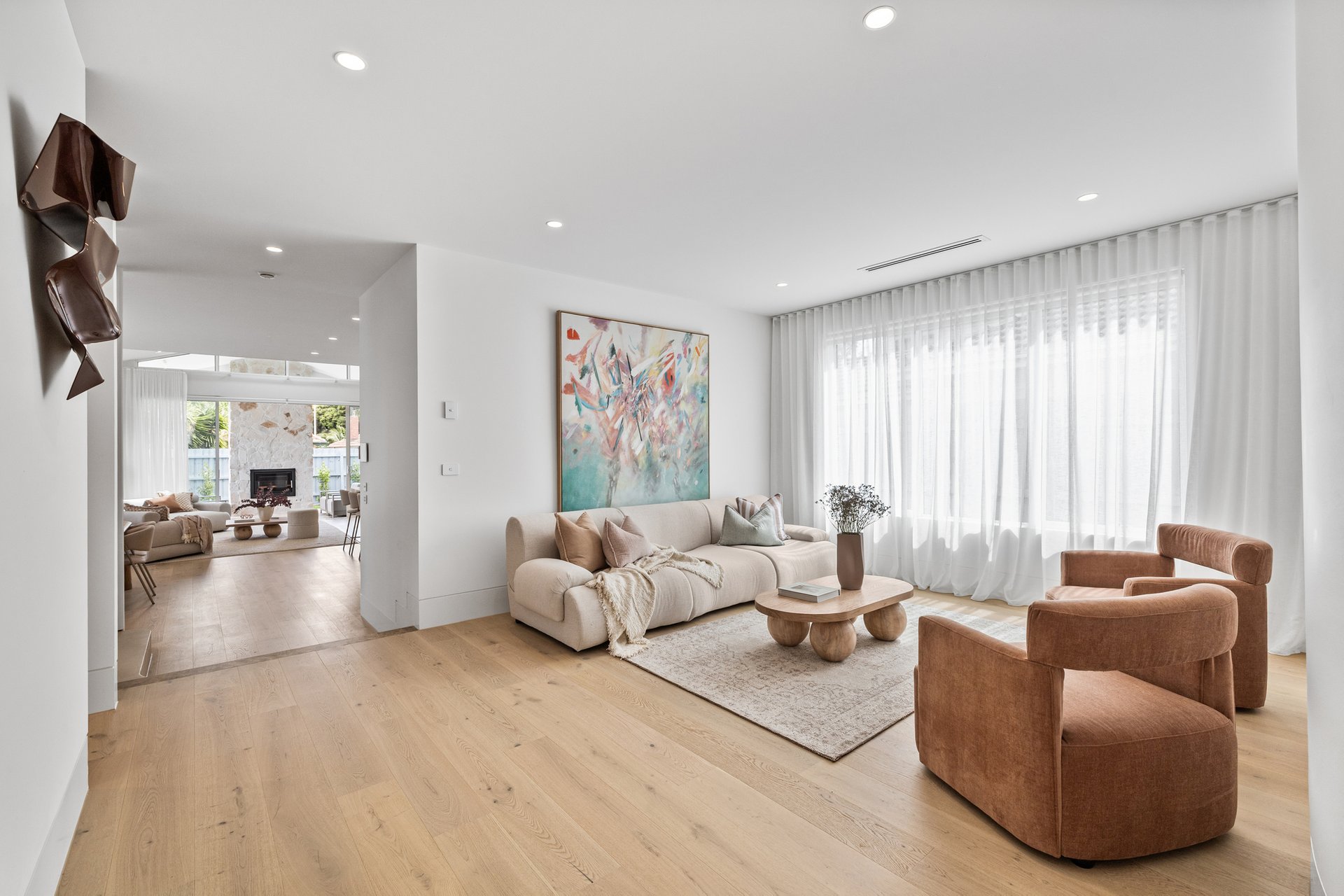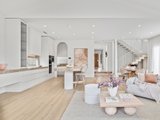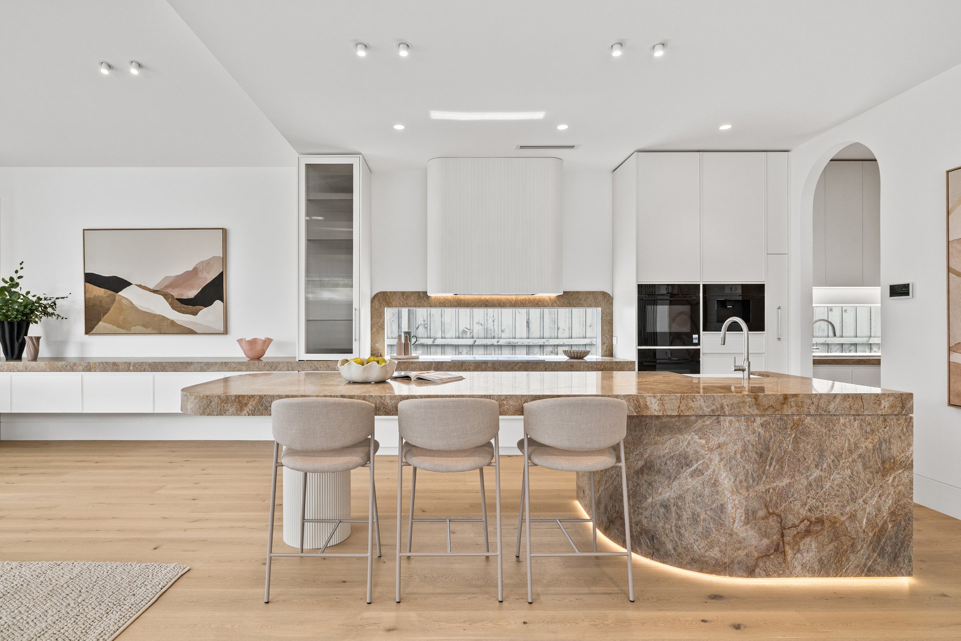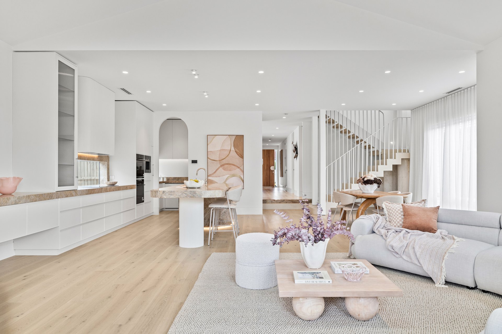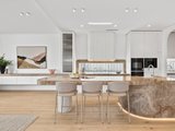 The open plan living and dining space flows from an architectural kitchen featuring honed Quantum Quartz marble, a Turner Hastings sink, premium Bosch appliances including a Wi Fi induction cooktop and integrated coffee machine, and a generous walk-in pantry with Fisher and Paykel appliances.