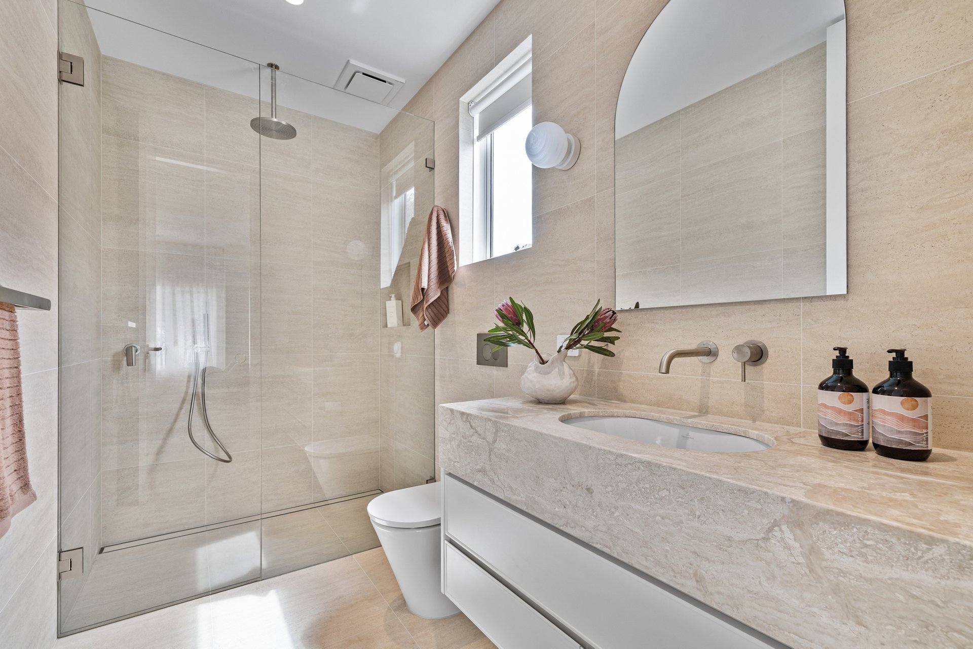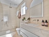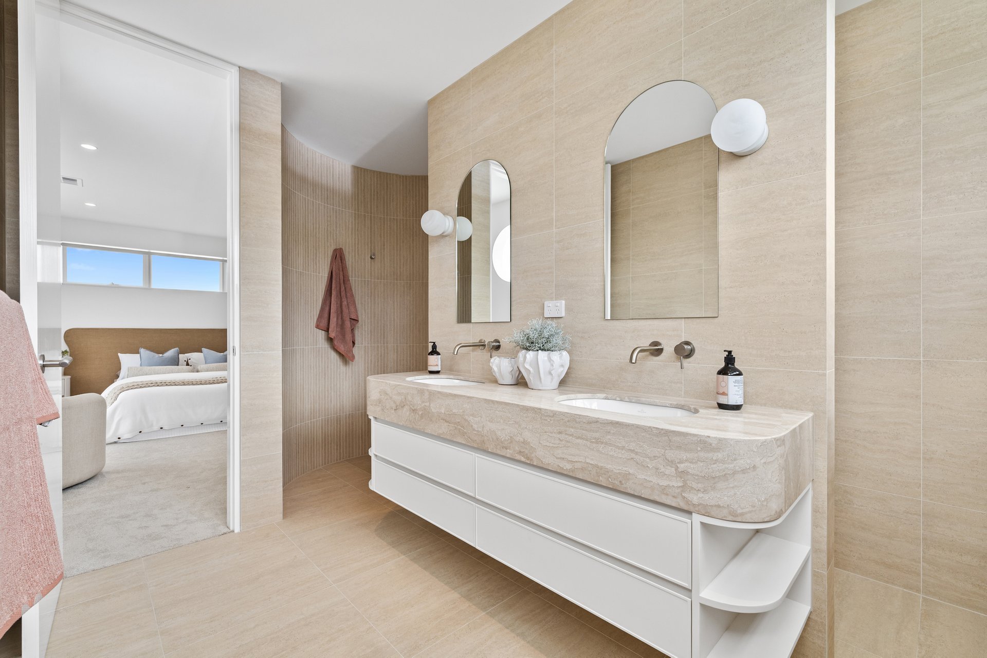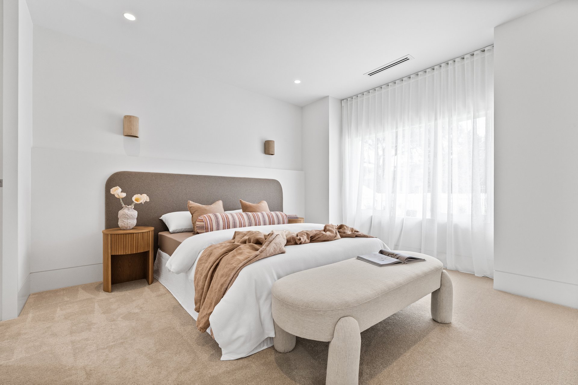Inside, the layout unfolds across two spacious levels. A peaceful downstairs bedroom suits guests, multigenerational living or a home office, while upstairs the master suite offers a skylit walk in robe, and a beautifully finished ensuite with stone and Villeroy and Boch fittings. Three additional bedrooms with built-in robes and study desks accompany a bright second living area.