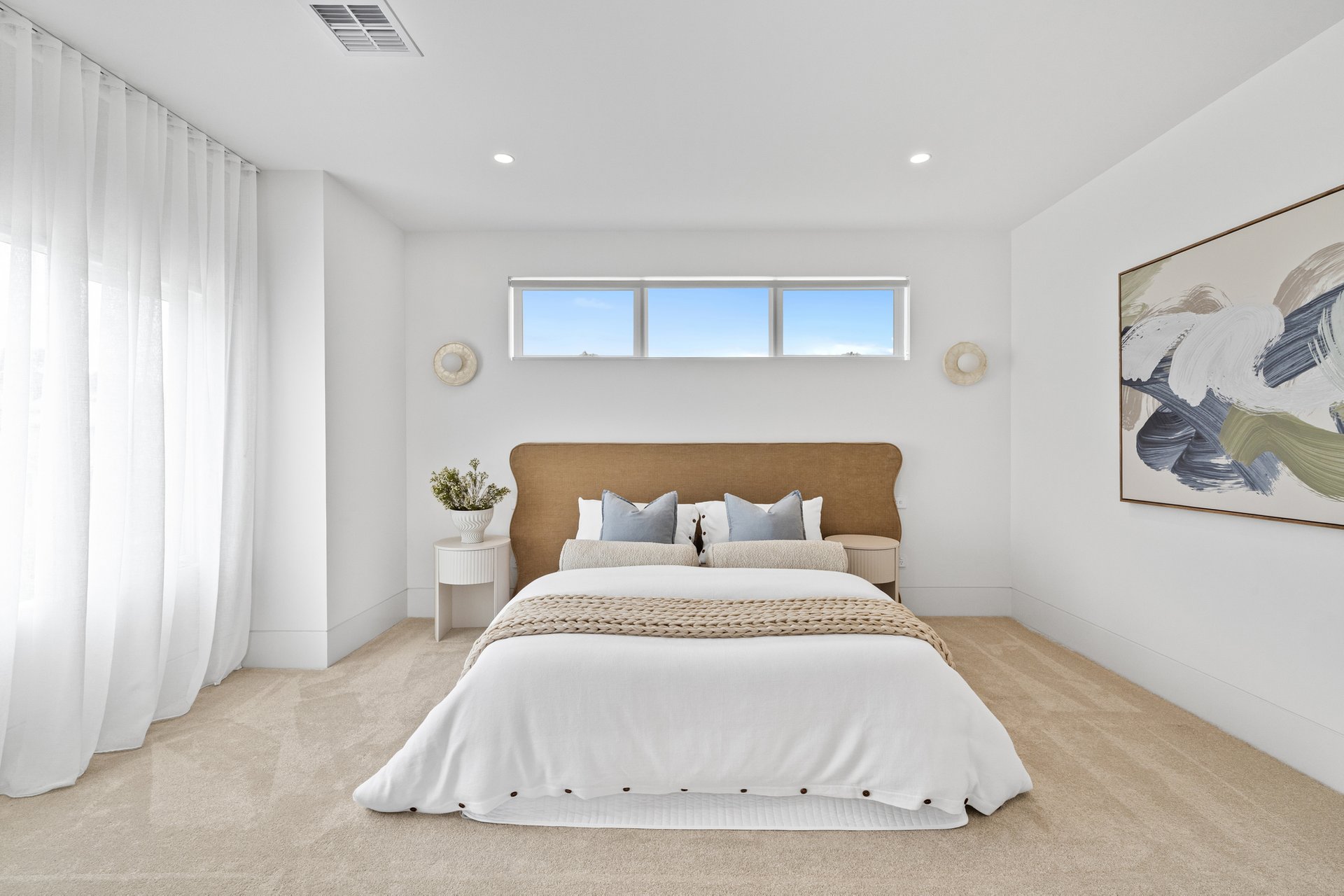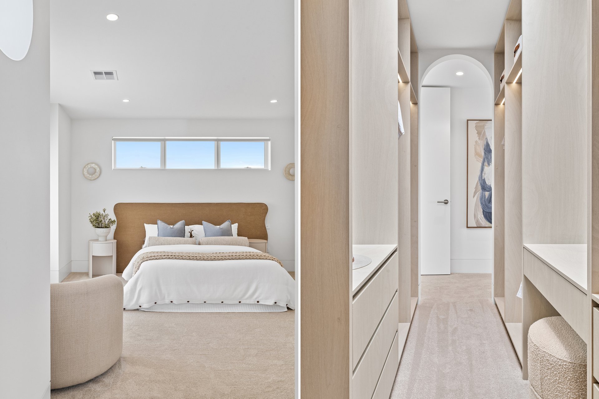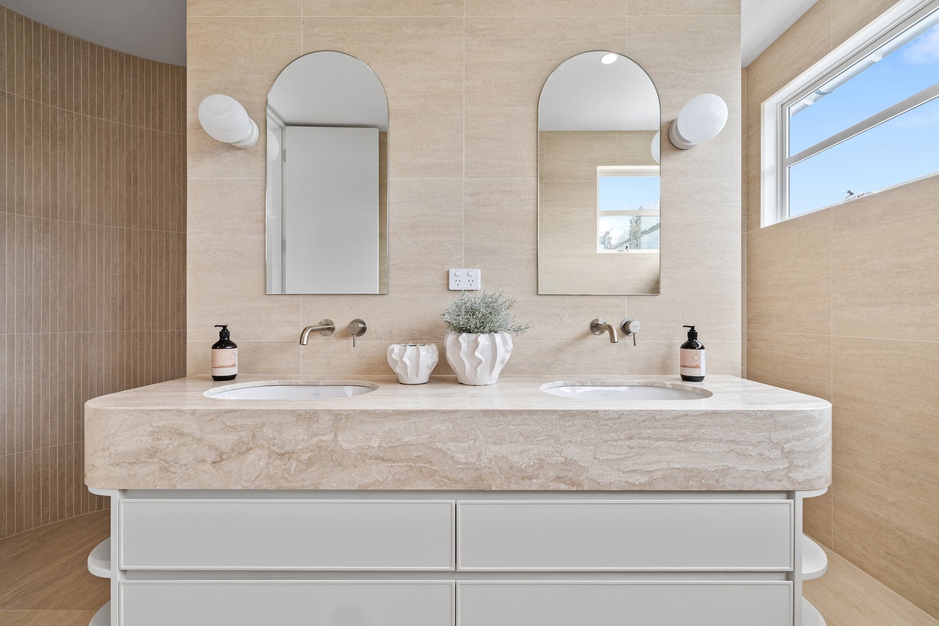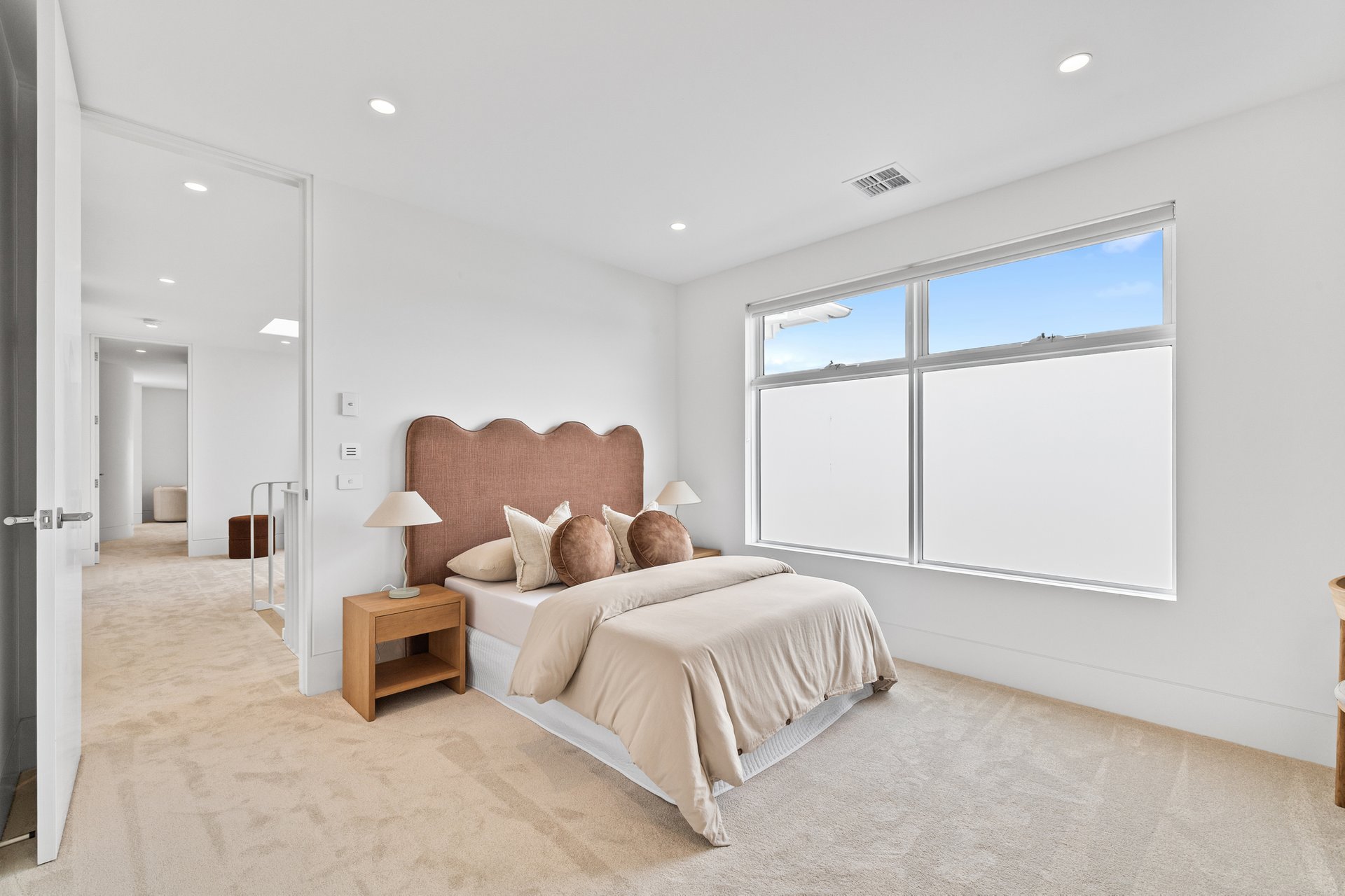 Inside, the layout unfolds across two spacious levels. A peaceful downstairs bedroom suits guests, multigenerational living or a home office, while upstairs the master suite offers a skylit walk in robe, and a beautifully finished ensuite with stone and Villeroy and Boch fittings. Three additional bedrooms with built-in robes and study desks accompany a bright second living area.