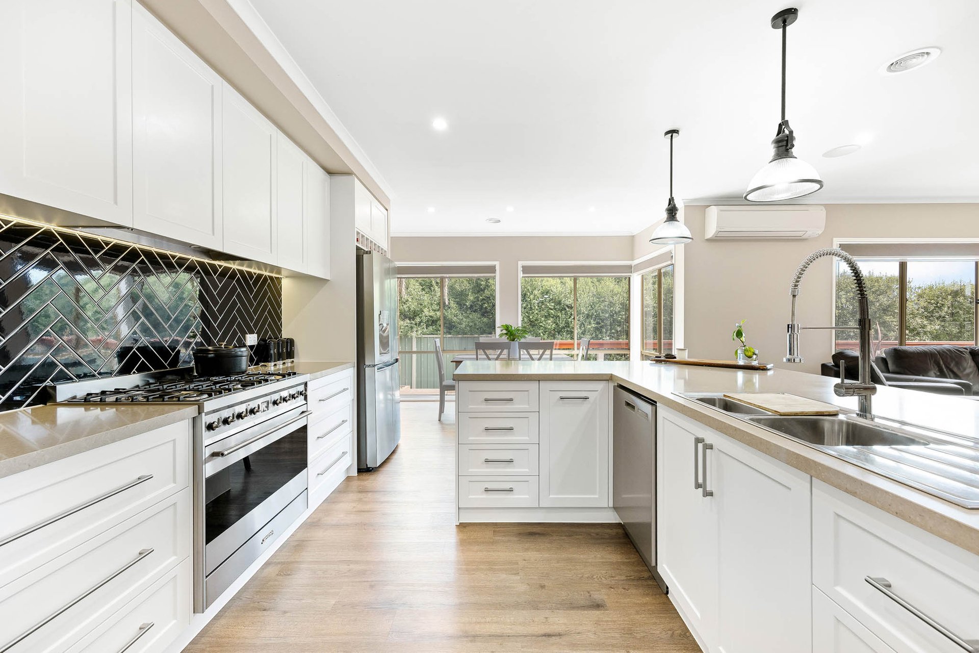Beyond the arched entry portico, 2.7m coffered ceilings enhance the sense of scale within an inviting entry hall, complemented by a striking statement light. A cosy theatre with Heat & Glo fireplace offers an immediate retreat, before the home opens to dining and living areas anchored by a gourmet kitchen appointed with 40mm stone benchtops, white soft-close cabinetry and drawers, a herringbone-tiled splashback, 900mm SMEG upright oven with 6-zone cooktop, and an ASKO dishwasher.