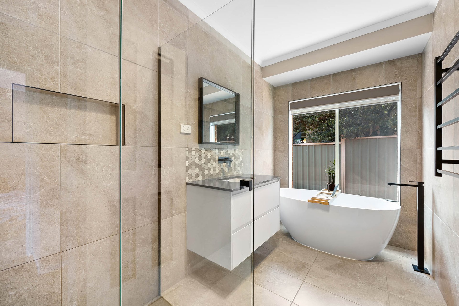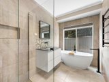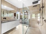 Accommodation comprises four well-proportioned bedrooms, led by a main bedroom with bay windows that frame a leafy outlook, complete with a walk-in robe and an ensuite featuring a niched double shower and twin stone vanity. The remaining three bedrooms include built-in robes and are serviced by a central bathroom with stone vanity, niched shower, and an oval bath. A large study provides additional flexibility as a further living or work-from-home space.