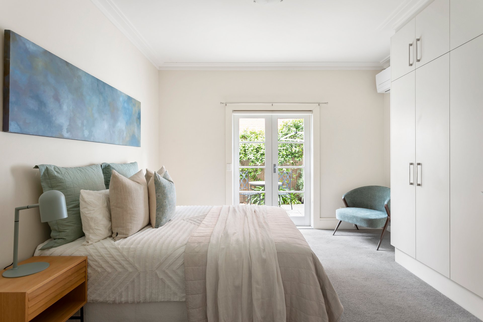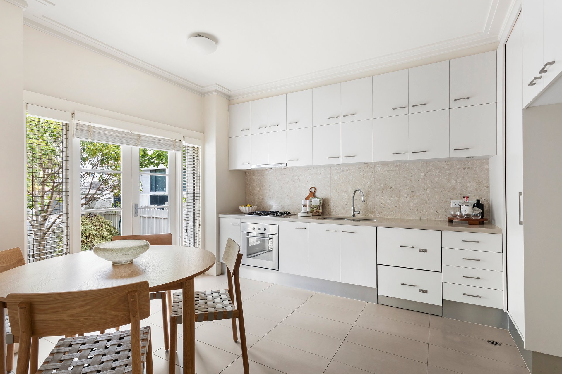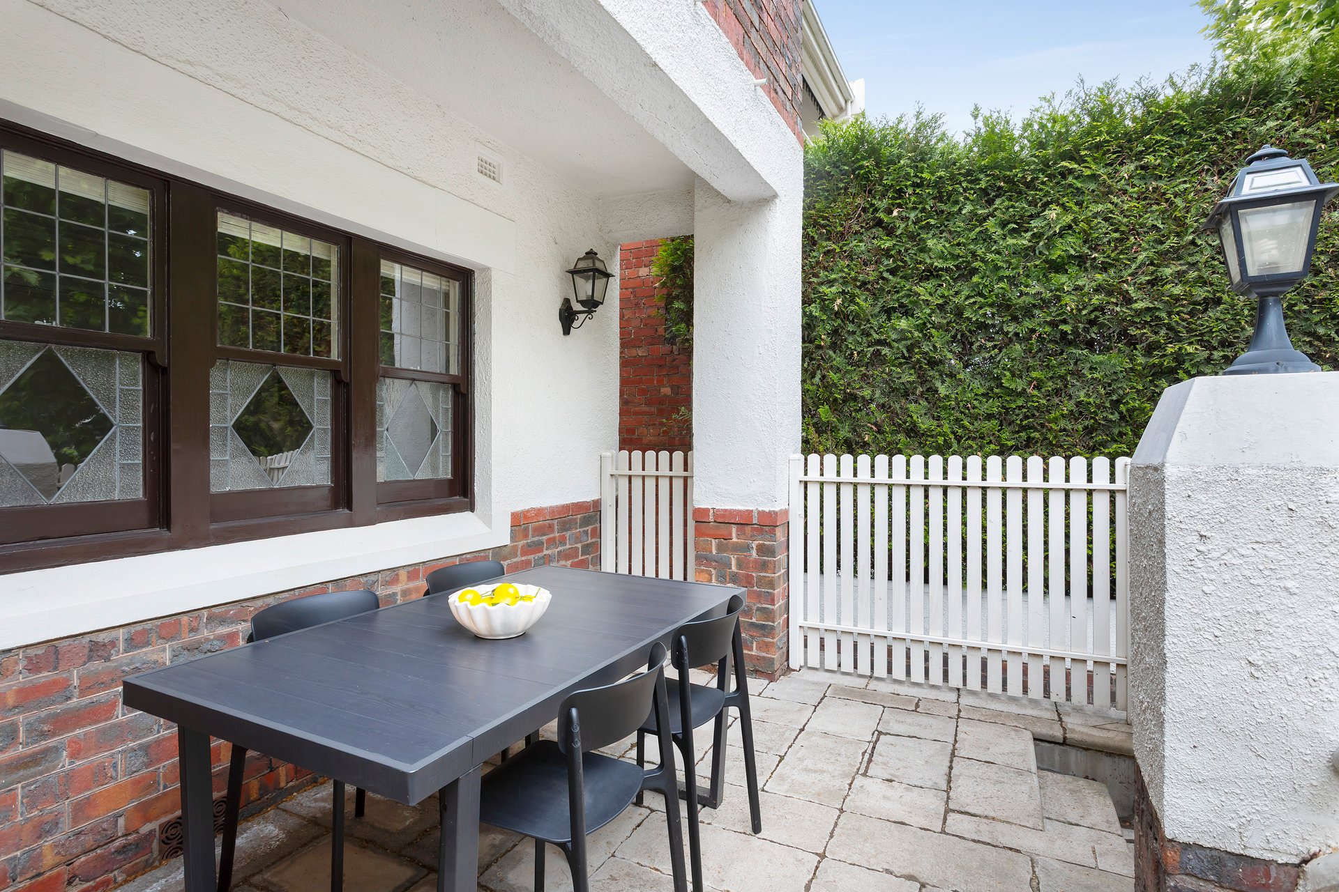 Original 1930s period features, including soaring ceilings and decorative detailing, showcase the home’s rich heritage, while tasteful modern touches enhance everyday comfort. The kitchen features stylish stone benchtops and splashbacks, blending modern functionality with classic charm. French doors open from the kitchen area to a private, sun-drenched front courtyard – a true highlight, ideal for entertaining or relaxing in a serene garden setting.