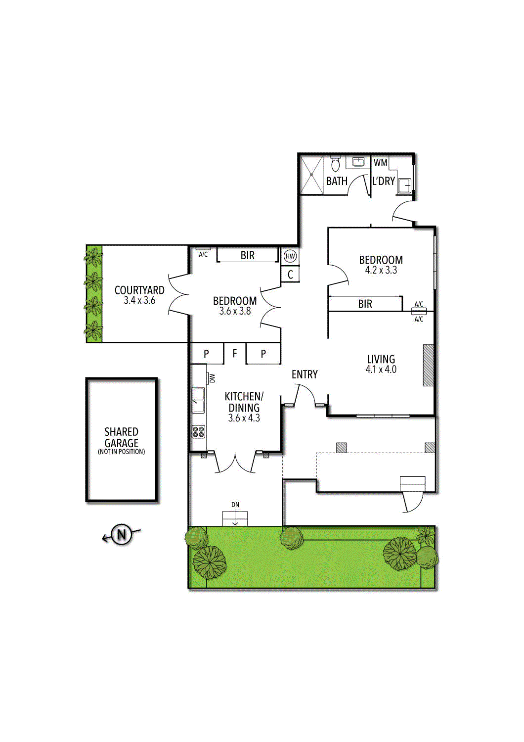 Two generous bedrooms are well-served by a central bathroom, and a second courtyard off one of the bedrooms offers a peaceful retreat or space to enjoy your morning coffee. Two separate storage facilities provide exceptional practicality, while a secure lock-up garage adds further appeal – a rare and valuable inclusion in this tightly held location.