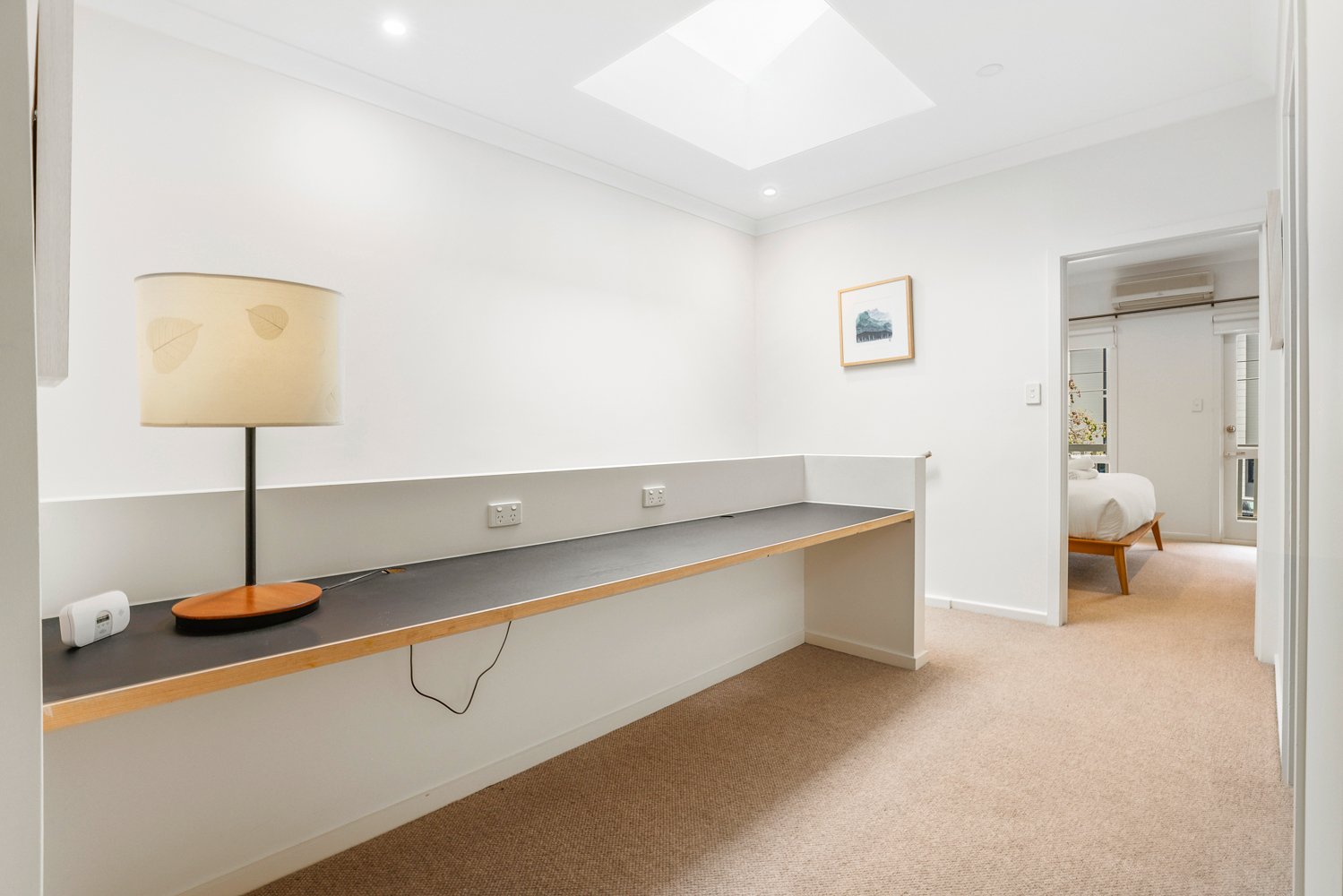 Spacious open-plan living and dining zones flow across timber floors to a beautifully appointed stone kitchen with walk-in pantry, stainless steel appliances and a bespoke servery window — ideal for indoor-outdoor entertaining. Step outside to a leafy courtyard oasis with laneway access, secure parking and a hidden garden shed.
