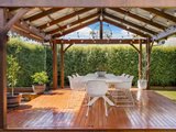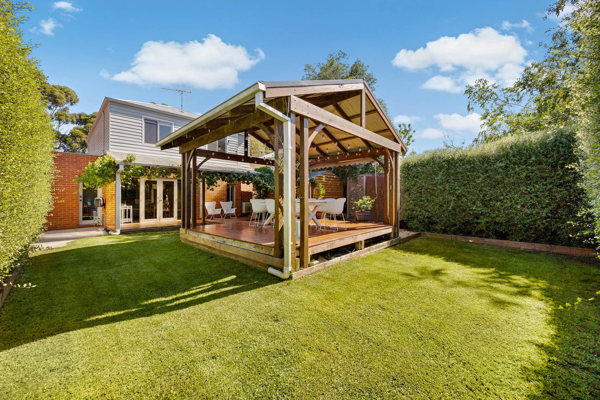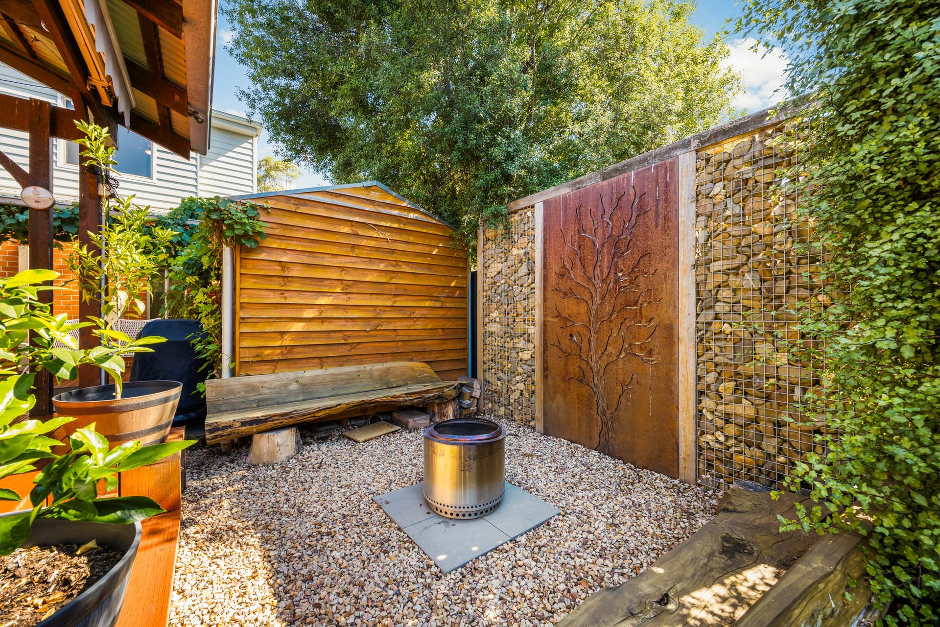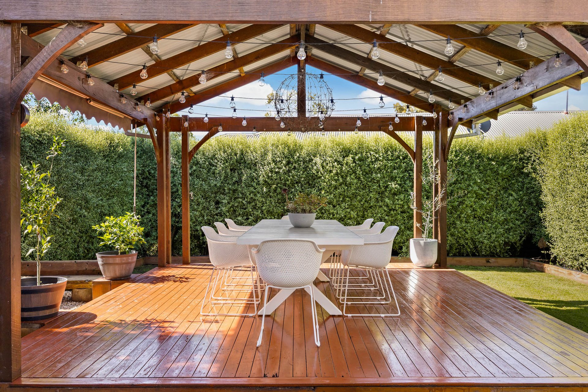 Dining and family zones spill to an Instagram-worthy rear yard, a truly private oasis anchored by a trellised grapevine arbour and rich decking to a covered entertaining deck. Trim lawns and mature Lilly Pilly hedging form a magical gardenscape, while a fire-pit area with rustic seating and gabion baskets elevates backyard bliss.