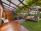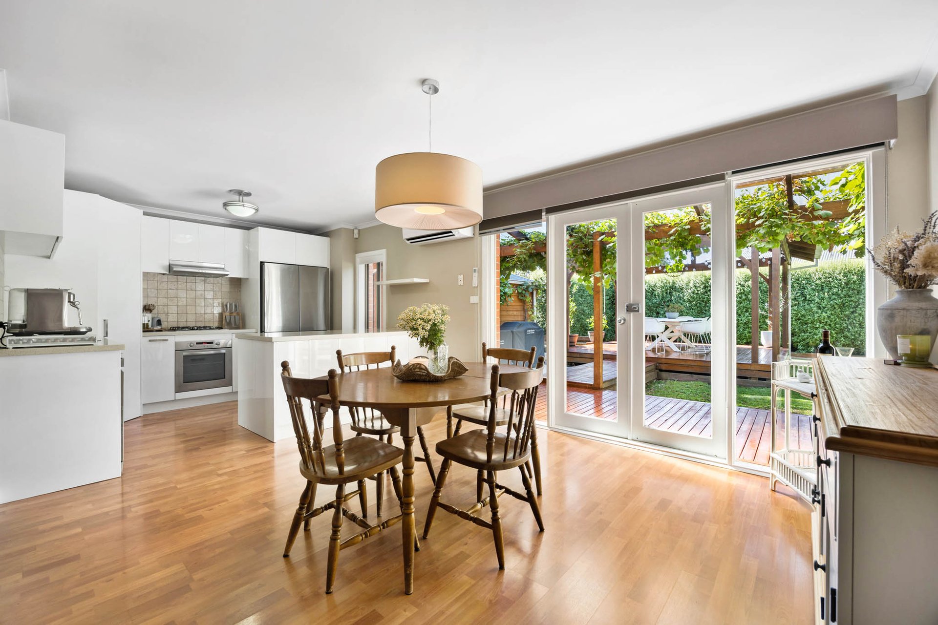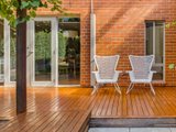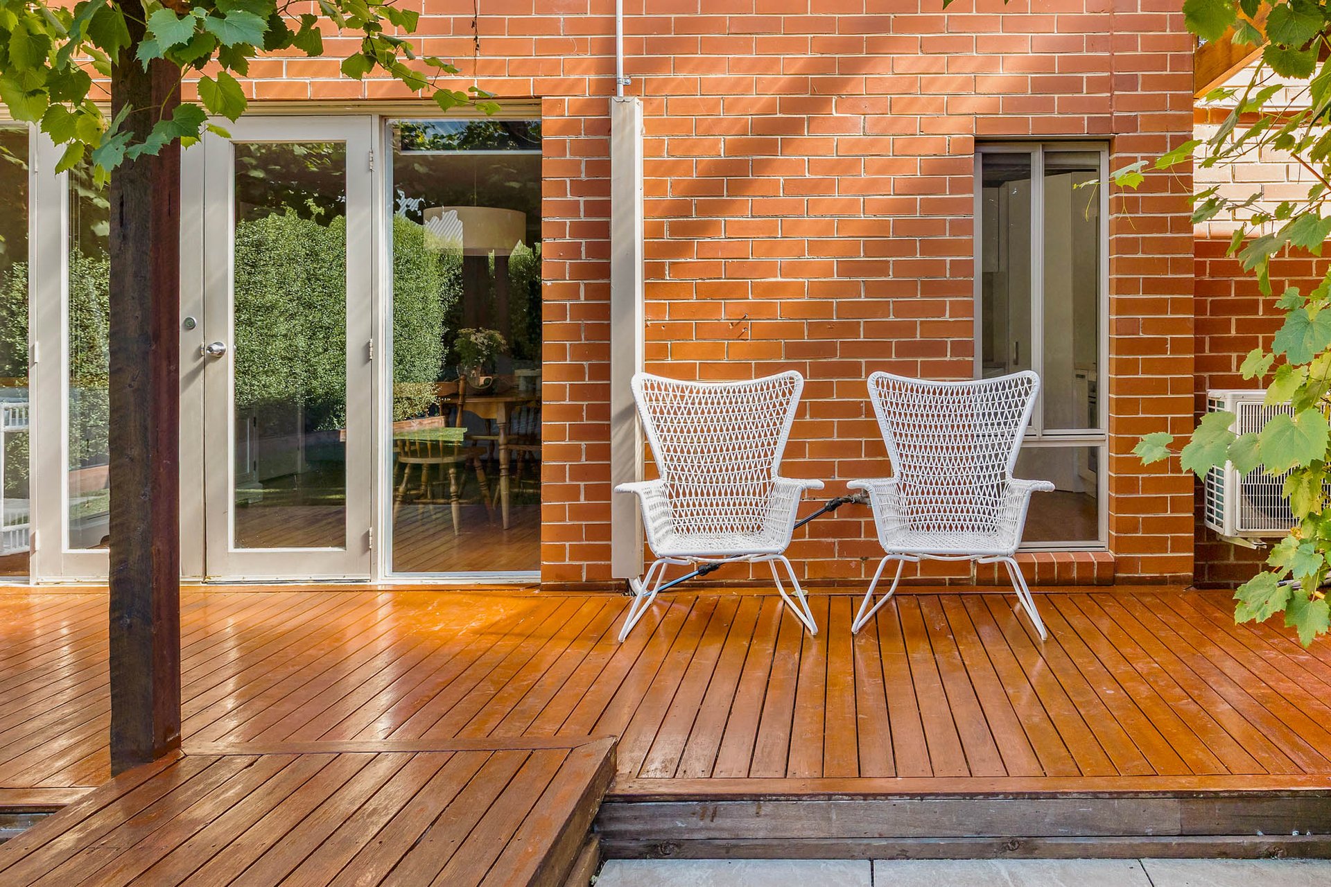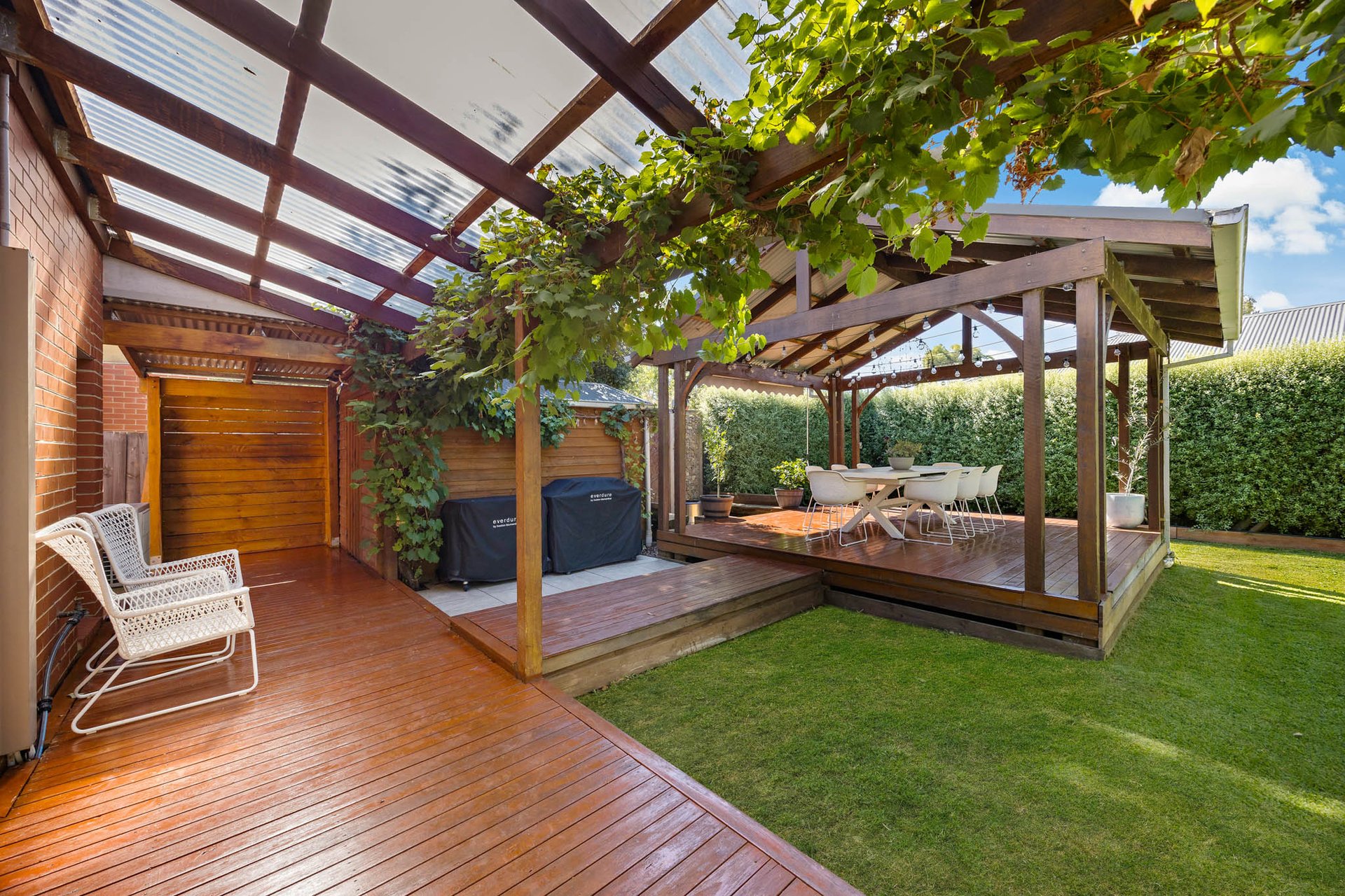 Dining and family zones spill to an Instagram-worthy rear yard, a truly private oasis anchored by a trellised grapevine arbour and rich decking to a covered entertaining deck. Trim lawns and mature Lilly Pilly hedging form a magical gardenscape, while a fire-pit area with rustic seating and gabion baskets elevates backyard bliss.