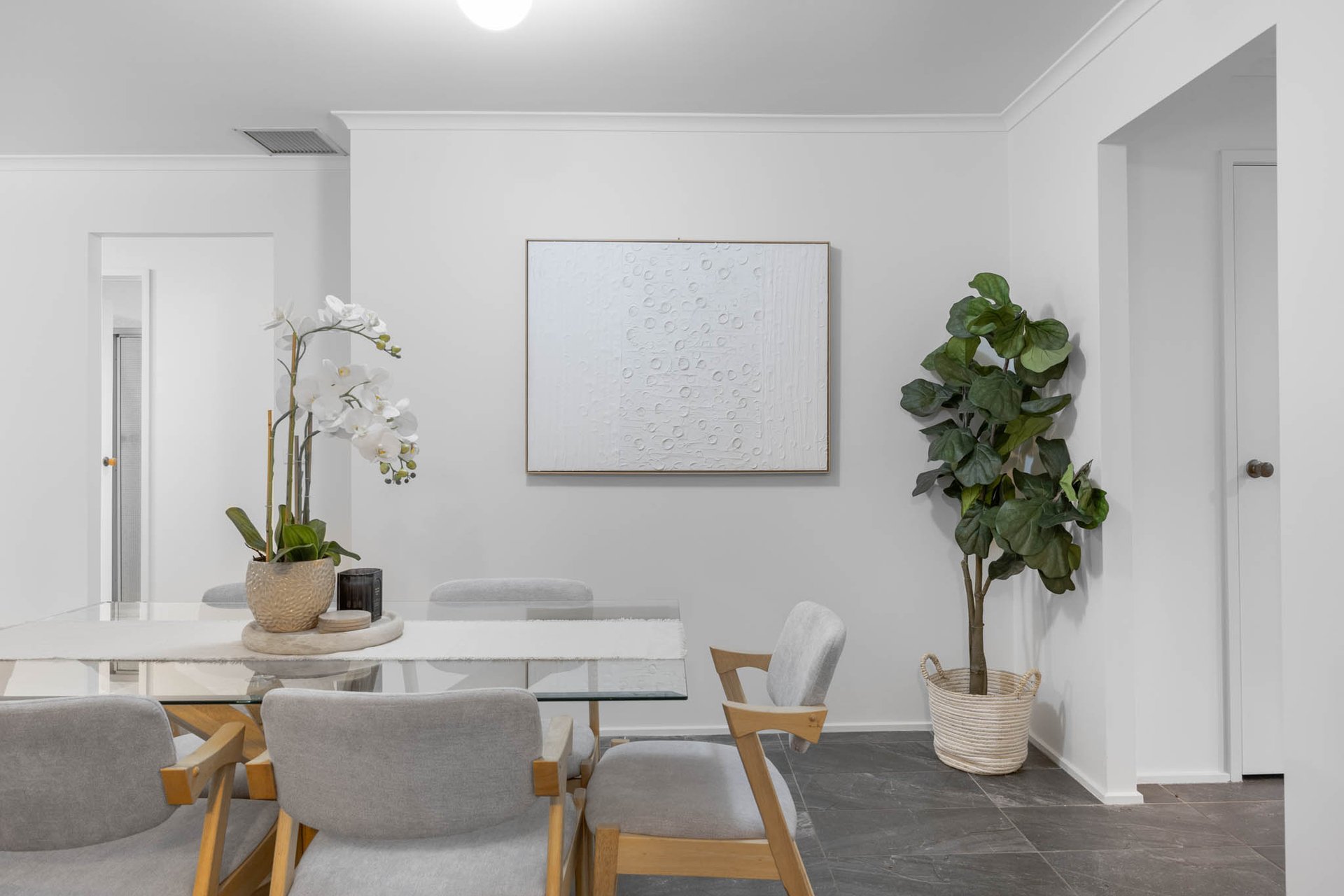 New flooring introduces a welcoming lounge before the plan opens to generous dining and living zones anchored by a wood-fuelled heater. The kitchen is superbly scaled for everyday rhythm and weekend gatherings alike, offering extensive bench space, a wall oven/grill, 4-zone cooktop, and a dishwasher. Seamless connection to a covered outdoor entertaining area promotes easy alfresco living, stepping to the peaceful rear yard with a lush lawn and mature thickset hedging.