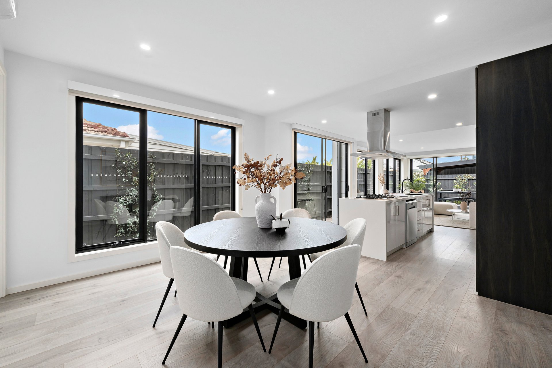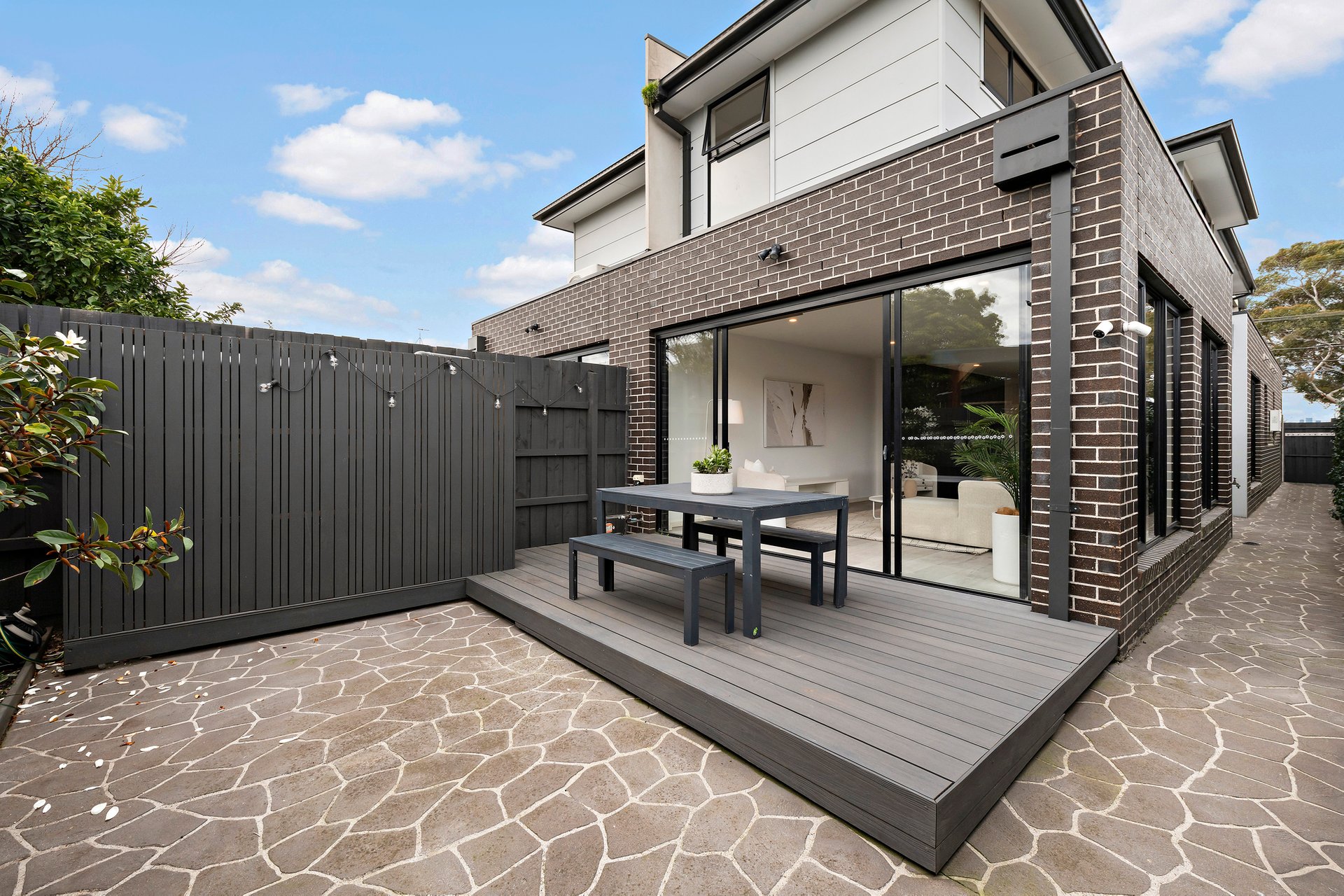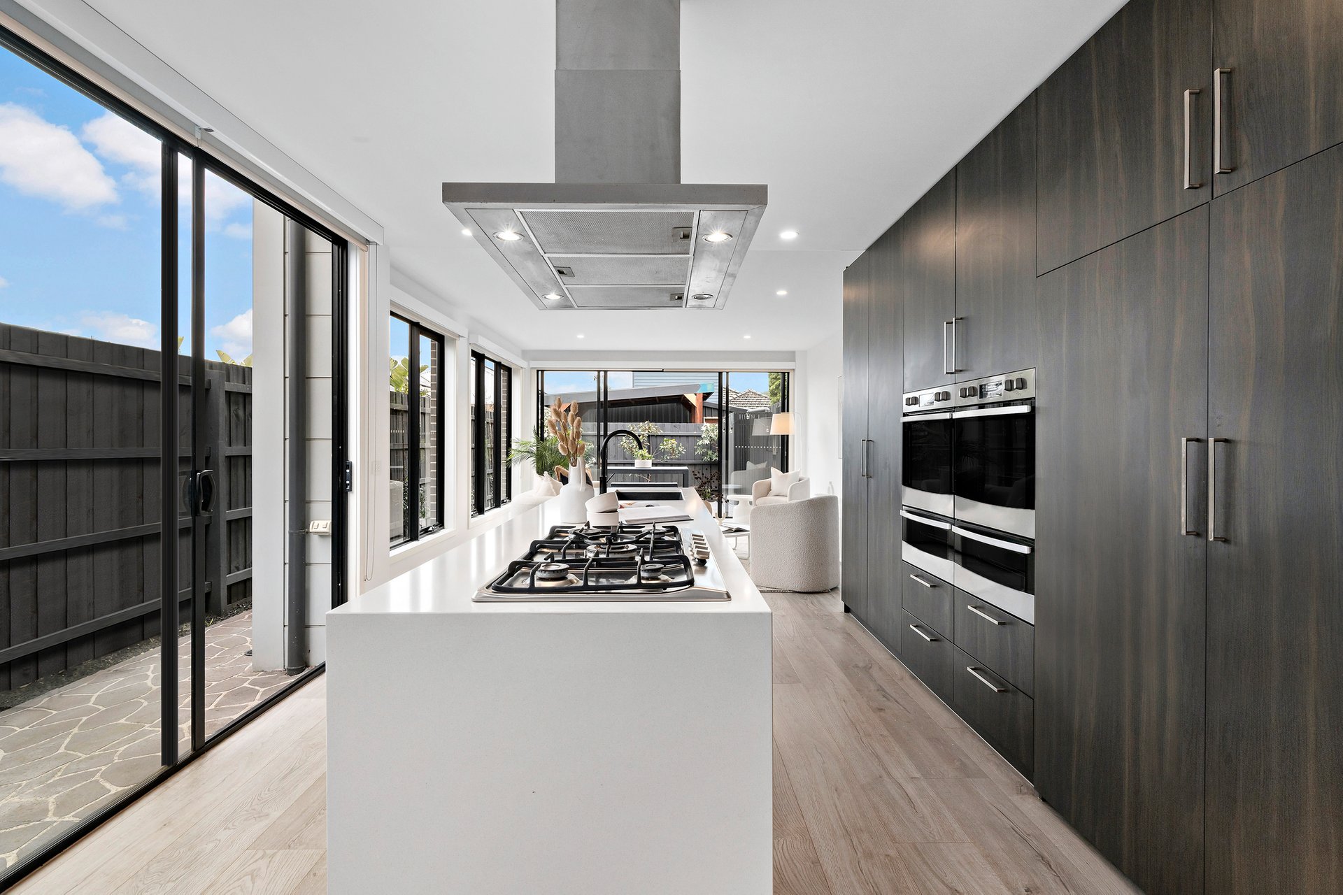 At the heart of the home, sun-drenched open-plan living and dining zones create a welcoming family hub, flanked by a stylish, stone-topped kitchen equipped with excellent storage and quality appliances, including twin wall ovens. Whether gathering for family meals or entertaining friends, the space is designed for ease and comfort. Sliding doors open to a large deck and paved wraparound courtyard, delivering seamless indoor-outdoor flow and a low-maintenance alfresco setting perfect for relaxed entertaining year-round.