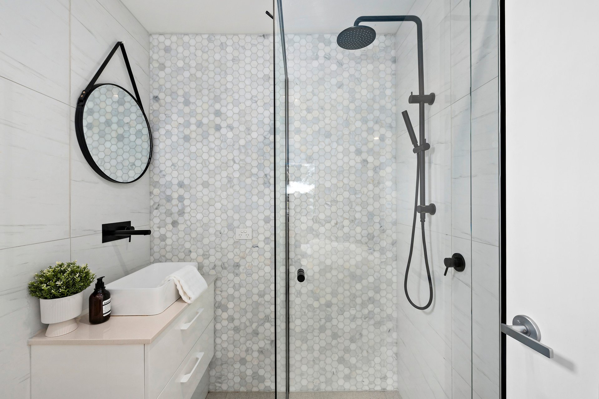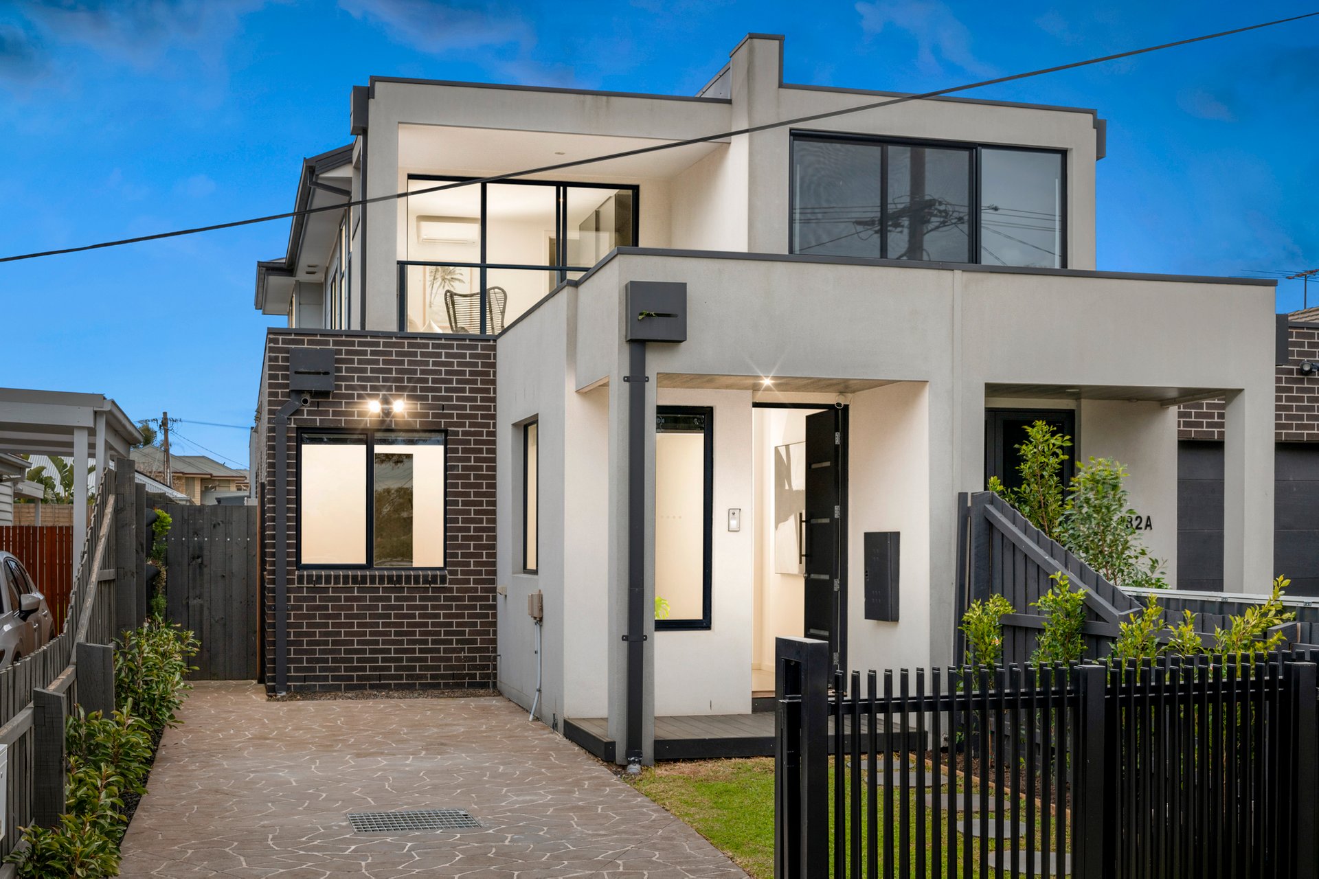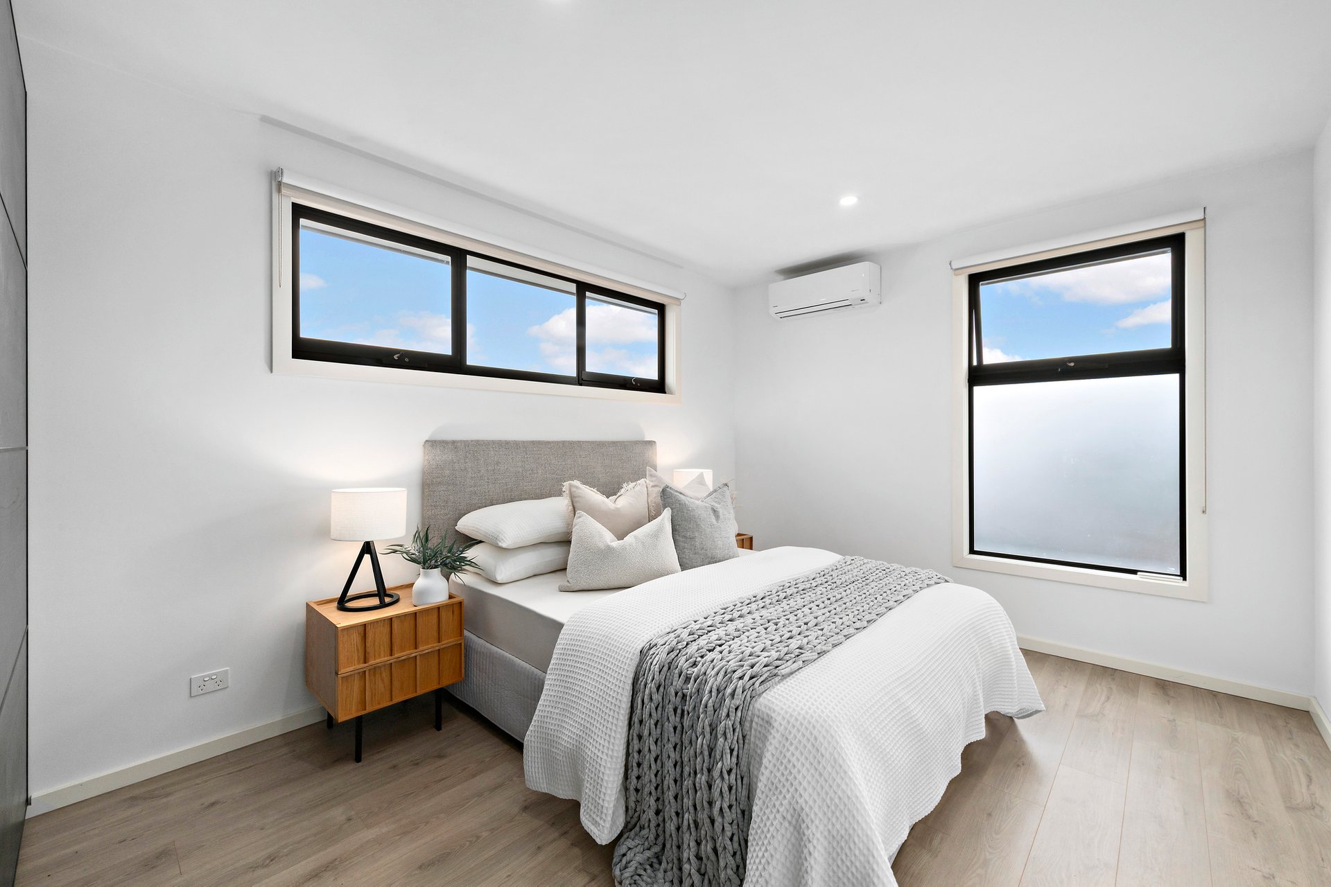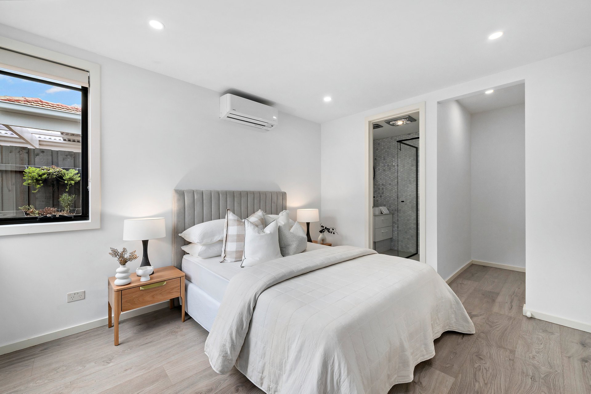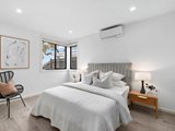 The main bathroom is conveniently positioned on the upper level and delivers everyday luxury with floor-to-ceiling tiling, chic black tapware to match the ensuites, a double vanity, a deep bathtub and a rainfall shower. A neat laundry and guest toilet complete the floorplan, while laminate timber floorboards throughout, split-system heating and cooling, and easy off-street driveway parking add further appeal.