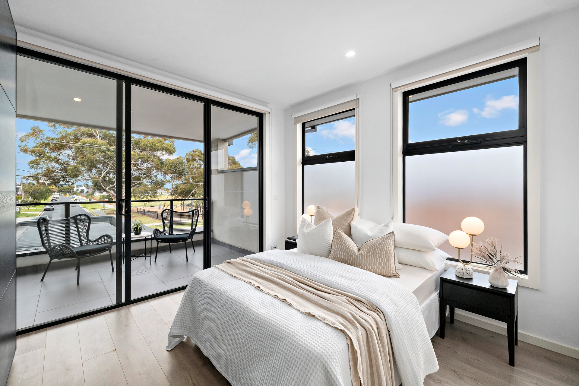 Each of the four bedrooms has something special to offer. The large upstairs master retreat features a built-in robe and a private ensuite, while the downstairs master provides outstanding flexibility with its own ensuite and walk-in robe—ideal for guests, extended family or multi-generational living. The two additional bedrooms are equally impressive, with one offering an in-built desk and twin built-in robes, and the other enhanced by a built-in robe and a large, covered balcony overlooking Angliss Reserve. The elevated outlook is especially beautiful in the evenings, when the park lights glow and bathe the reserve in a warm, comforting ambience.