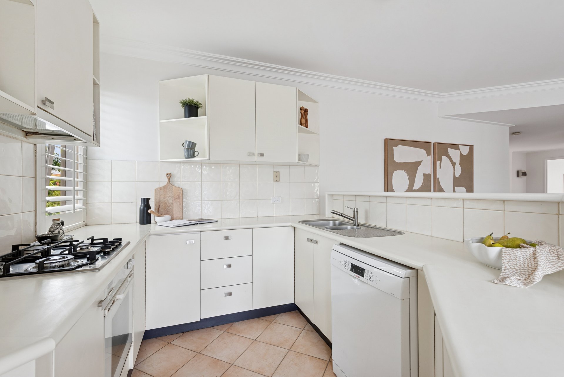 The spacious living and dining area opens to a good-sized balcony that captures a treetop perspective. Plantation shutters frame the outlook, allowing you to open the louvres and enjoy a green canopy and softly filtered sunshine. The kitchen occupies one corner, featuring a gas cooktop, dishwasher and ample bench space in a practical layout that connects seamlessly with the living area.