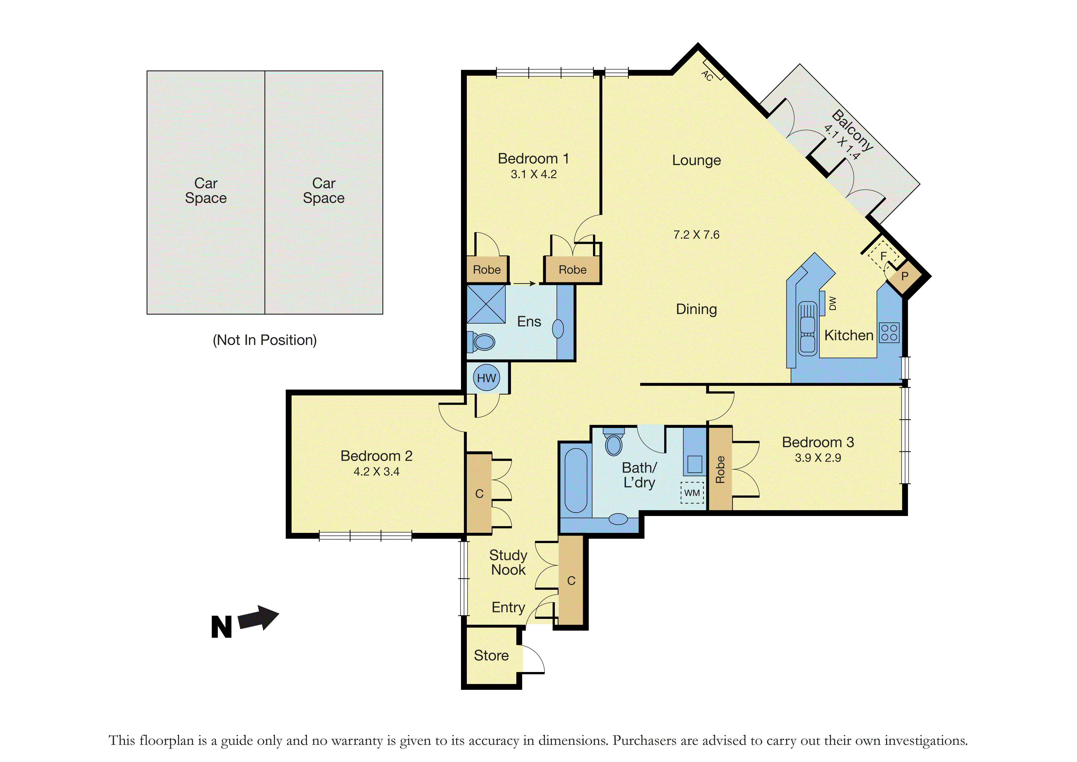 The main bedroom includes built-in robes and a private ensuite. Two additional bedrooms are serviced by a central bathroom with bath, shower, and integrated laundry, offering flexibility for family living, guests, or a home office. A study nook sits just inside the entry, set apart from the living spaces and ideal for working from home.