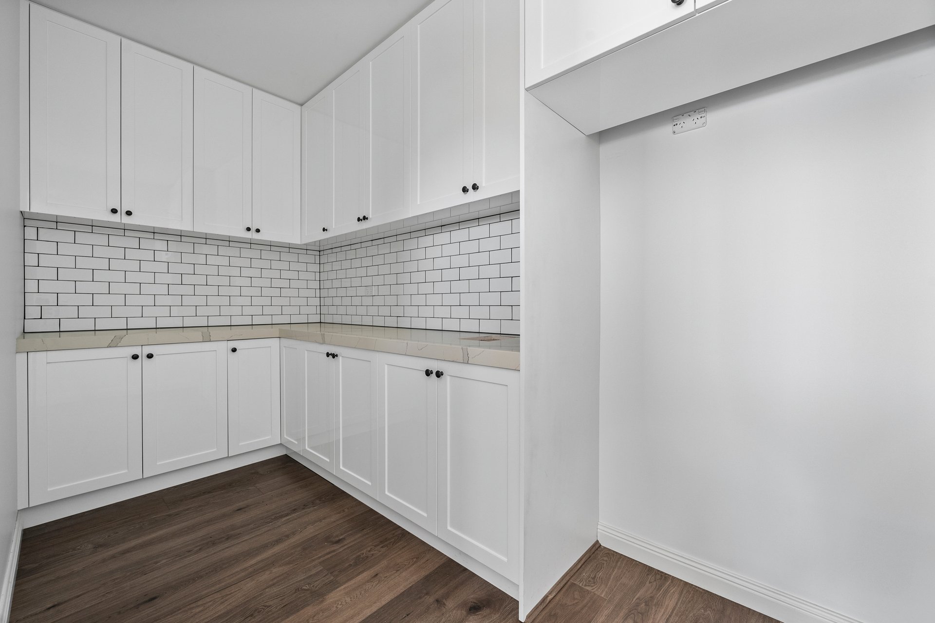 The ground floor introduces a light-filled living area and guest bedroom with built-in robe, serviced by a full bathroom and separate laundry. The generous open-plan kitchen, dining and family domain forms the true heart of the home, featuring stone benchtops, an Ilve 900 mm cooker, butler's pantry, soft-close cabinetry and abundant storage. Glass doors open to a screened alfresco porch, creating a seamless connection to the landscaped rear garden, ideal for year-round entertaining.