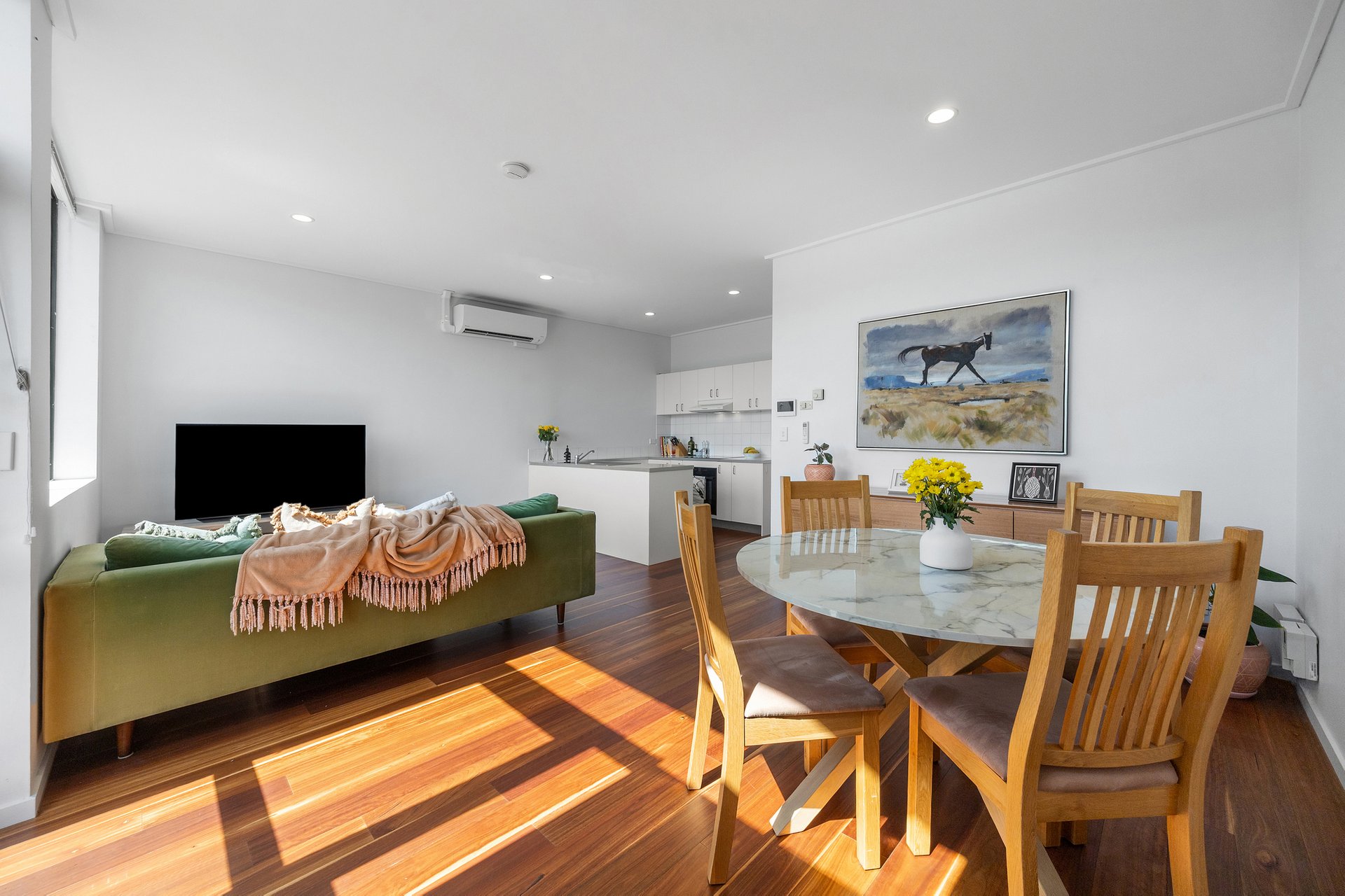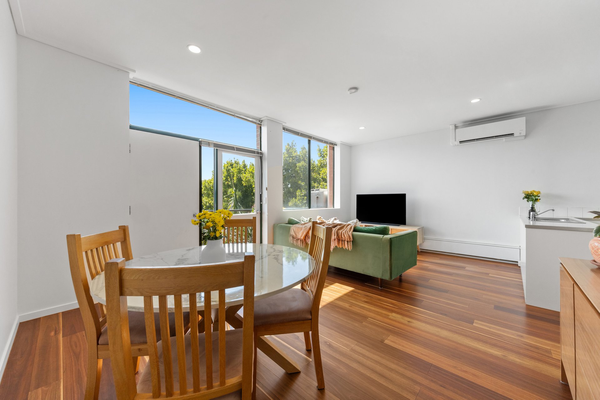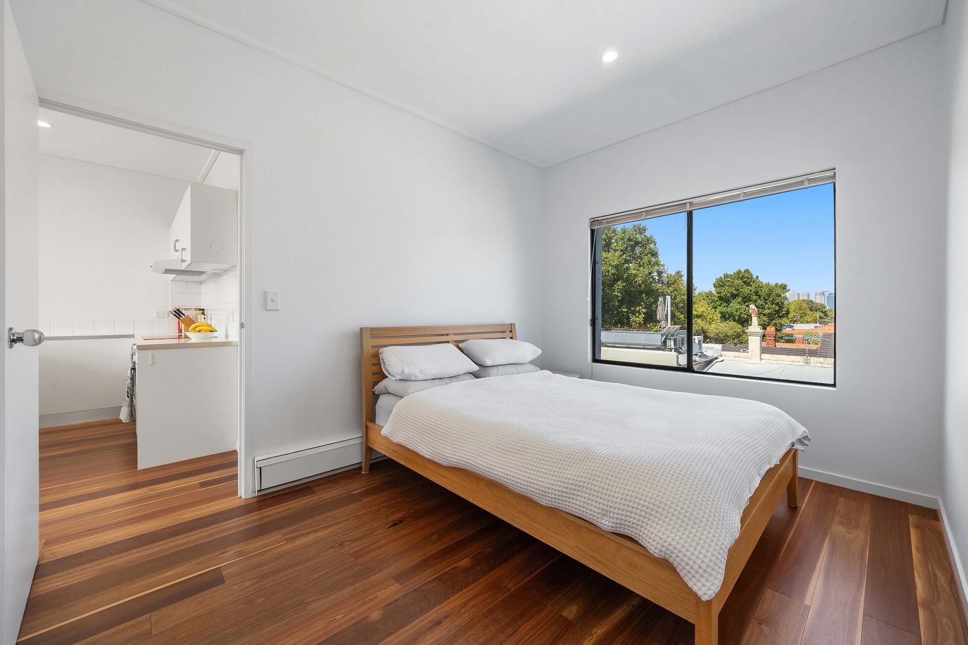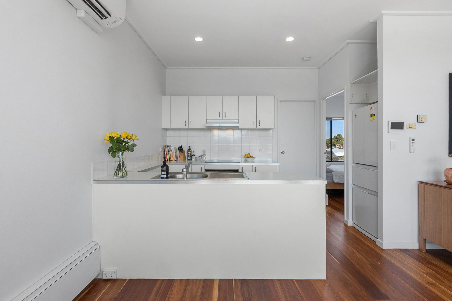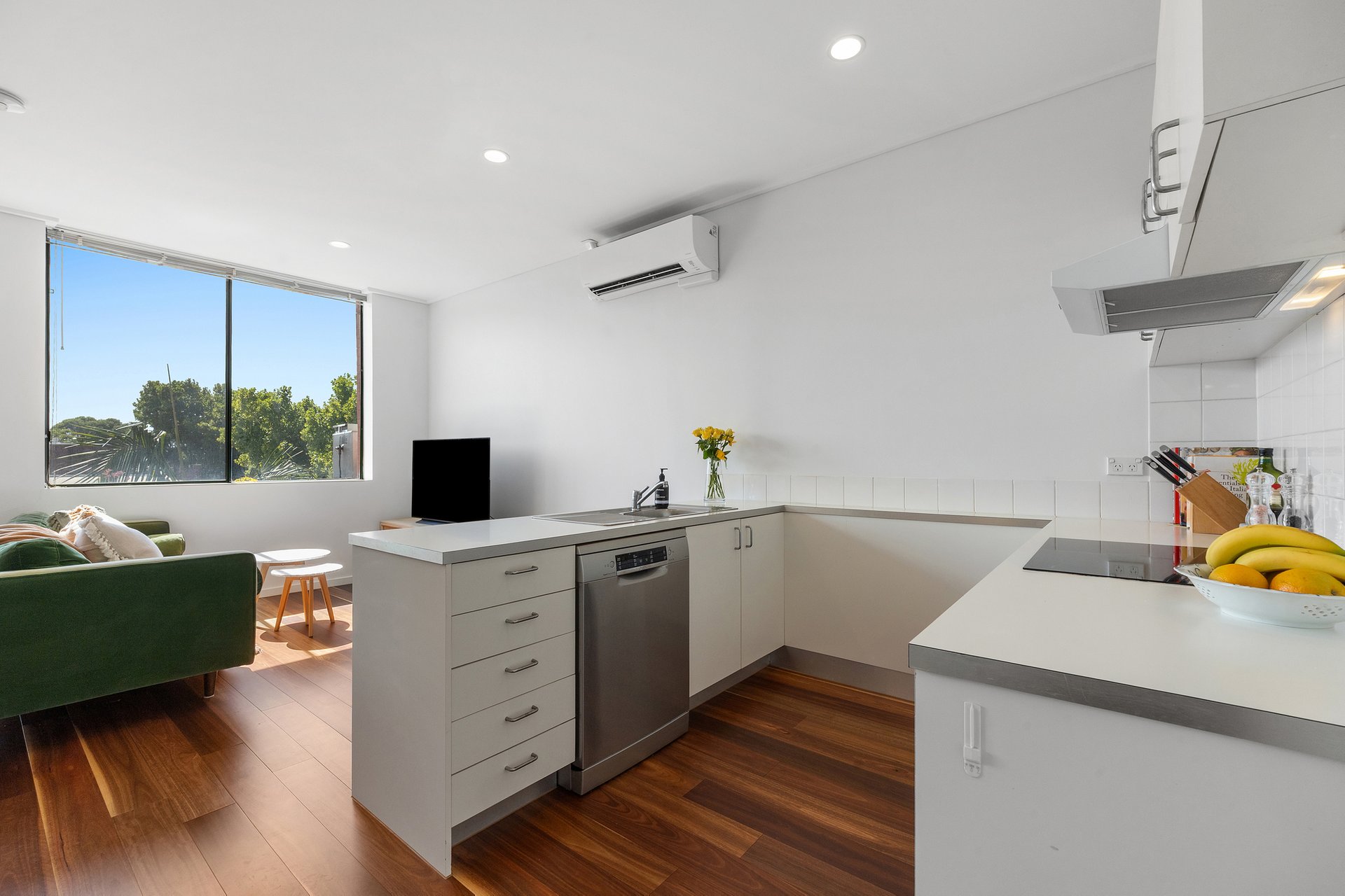 A generous open plan living area unfolds out to a sunny north-facing balcony perfect for alfresco dining and incorporates a bright kitchen appointed with recently updated induction cooktop, oven, and Bosch dishwasher. The sizeable bedroom benefits from breathtaking views of the CBD as well as built in robes, accompanied by a pristinely presented bathroom with laundry facilities.