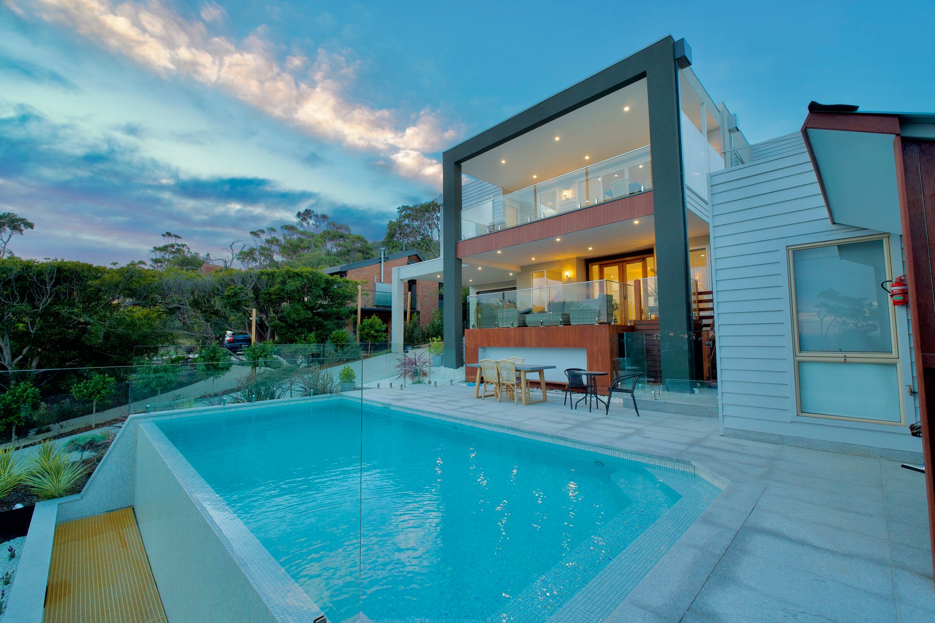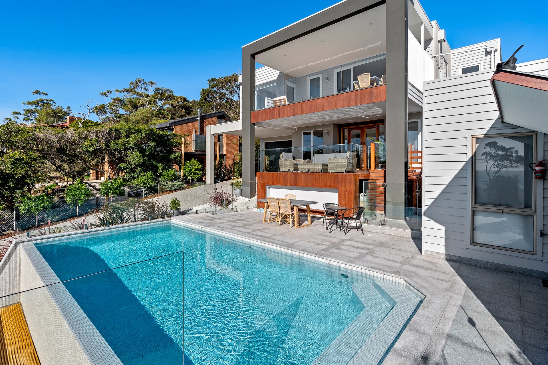 Step outside to discover your own resort-style sanctuary, where an infinity-edge pool seems to spill seamlessly into the bay beyond. A beautifully appointed pool house offers the perfect setting for summer entertaining or weekend relaxation, surrounded by low-maintenance gardens and lush coastal plantings.