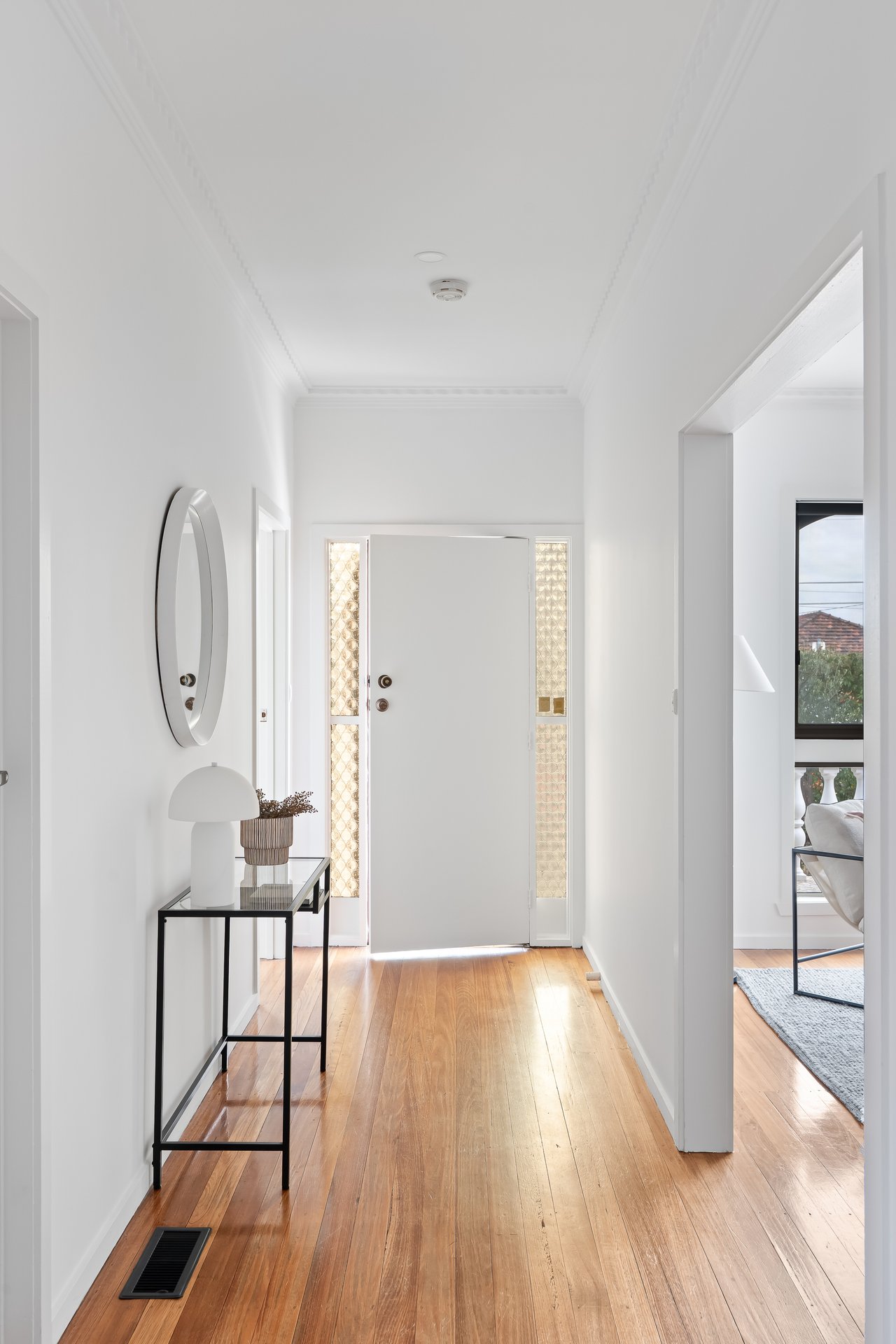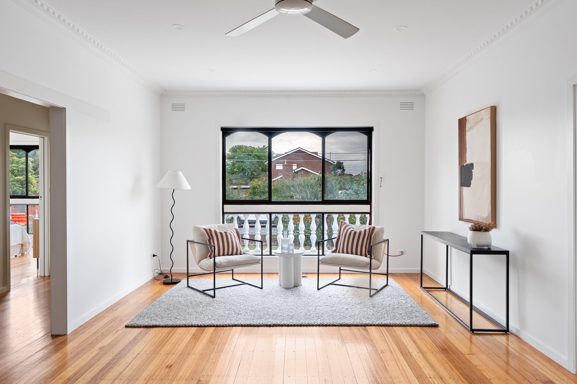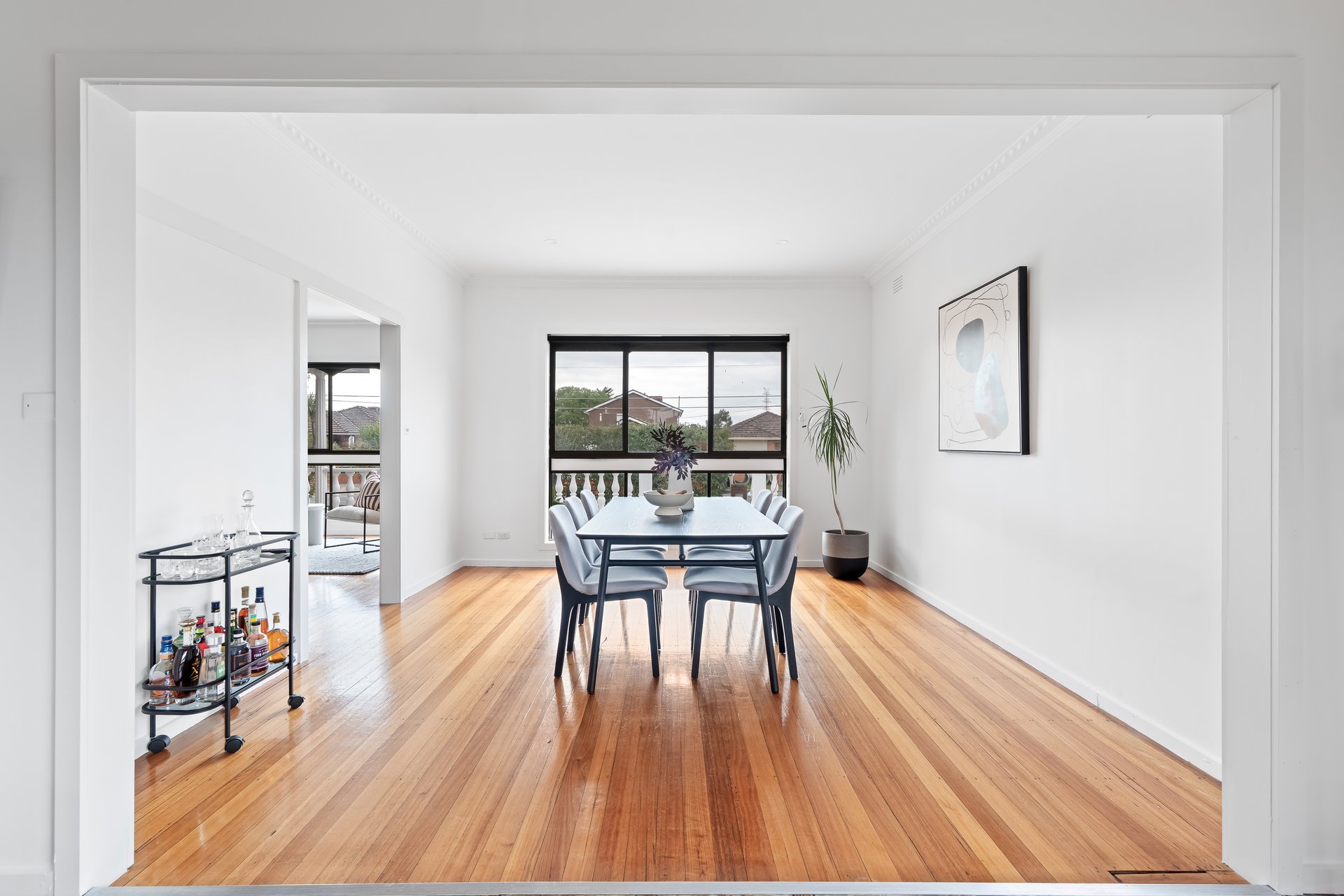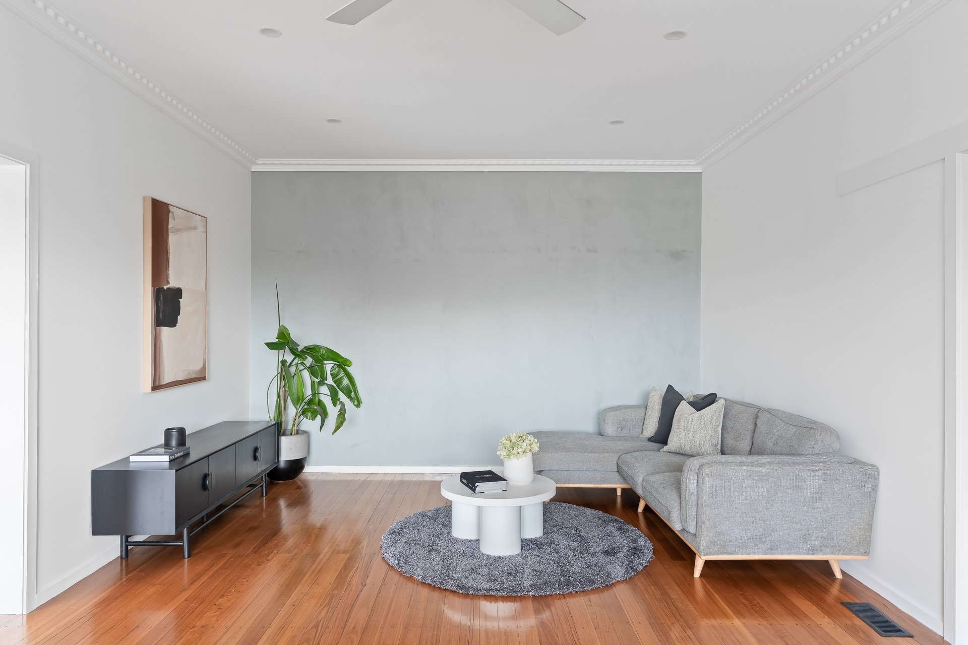 Held by the same family for over fifty years and showcasing quality craftsmanship in a streamlined floorplan, this immaculate home boasts light and space in spades. Huge windows illuminate versatile living spaces, with a formal living room overlooking a terrazzo lined porch, and spacious dining coming off an eat-in kitchen that features solid timber cabinetry and black glass Baumatic appliances.