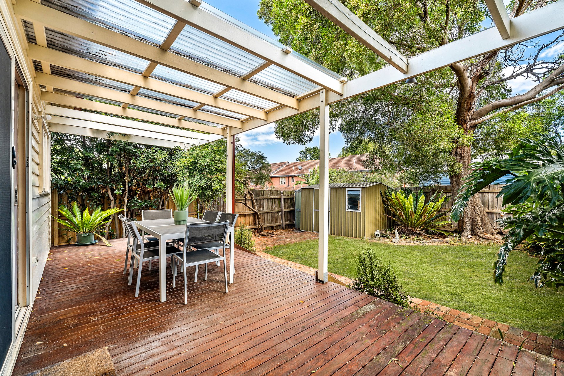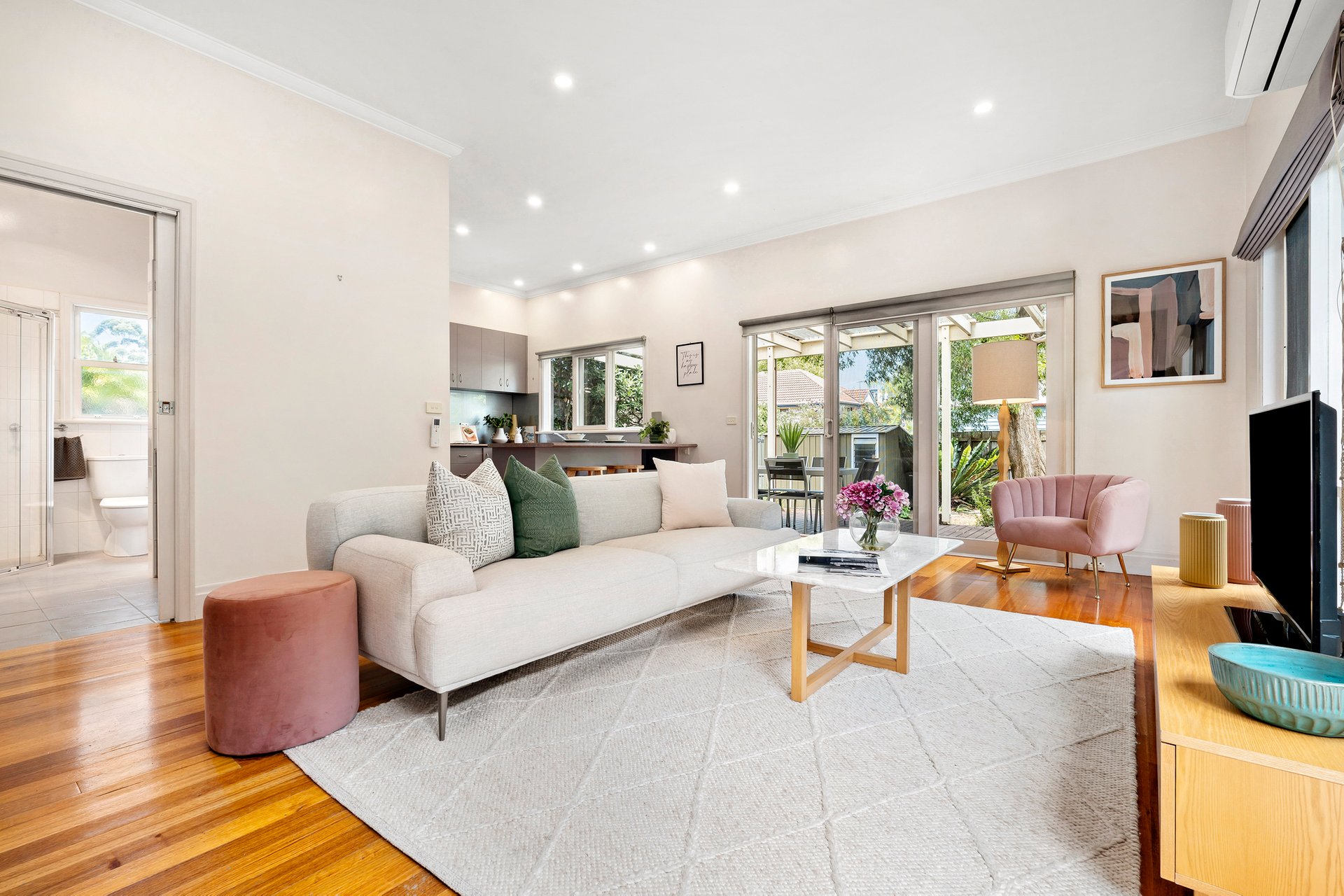 The private entry leads to three spacious bedrooms that share a bright modern and central bathroom. A dedicated dining room or second living space step down to the open plan family living zone and well equipped modern kitchen enjoying access to an elevated covered timber deck, perfect for lazy outdoor entertaining. A second bathroom provides added convenience and laundry space with additional features including central heating, split system air conditioning, off street parking and excellent rear access.