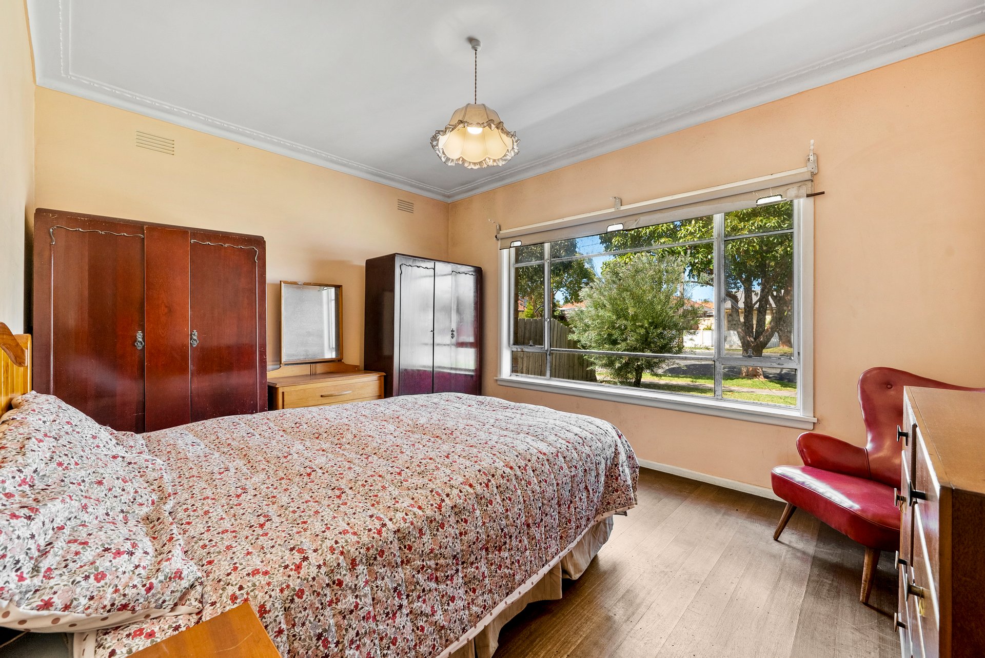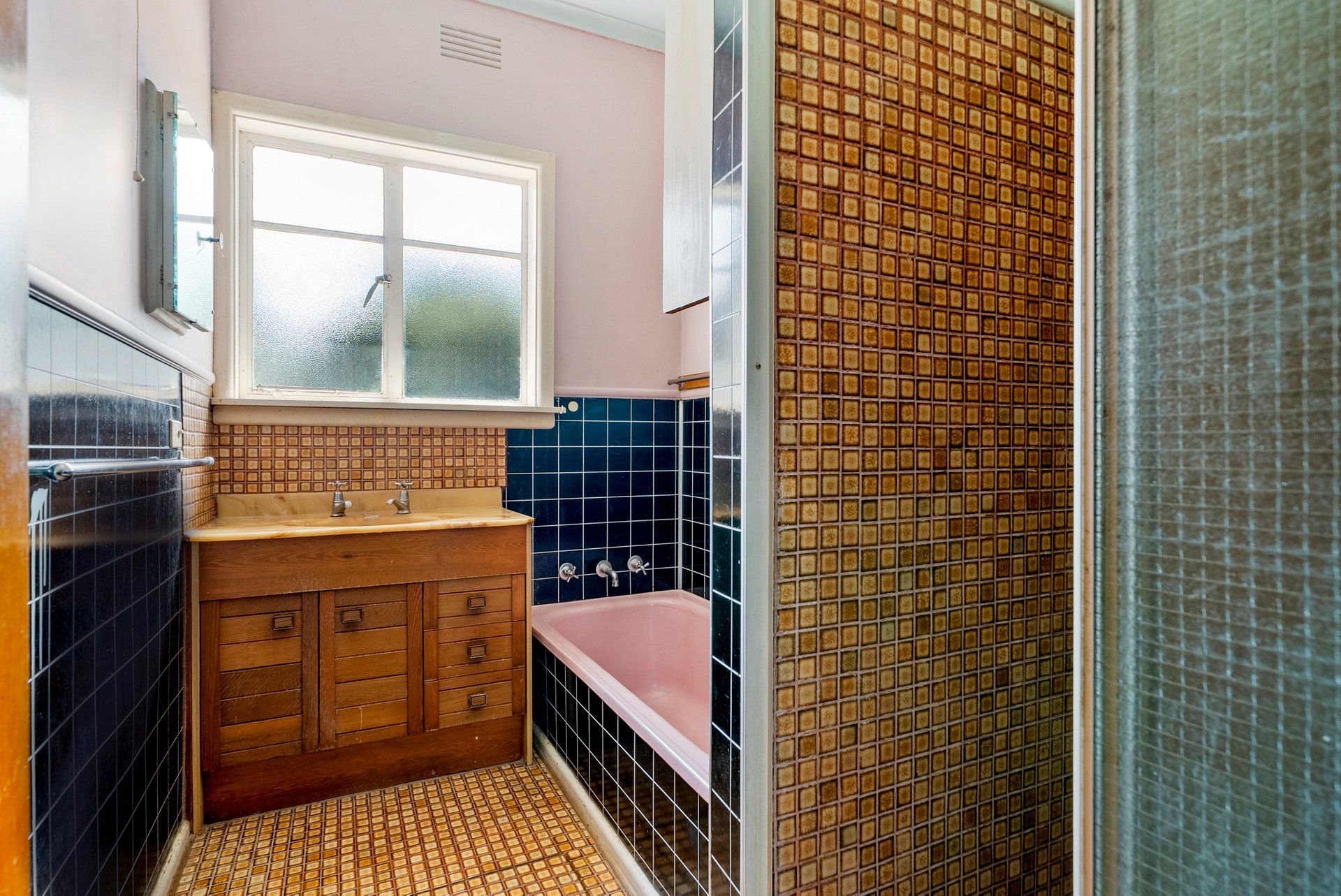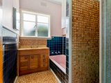 Three bedrooms are all well-sized with wooden floors beneath the 1960s carpet tiles, each capturing different natural light - from street-facing brightness to leafy backyard views. The bathroom showcases the home’s mid-century charm with retro tiles, a bathtub, shower, and vanity.