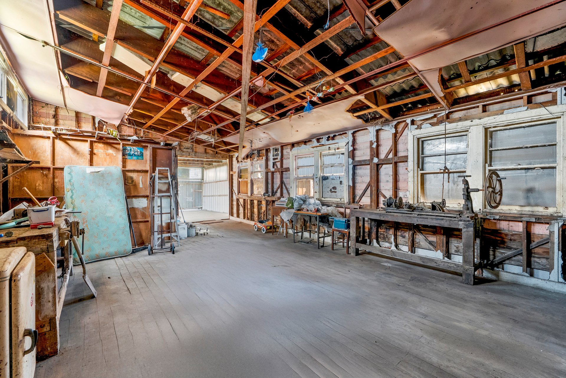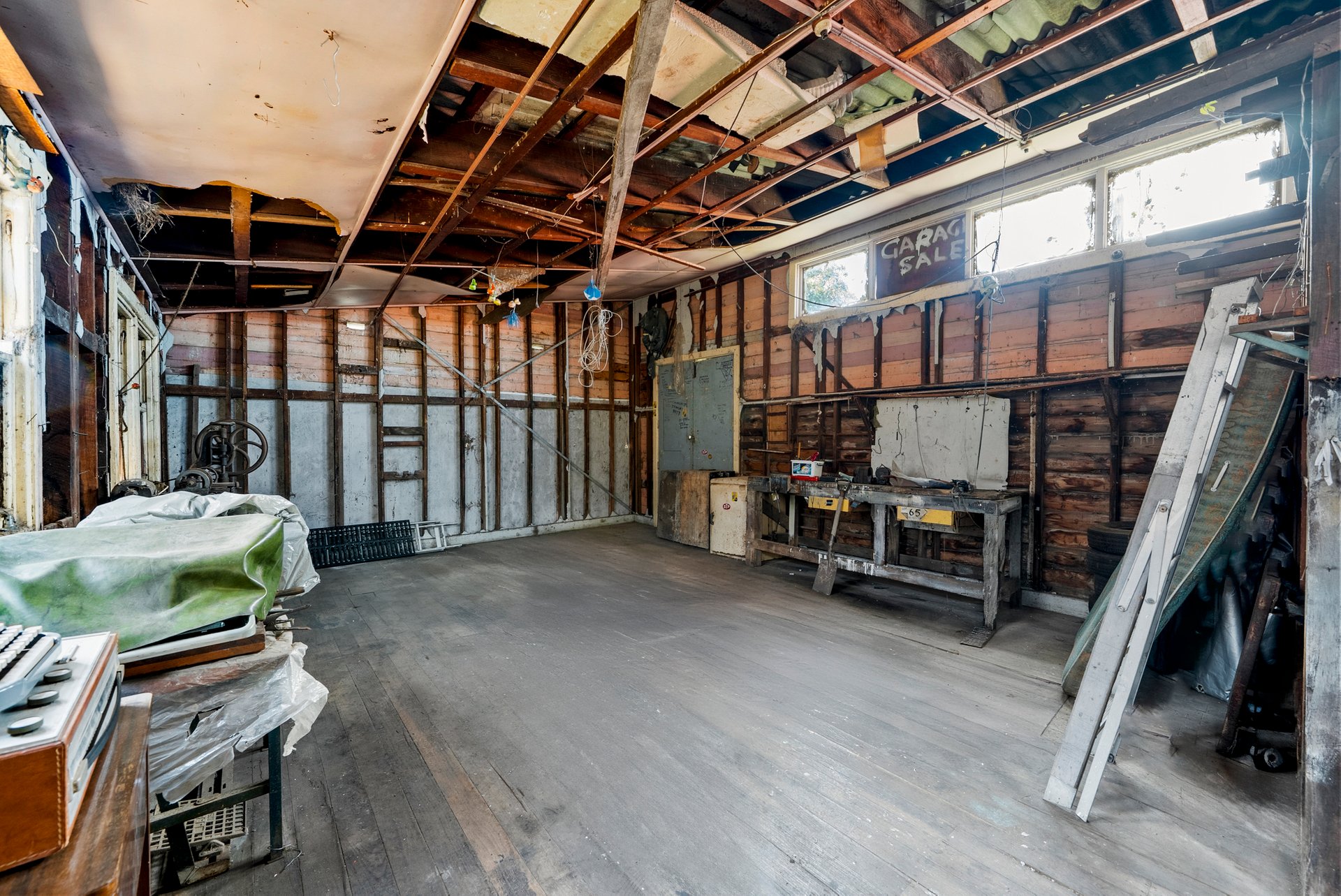 Additional highlights include a massive garage with original timber walls and hand-cranked machinery, plus an expansive layout ready for creative transformation.