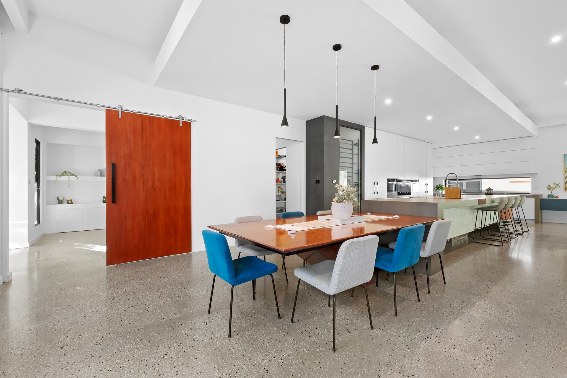 Make your way to a fantastic home cinema room with comfy armchairs, alongside a home office perfect for those working remotely. At its heart, the enormous open plan family room and dining zone overlooks a sublime kitchen with a 5-metre stone island breakfast bar enhanced with an attached Red Gum dining table at one end, a full suite of high-end appliances, a built-in wine cabinet, walk-in pantry and a fully-equipped butler’s pantry with another fridge/oven/dishwasher.