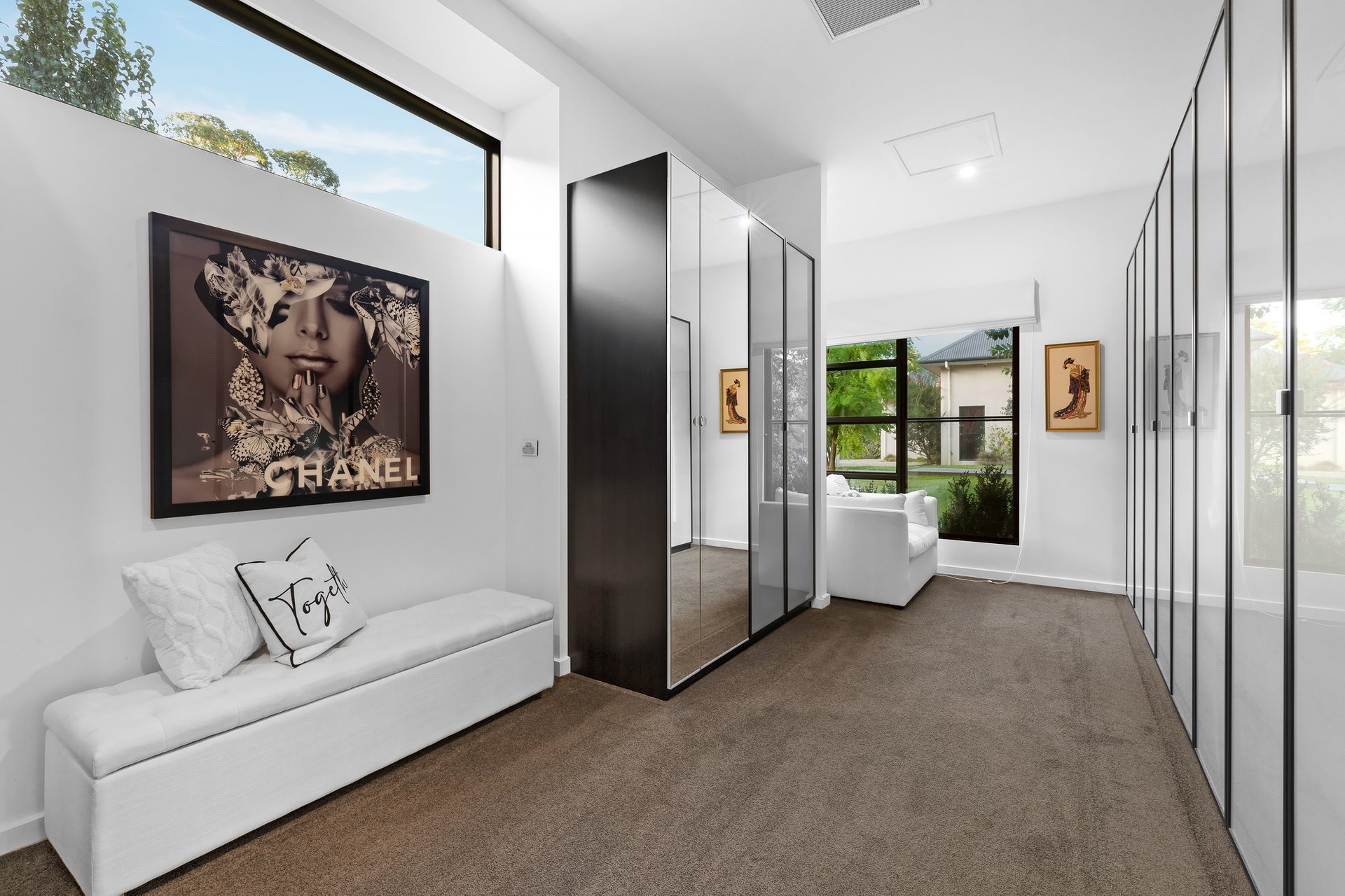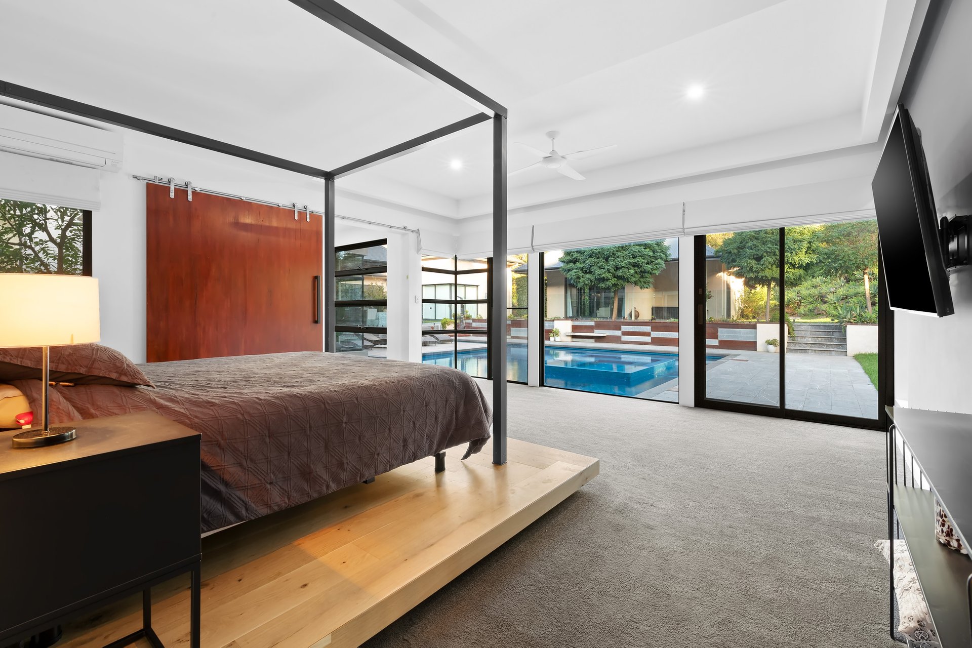 Turn to your right and find an elegant lounge room with garden views and a cosy fireplace, leading to the sumptuous master suite that enjoys poolside views, a custom floating bed, a decadently large dressing room with unlimited storage and a luxe ensuite featuring a freestanding bathtub, timed/heated towel rails and a dual basin vanity.
