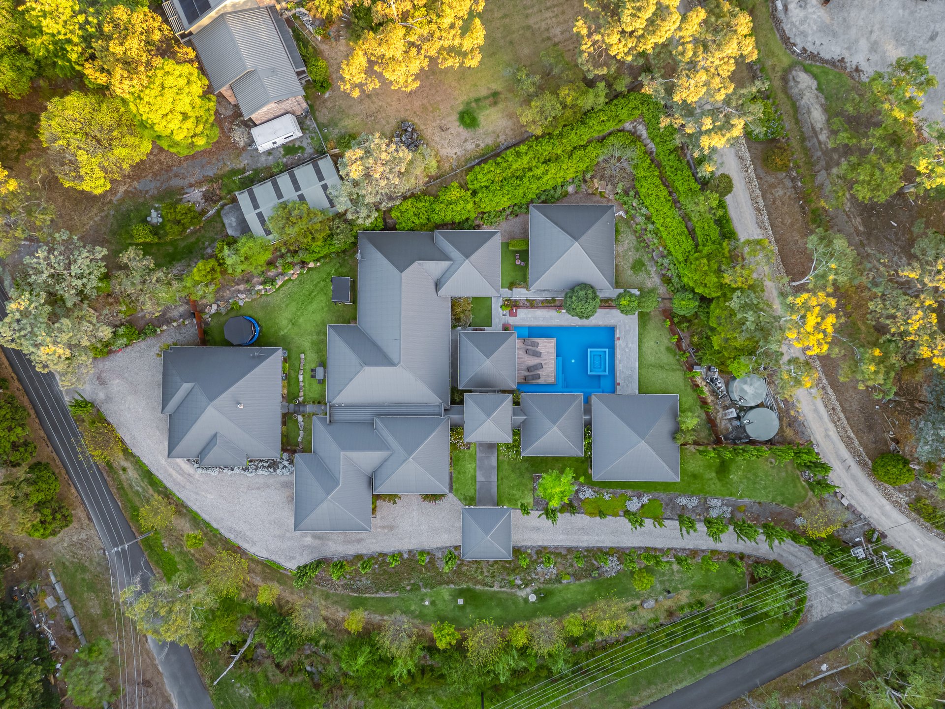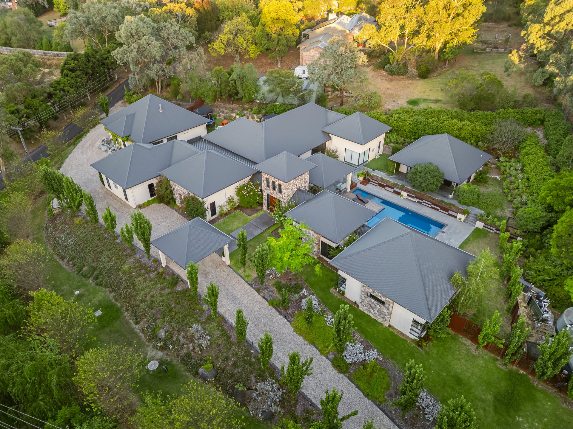 An extensive list of features includes geothermal heating and cooling, polished concrete flooring, split system air conditioning, energy-efficient DC ceiling fans, 70,000L water tank, outdoor shower, woodfire (garage), heated towel rails to all bathrooms, laundry and utility/drying room, a versatile garden studio/gym/6th bedroom with a stylish bathroom and laundry, double garage and access from Vincent Road to a 5-car garage.